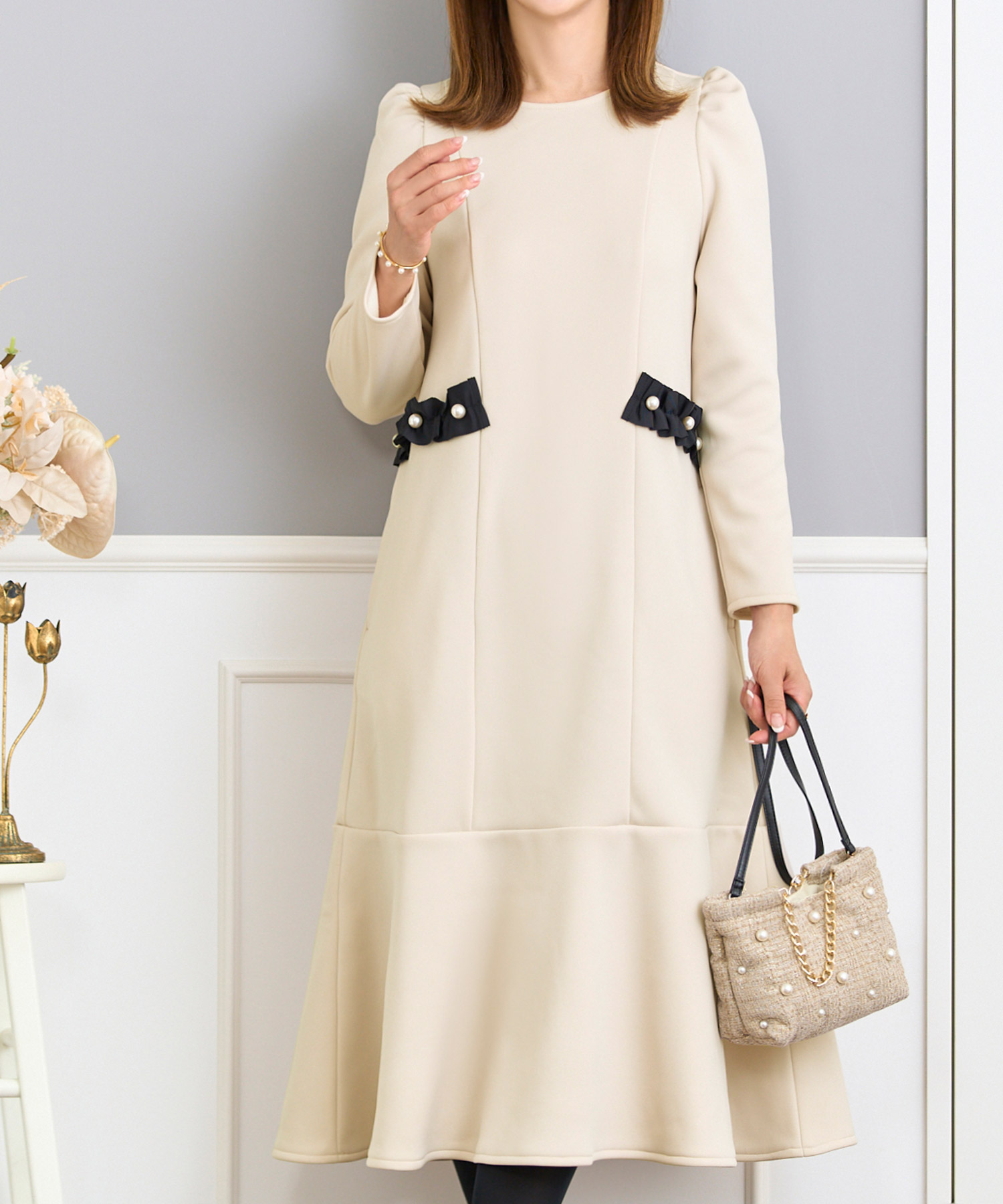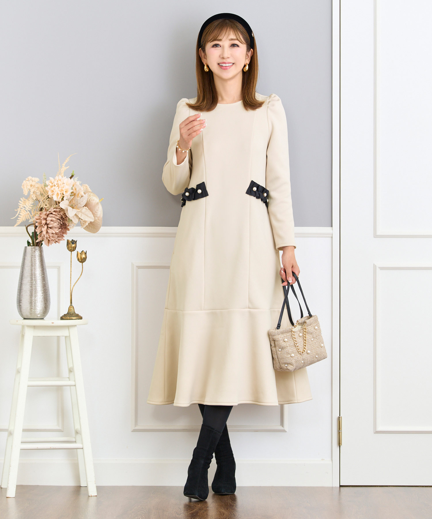 寒い地域への冬旅行におすすめの裏起毛ワンピース。リラクシーな着心地と美しいシルエットで、つい何度も着たくなるデザインです。グログランリボンとパールをあしらった華やかなディテールが魅力で、旅行中のディナーやちょっとしたパーティにも対応可能。防寒性とおしゃれを両立したこのワンピースがあれば、冬のお出かけがもっと快適に!シーンを問わず活躍する一着です。
