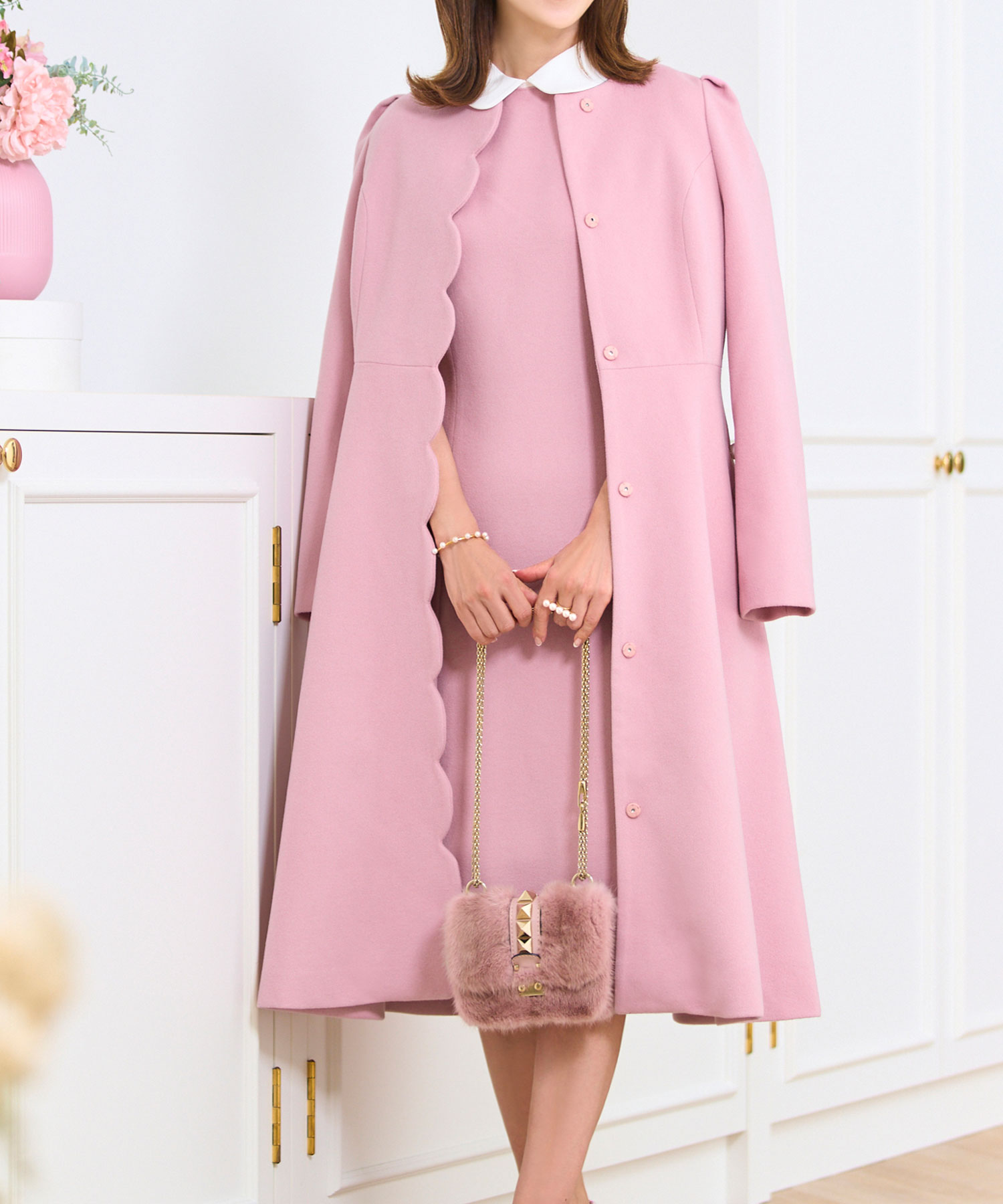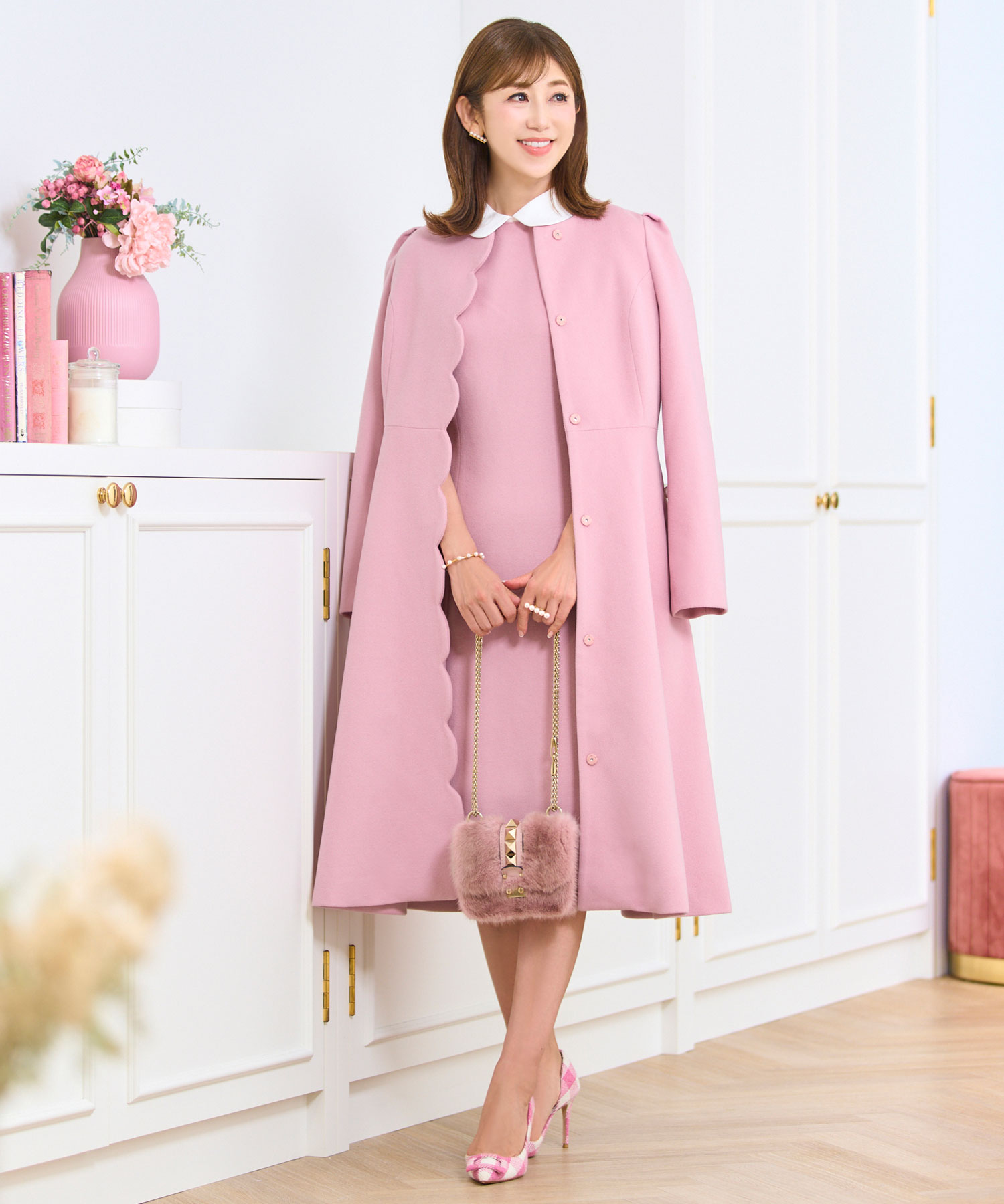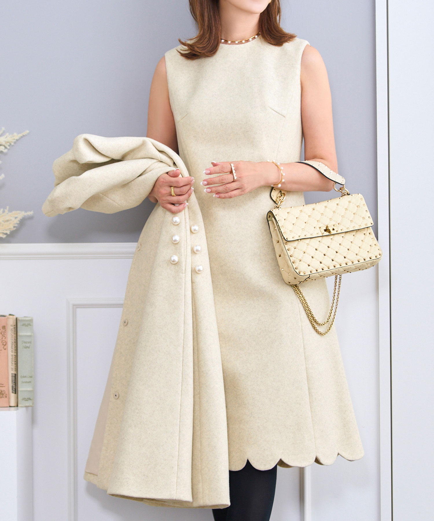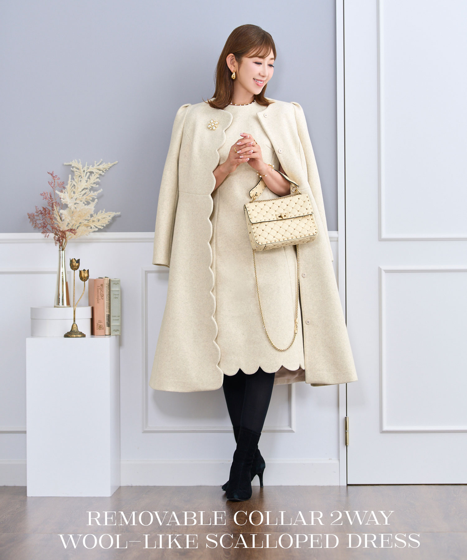 冬のレストランでの忘年会や食事会にぴったりな、上品なウールタッチの襟付きワンピース。同素材のコートをセットで着用すれば、洗練された統一感のあるコーディネートが完成。襟は着脱可能なのでシーンに合わせで着こなすことができ、イベントごとに見せ方を変えられ優秀デザインです。
