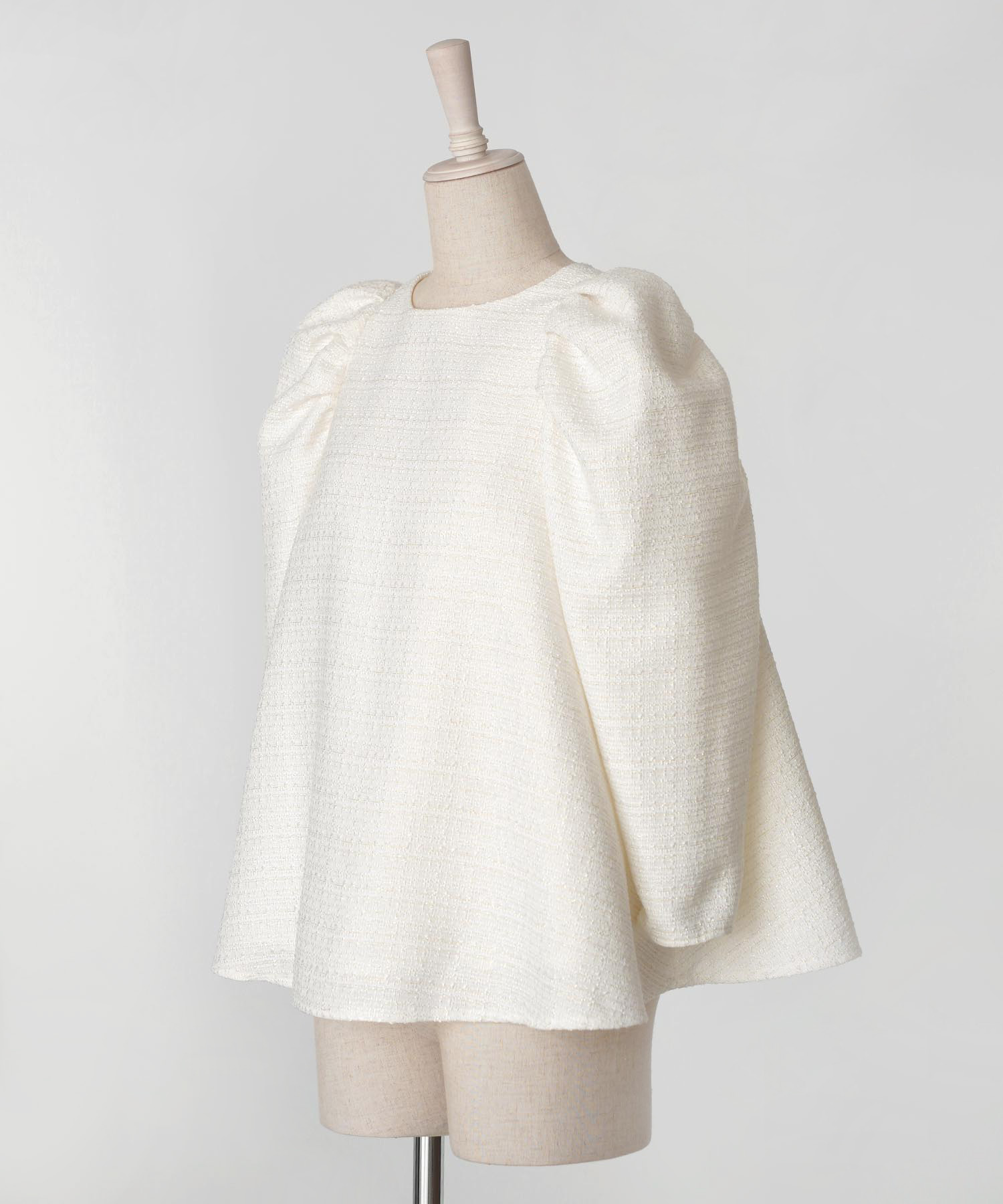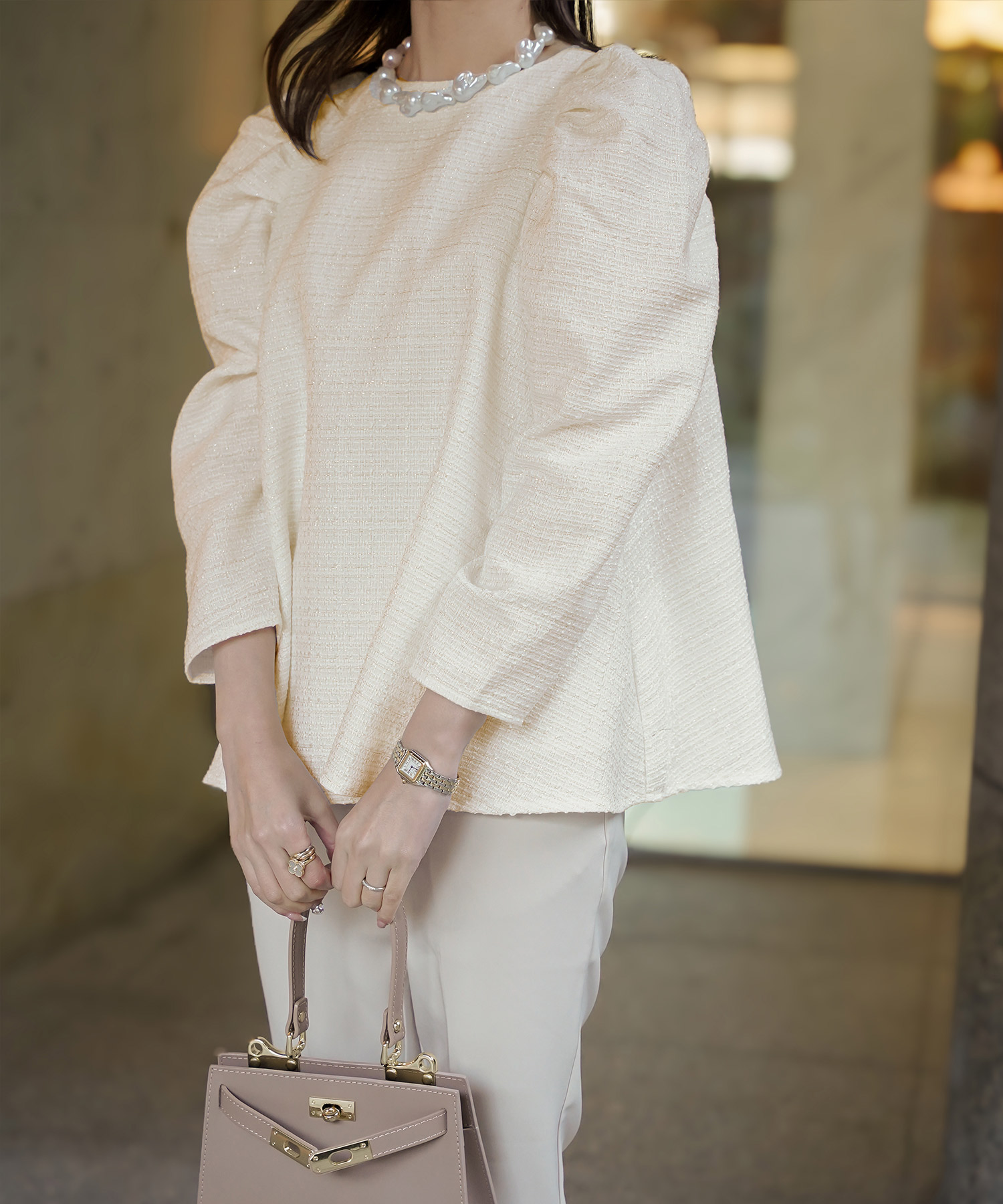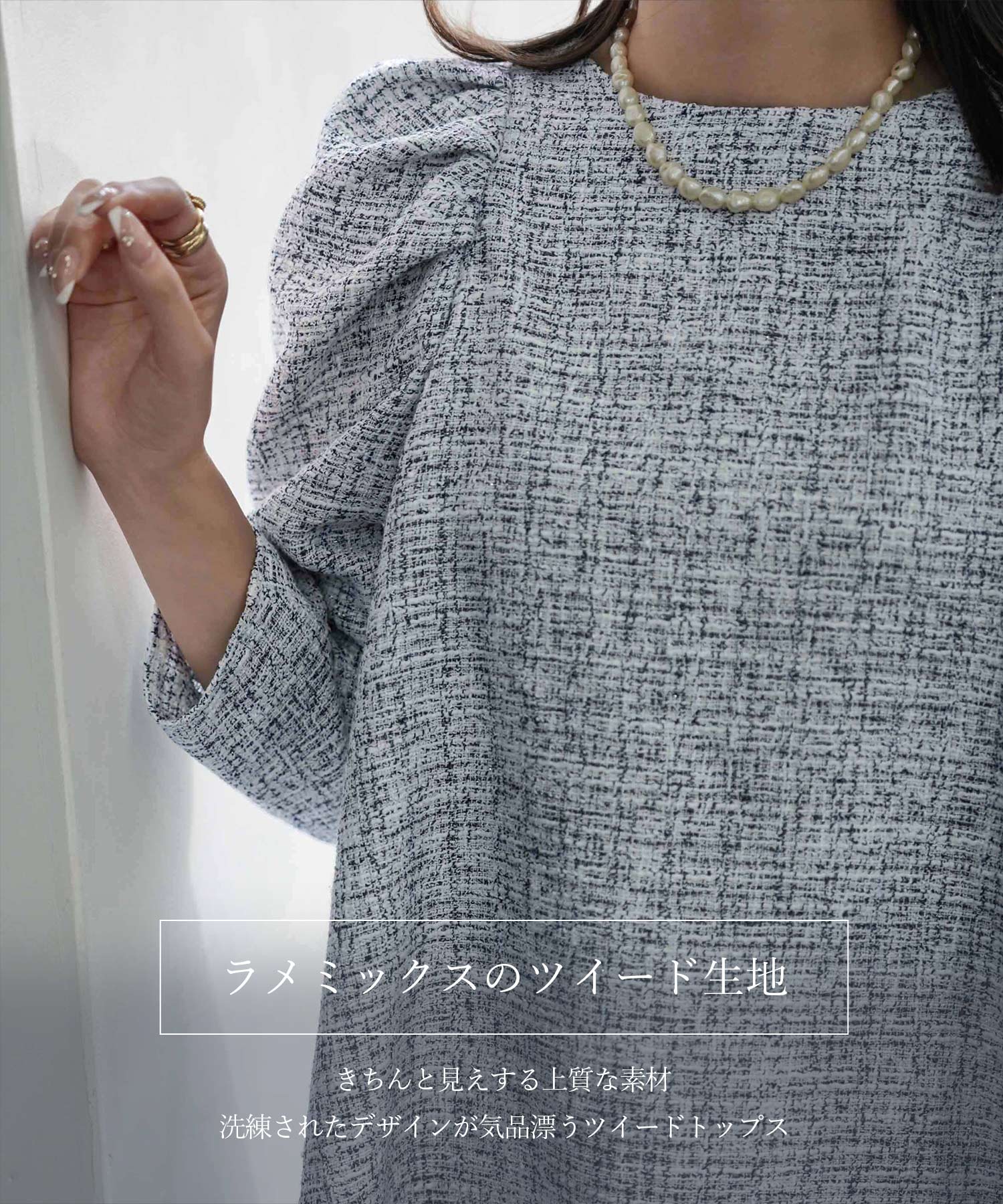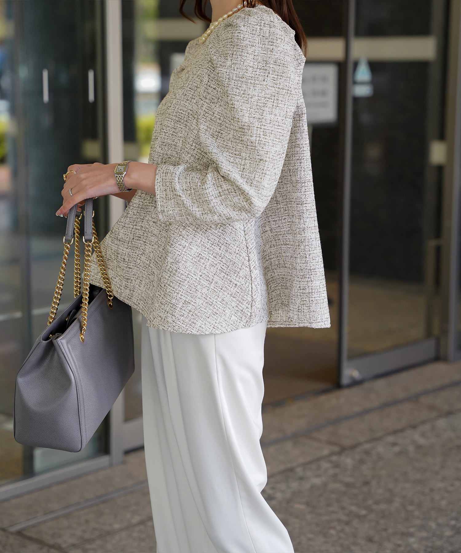 フォーマルシーンにふさわしいツイード素材のトップス。豊富なカラーバリエーションから、手持ちのボトムスに合わせやすい一枚を選べます。フレアシルエットで体のラインを拾わず、上品に着こなせるのも魅力。