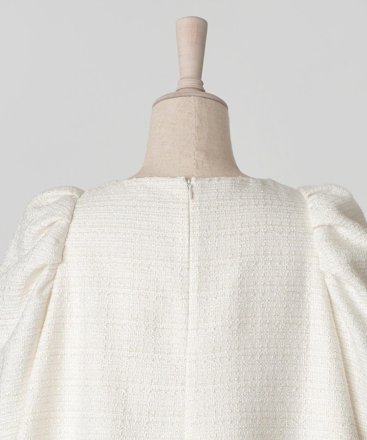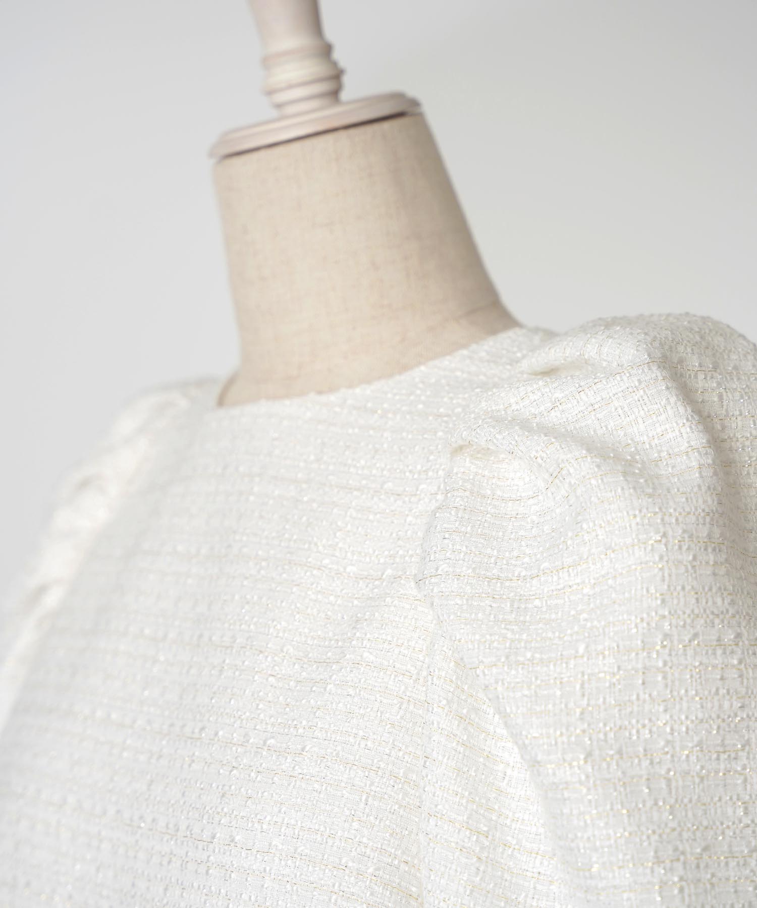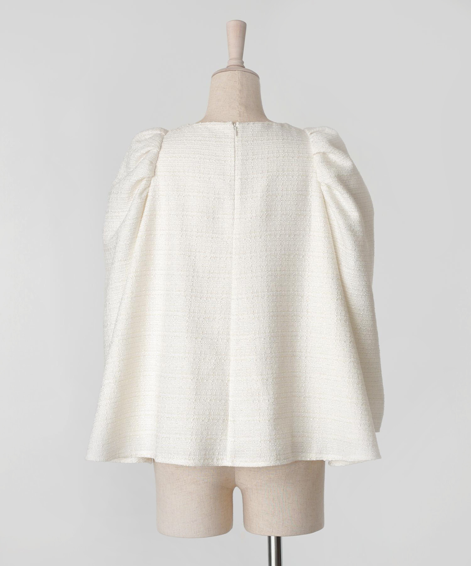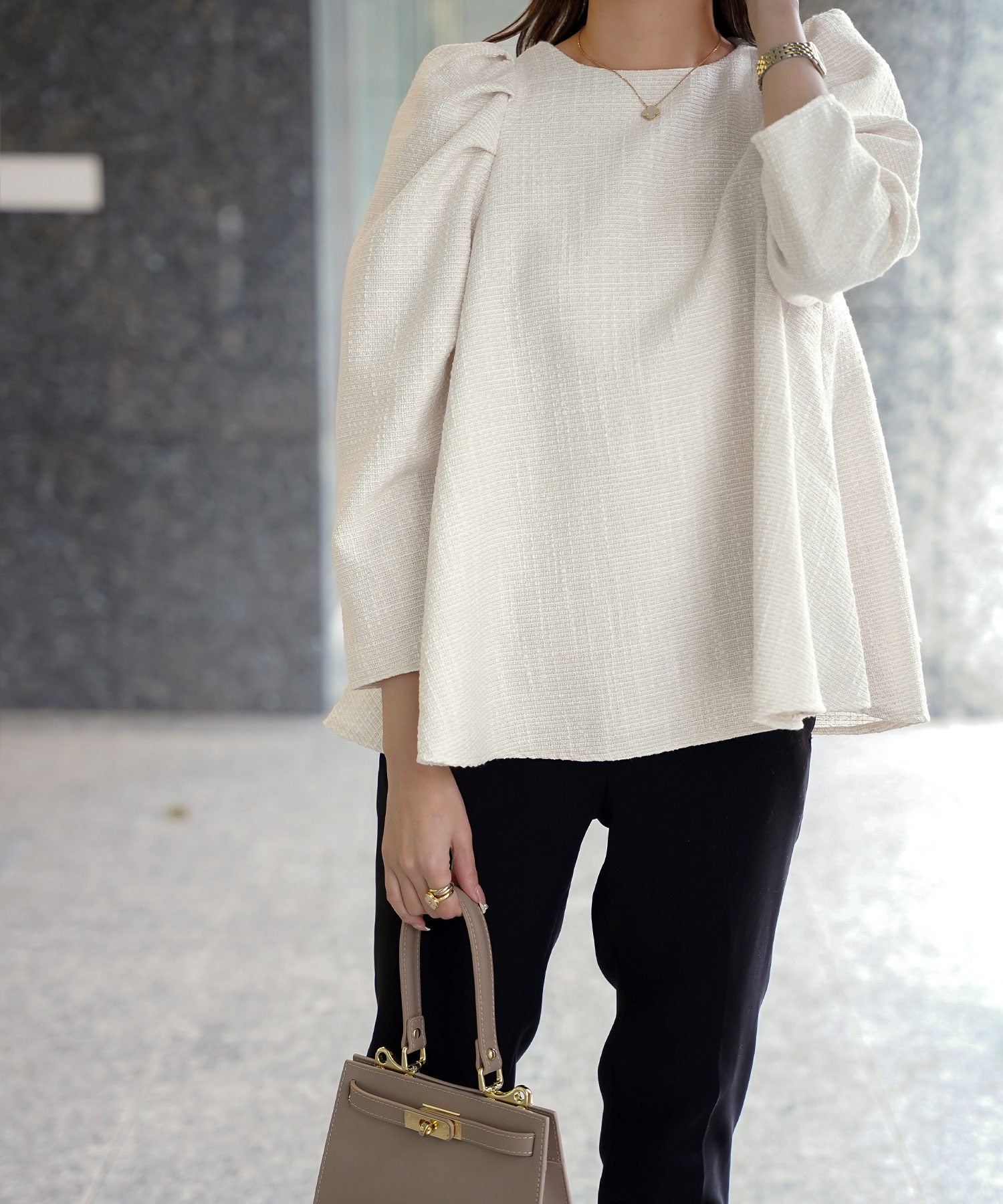 フォーマルシーンにふさわしいツイード素材のトップス。豊富なカラーバリエーションから、手持ちのボトムスに合わせやすい一枚を選べます。フレアシルエットで体のラインを拾わず、上品に着こなせるのも魅力。