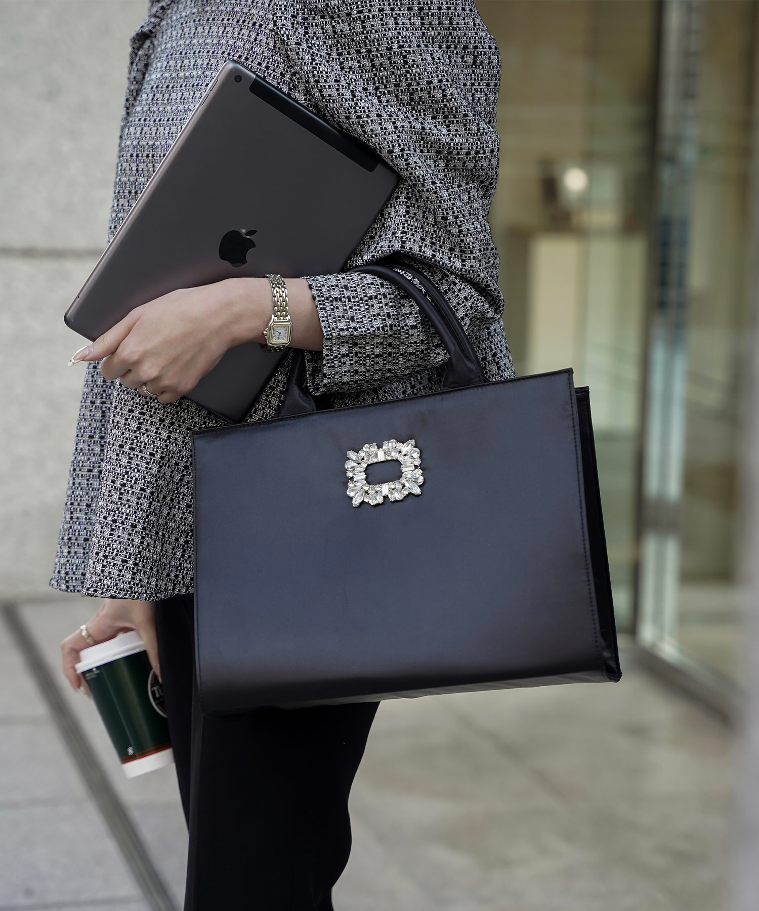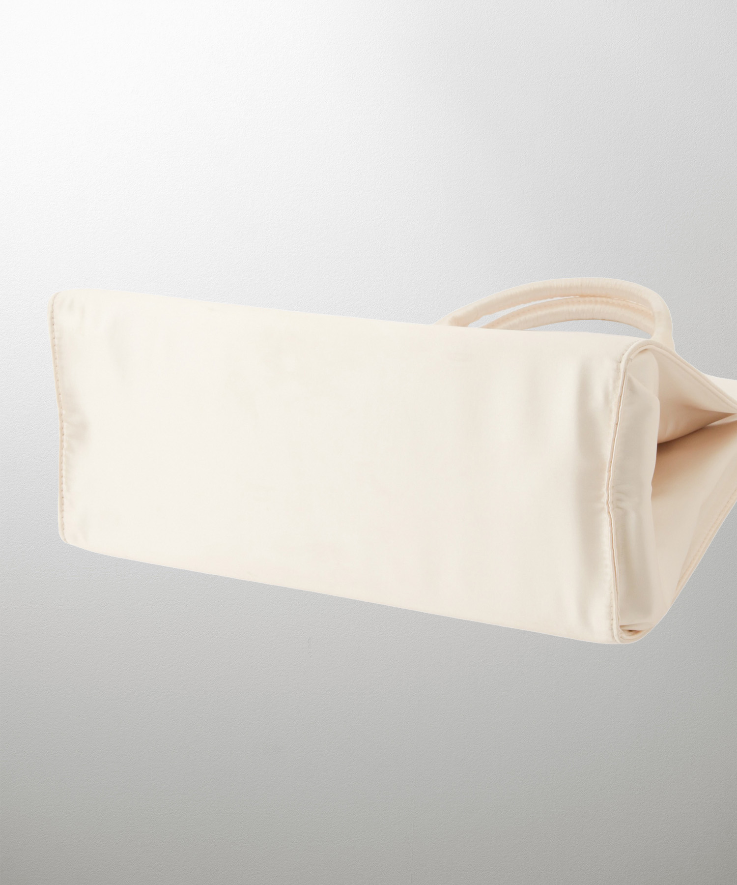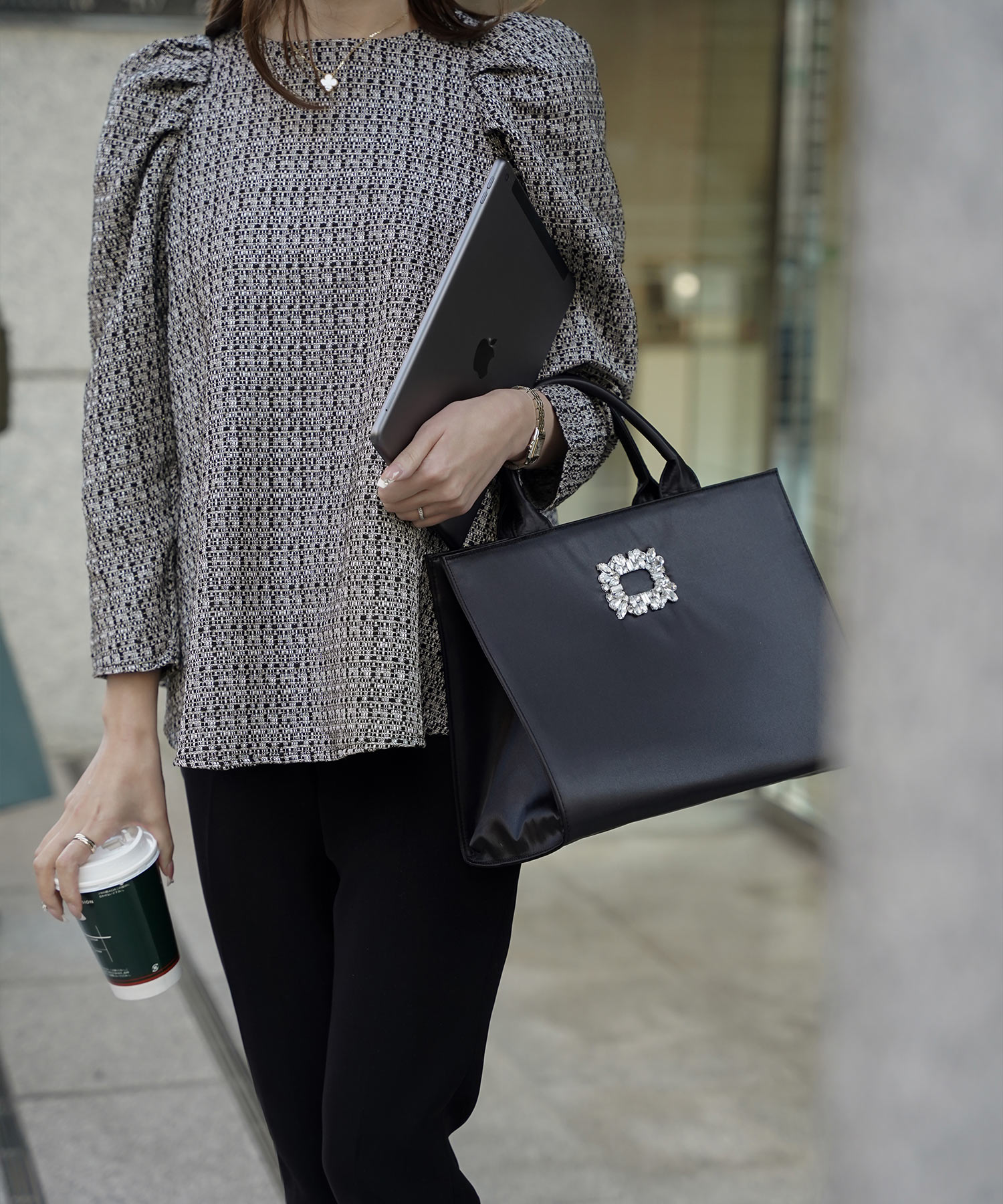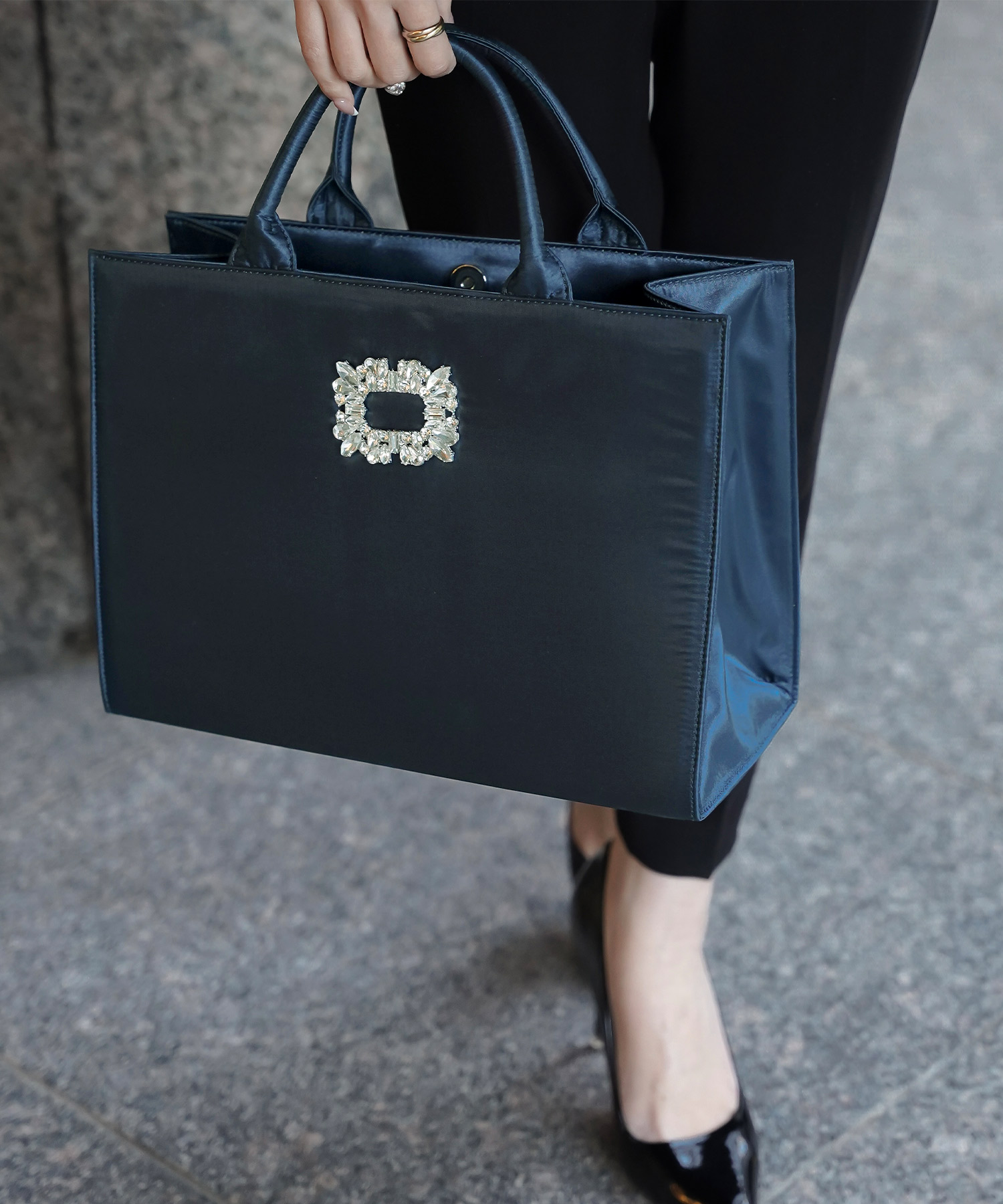 上品なツヤ感が魅力のサテン素材トート。A4サイズの書類がすっぽり入るちょうどいいサイズ感で、オケージョンシーンにはもちろん、通勤バッグとしても活躍します。
