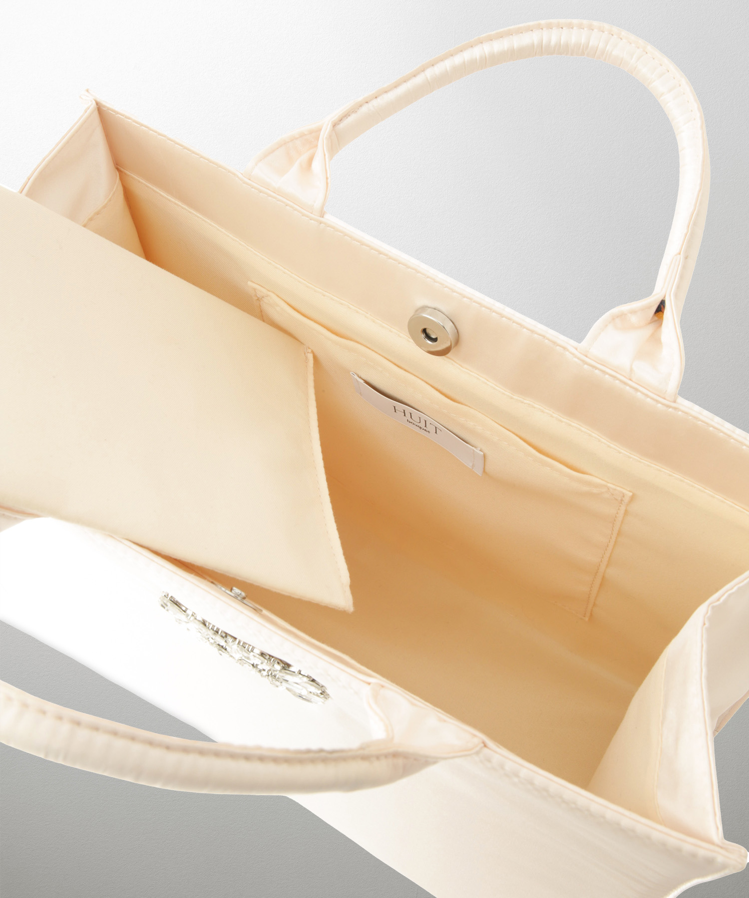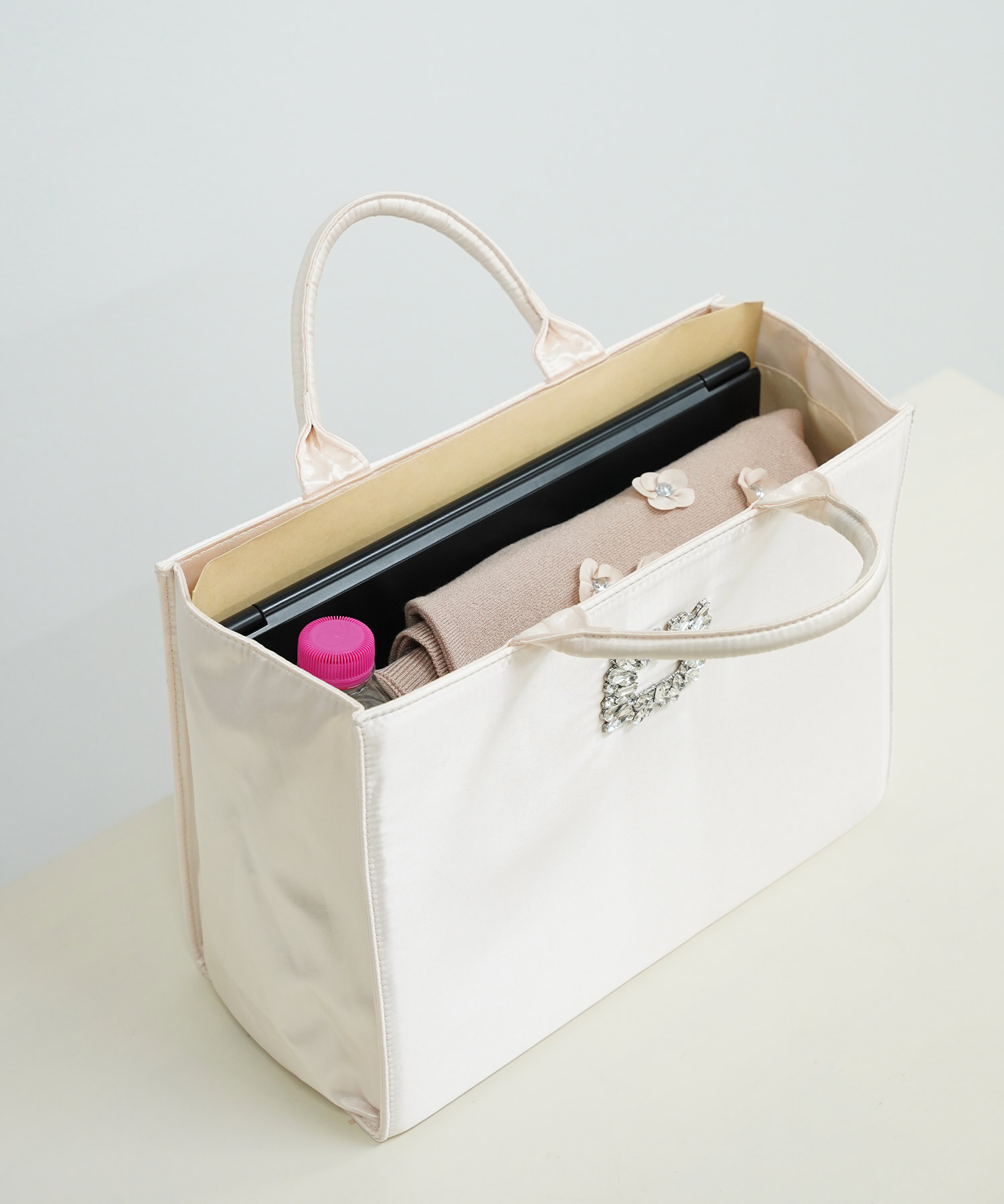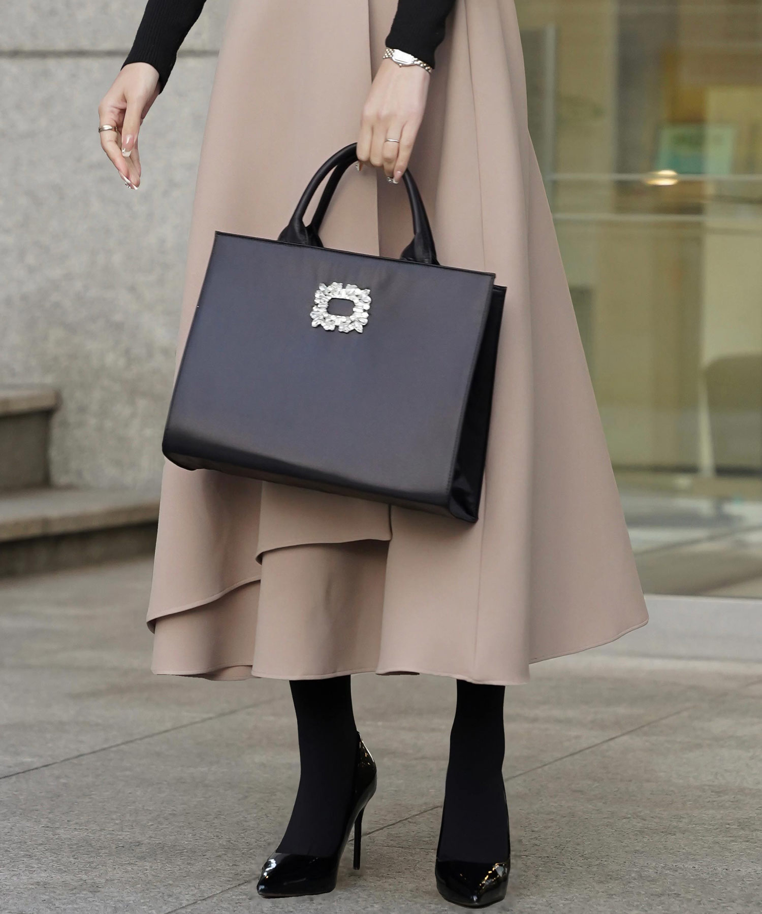 上品なツヤ感が魅力のサテン素材トート。A4サイズの書類がすっぽり入るちょうどいいサイズ感で、オケージョンシーンにはもちろん、通勤バッグとしても活躍します。