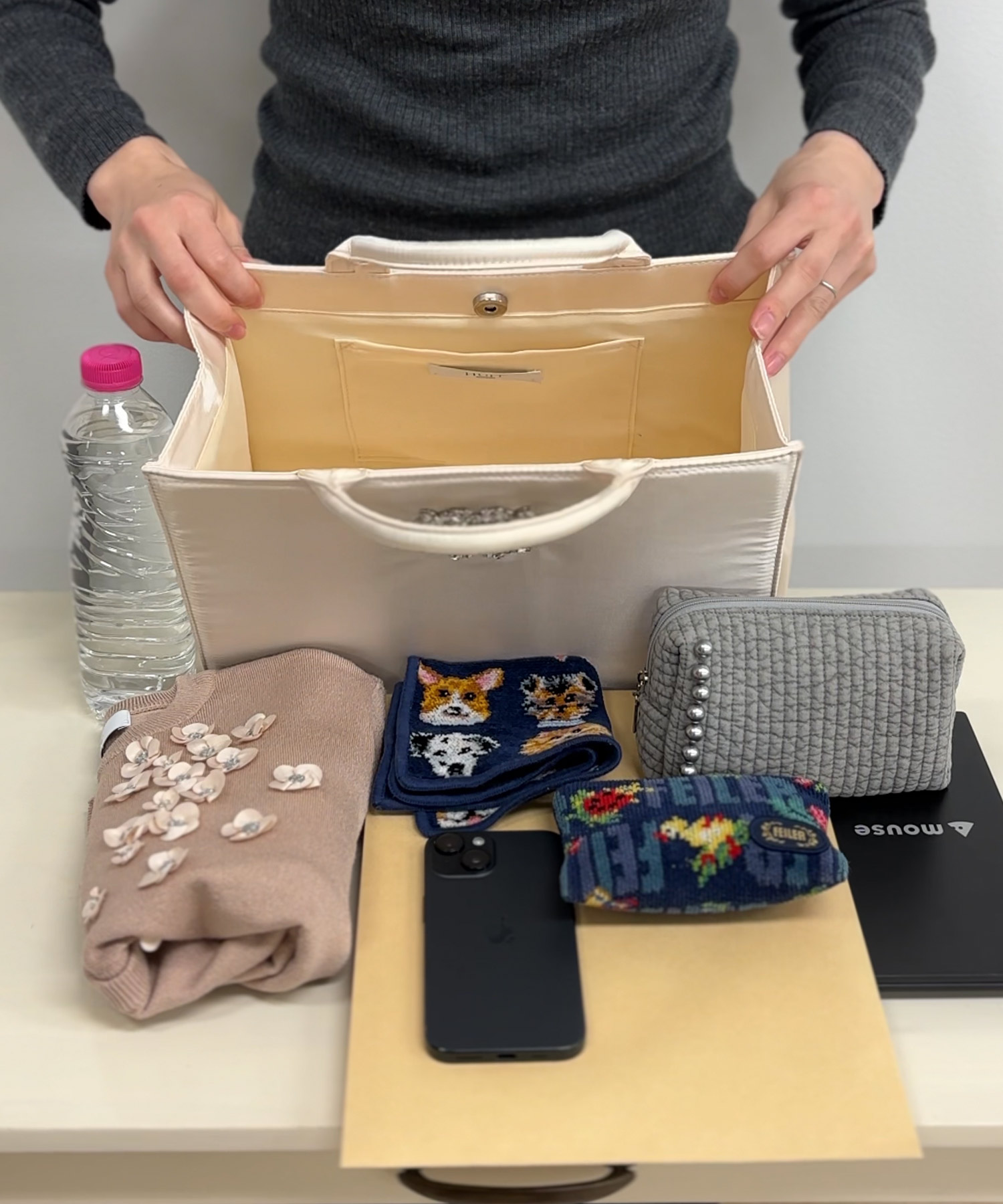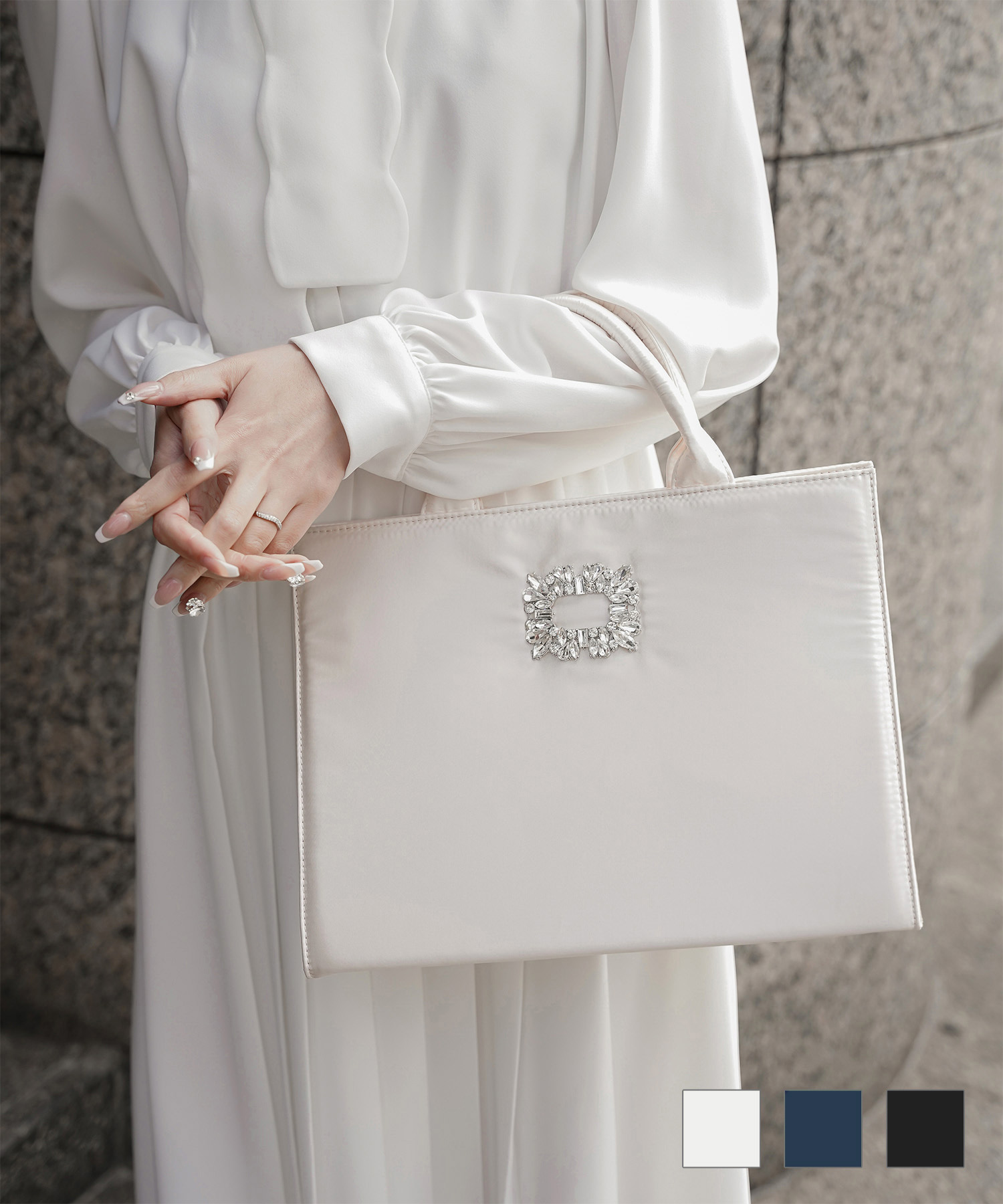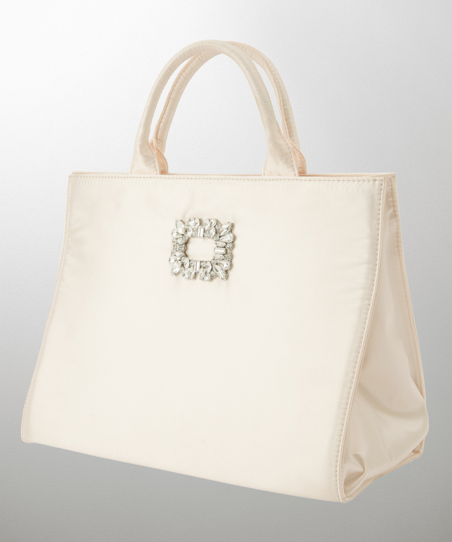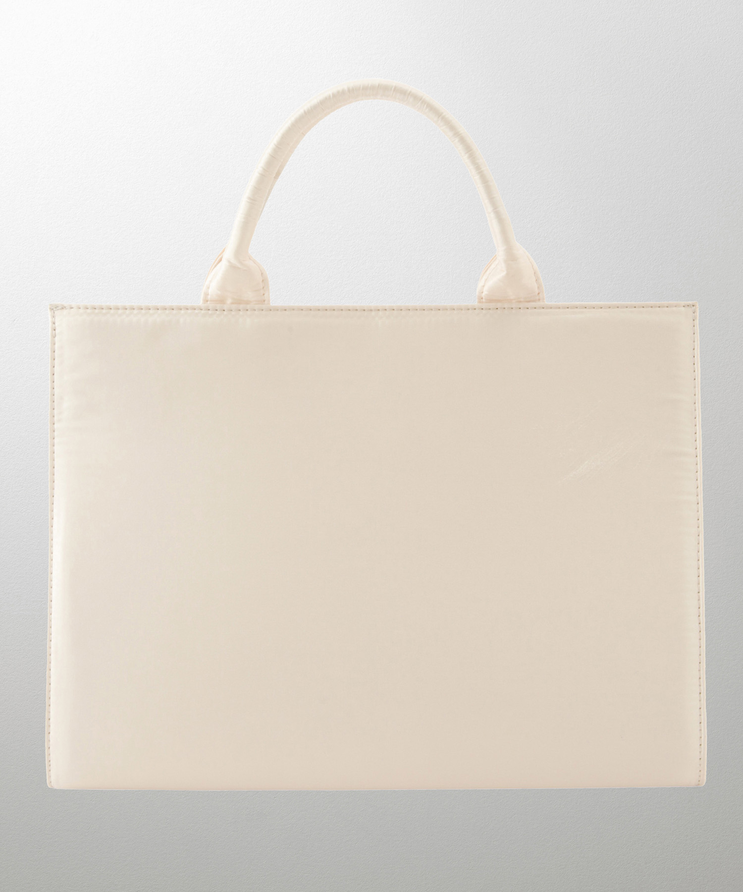 上品なツヤ感が魅力のサテン素材トート。A4サイズの書類がすっぽり入るちょうどいいサイズ感で、オケージョンシーンにはもちろん、通勤バッグとしても活躍します。