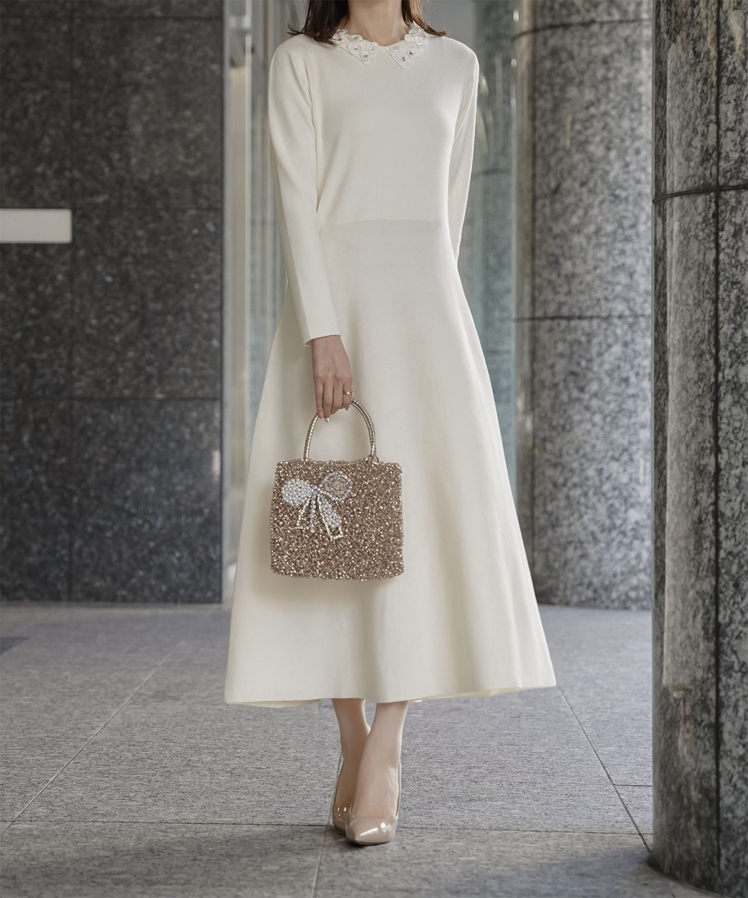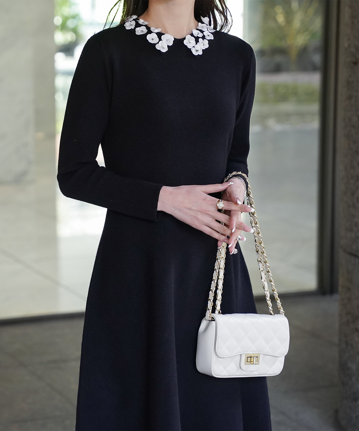 アンゴラタッチの柔らかな肌ざわりと、暖かさが魅力のニットワンピース。襟元にはさりげなくあしらわれた花モチーフが上品なアクセントに。シンプルなシルエットながら、顔まわりを華やかに演出します。まだ肌寒い卒業式シーズンにも安心の一枚です。