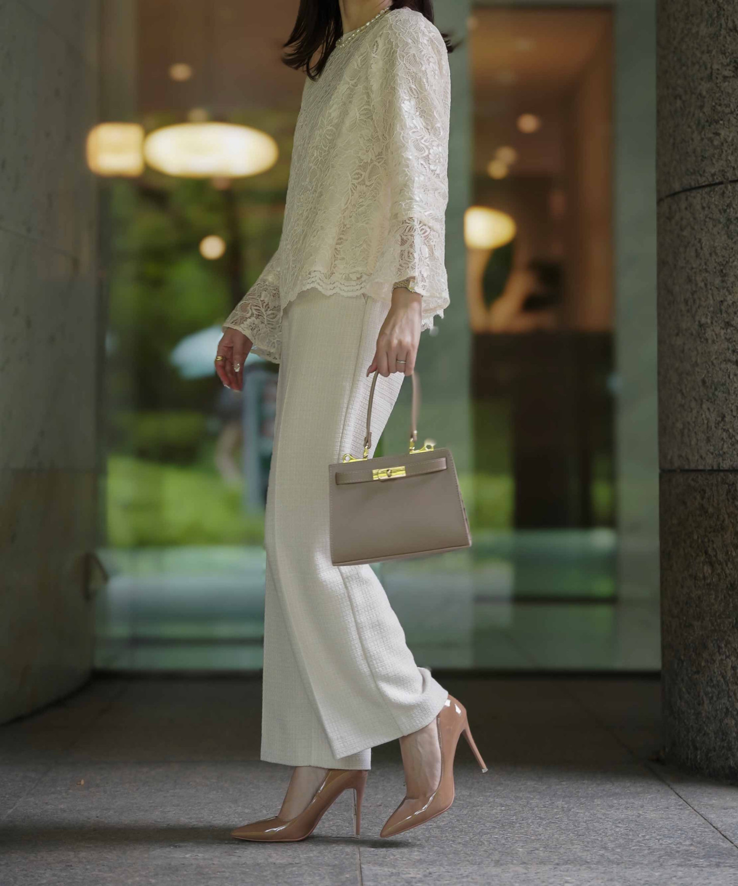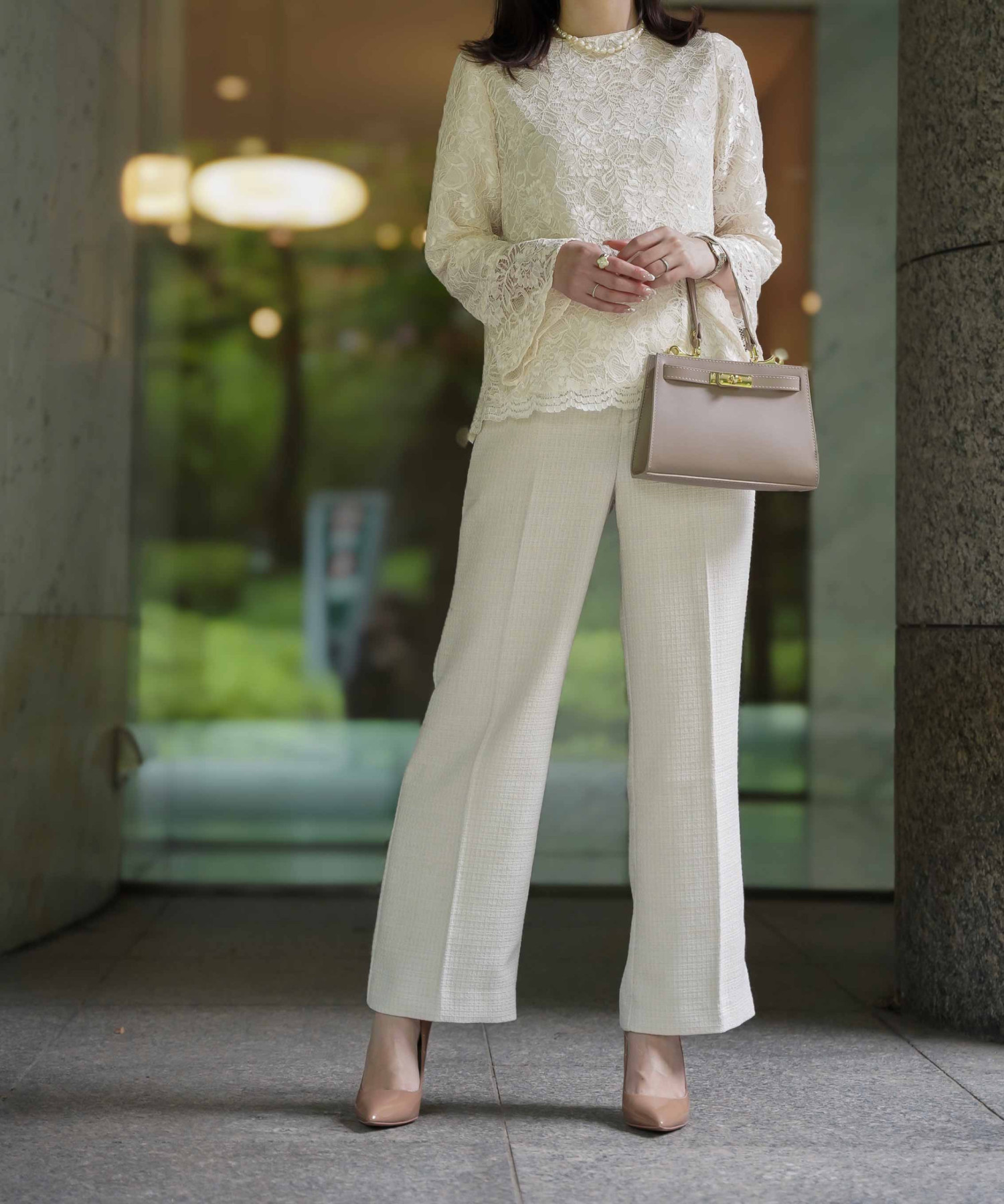 エレガントなツイード素材が魅力のパンツ。総レースのブラウスと合わせれば、よりドレッシーな印象に。セミワイドシルエットで、気になる足のラインをさりげなくカバーしてくれるのも嬉しいポイント。