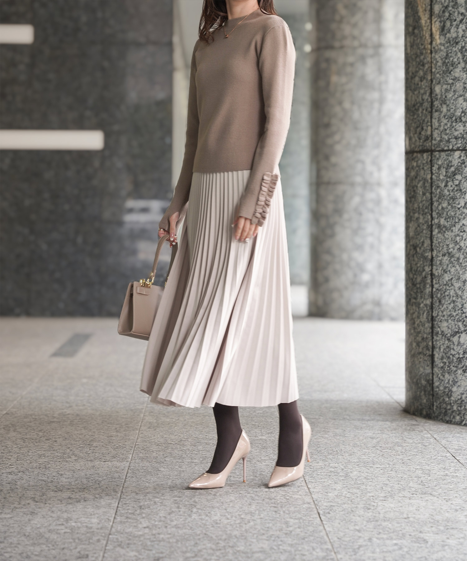 バレエコアの甘美なムードを纏う、袖口フリルニット×プリーツスカート