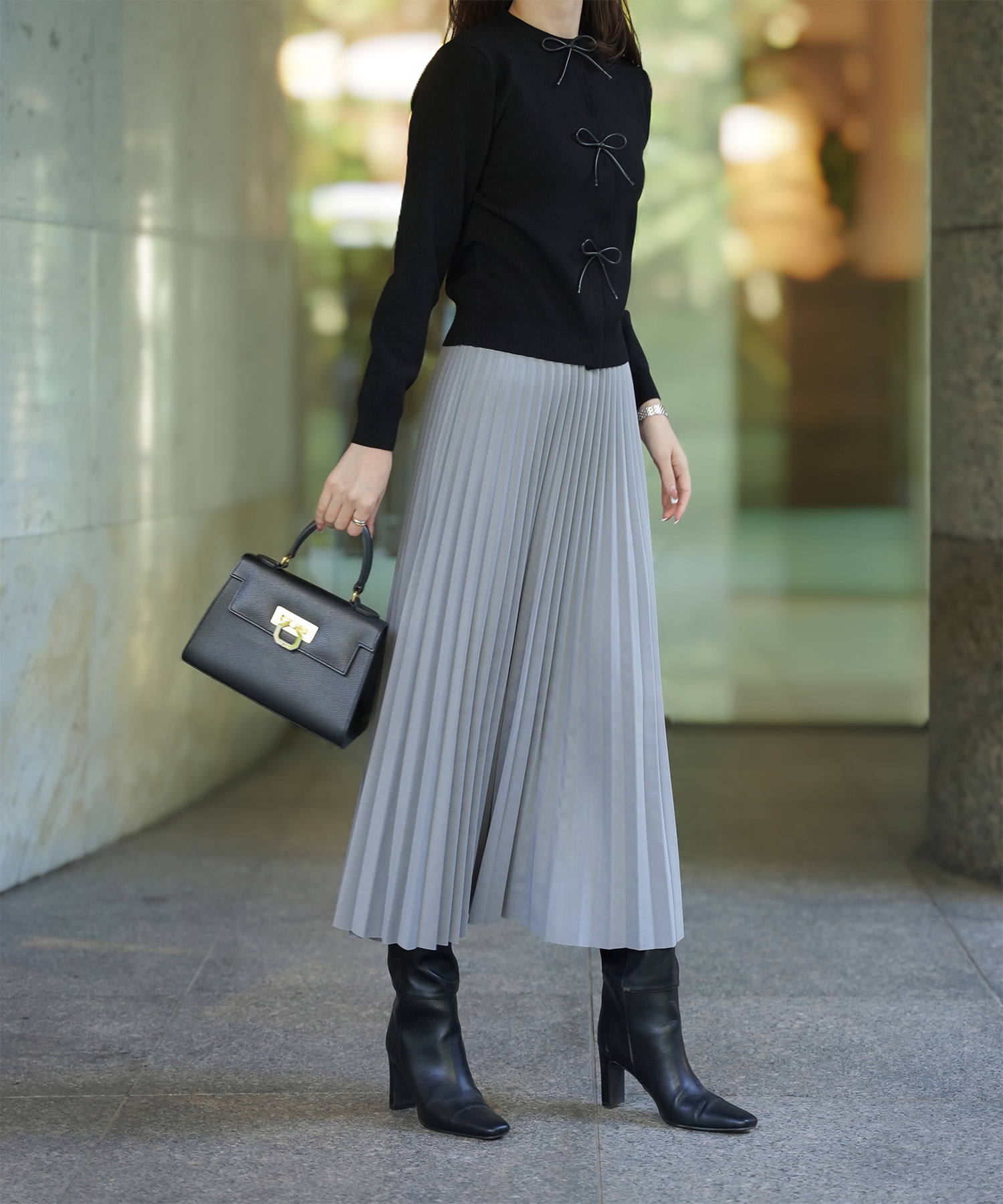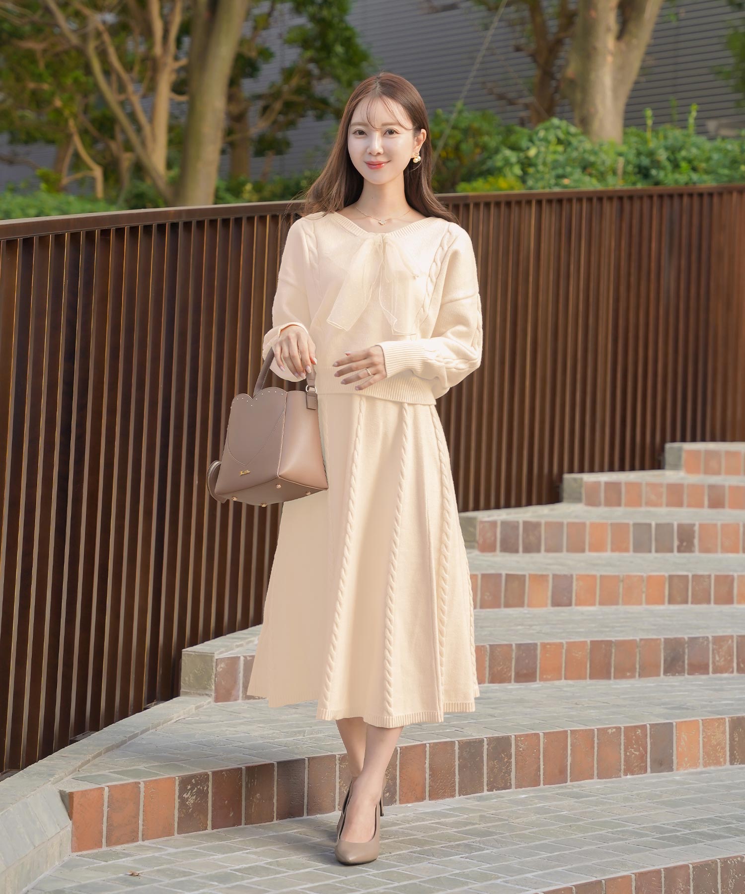 ふんわりとしたチュールリボンが、冬のバレエコアスタイルを格上げするポイントに。リボンは取り外し可能なので、シーンに合わせてアレンジ自在。セットアップで統一感のある着こなしはもちろん、それぞれ単品で着回せるのも嬉しいポイント。甘さと実用性を兼ね備えた、大人のためのニットセットアップです。