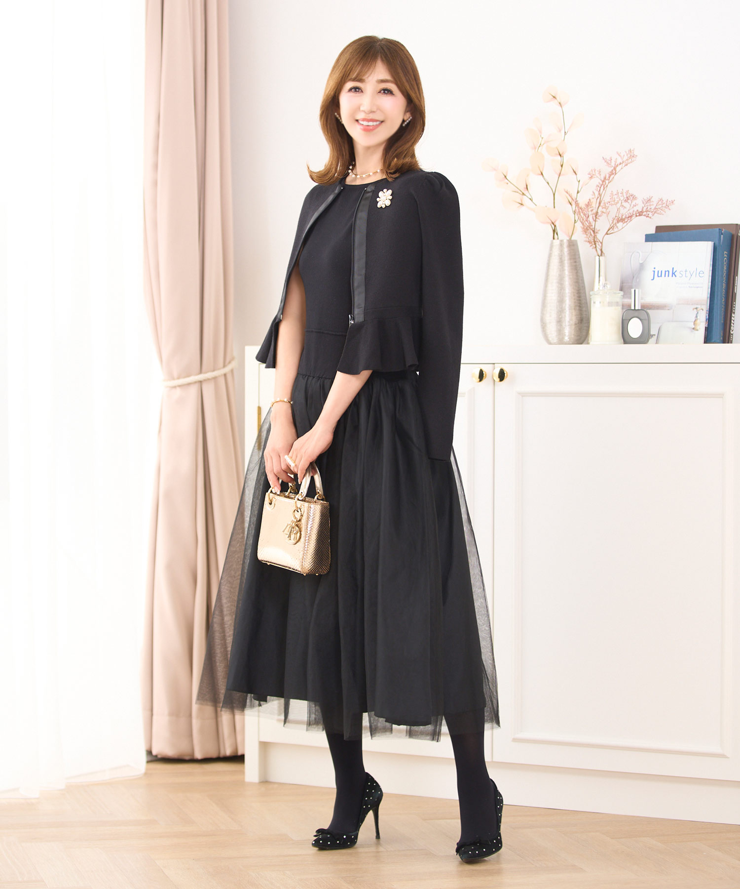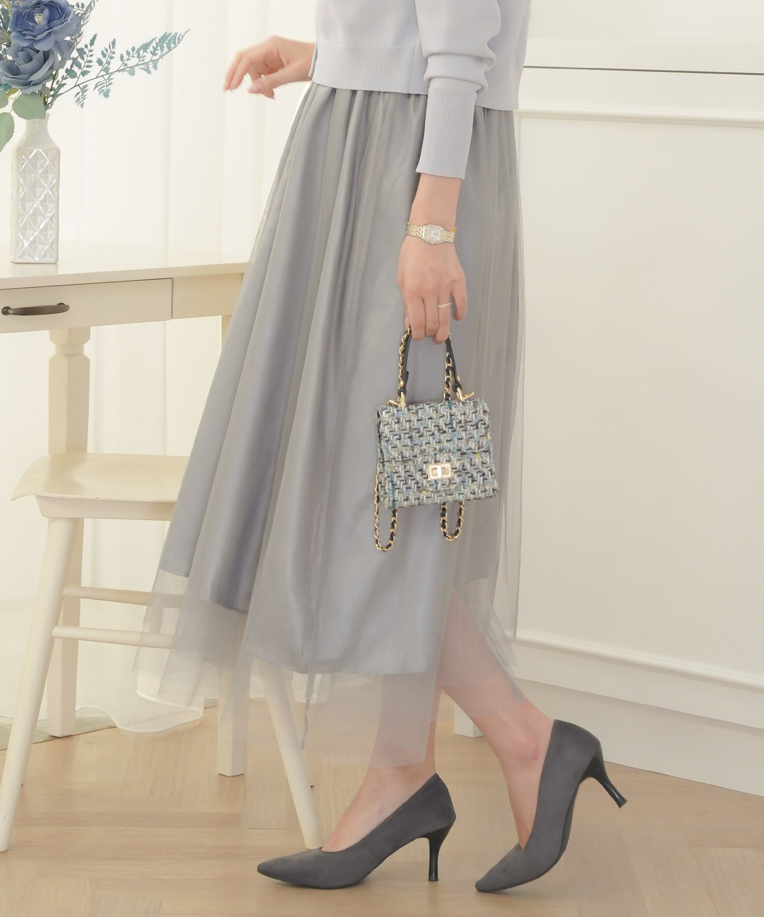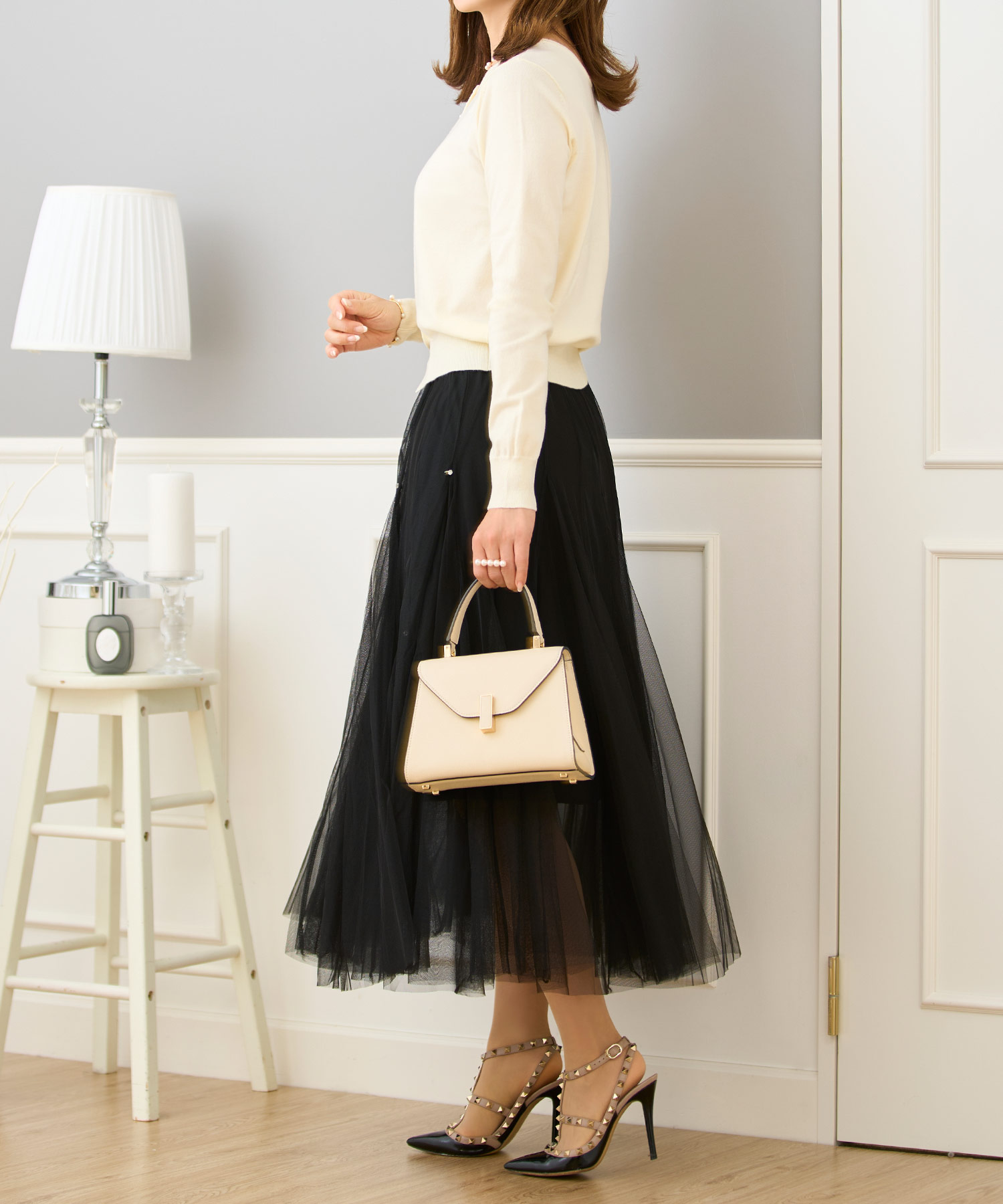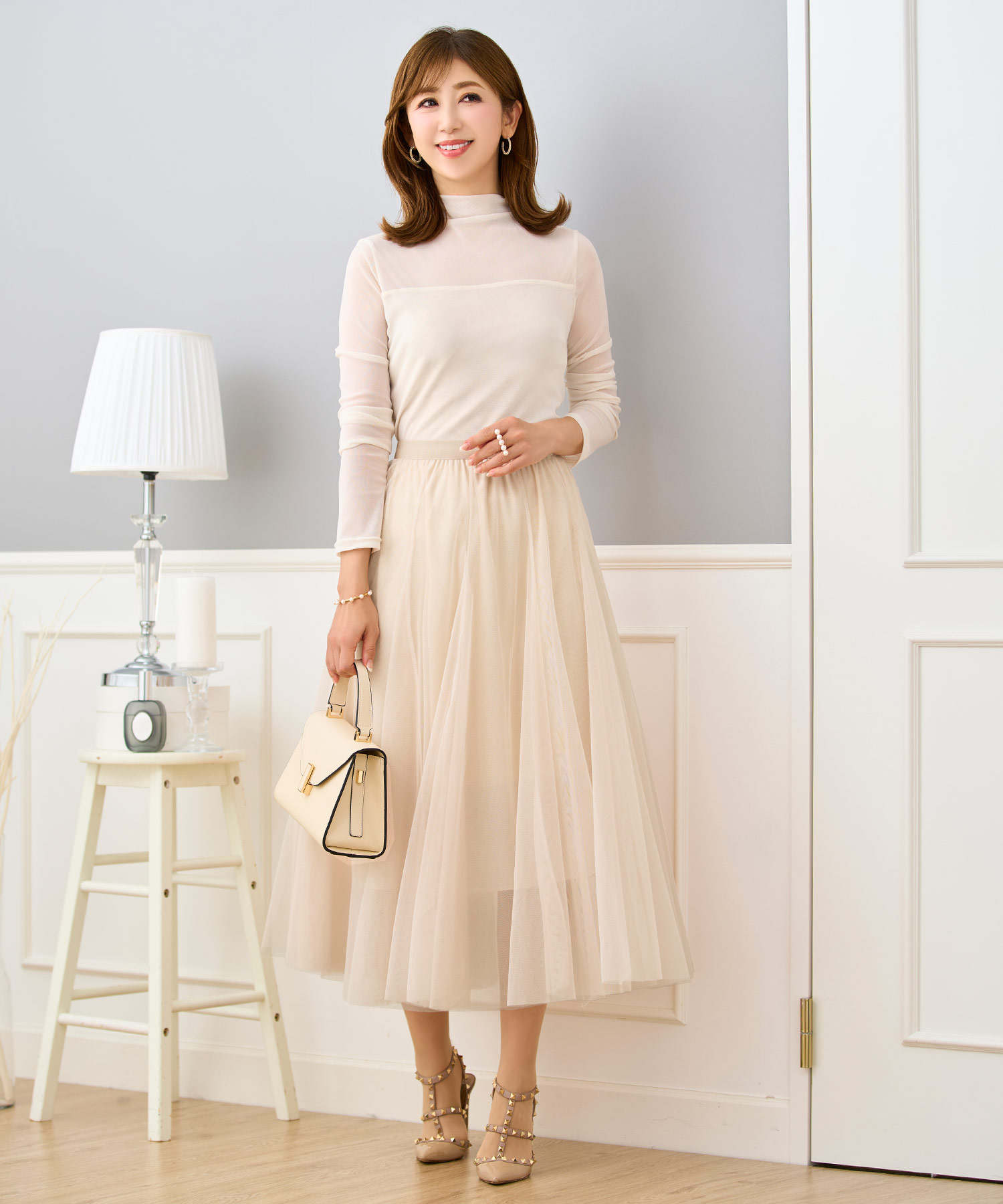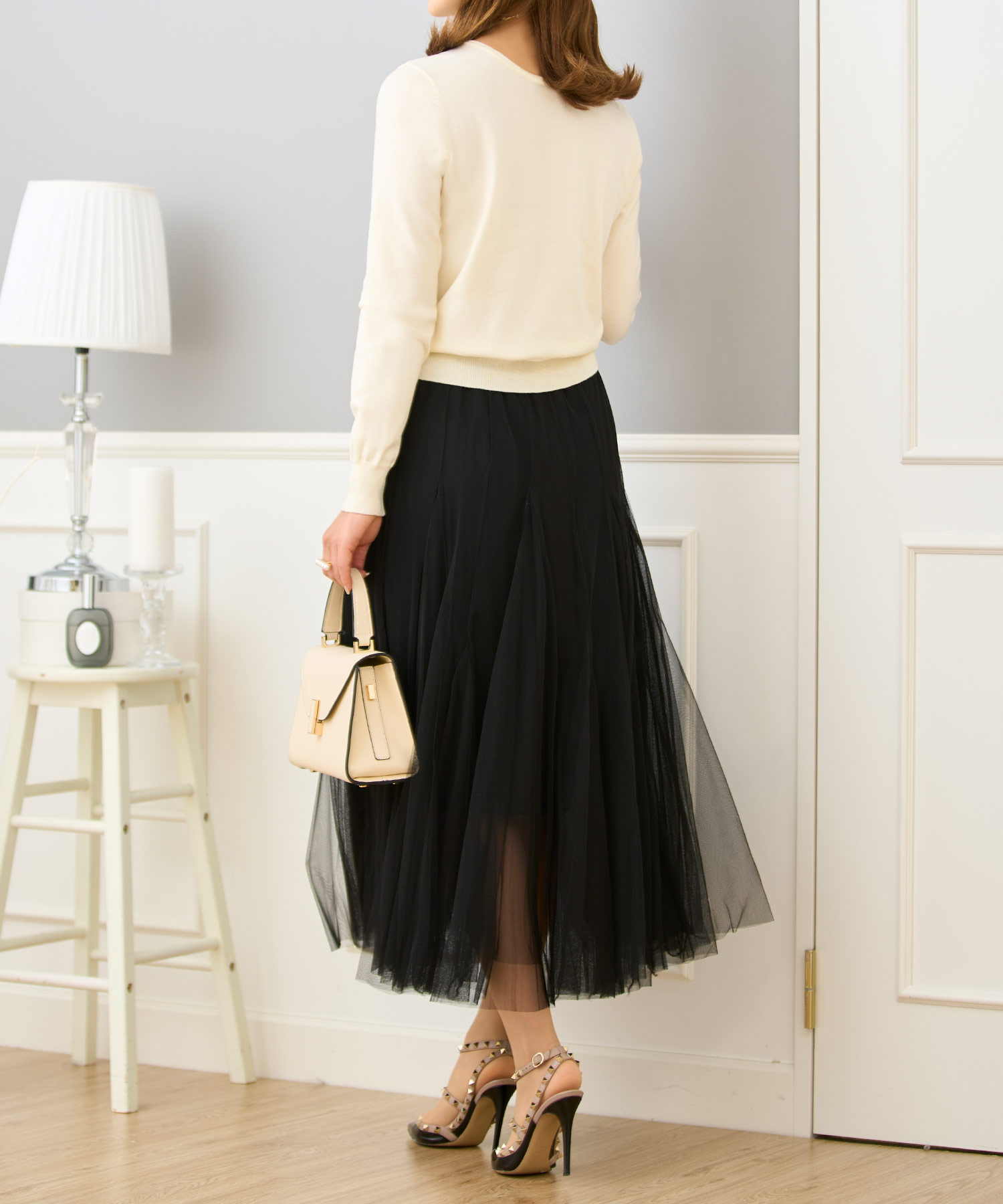 チュールスカートとニットがドッキングした、優雅なシルエットのワンピース。ふんわり広がるチュールが上品な華やかさを添え、着るだけでコーディネートが完成。カーディガンやジャケットを羽織れば、大人っぽさがぐっと引き立ちます。観劇や食事会など、特別な時間を彩る一枚。