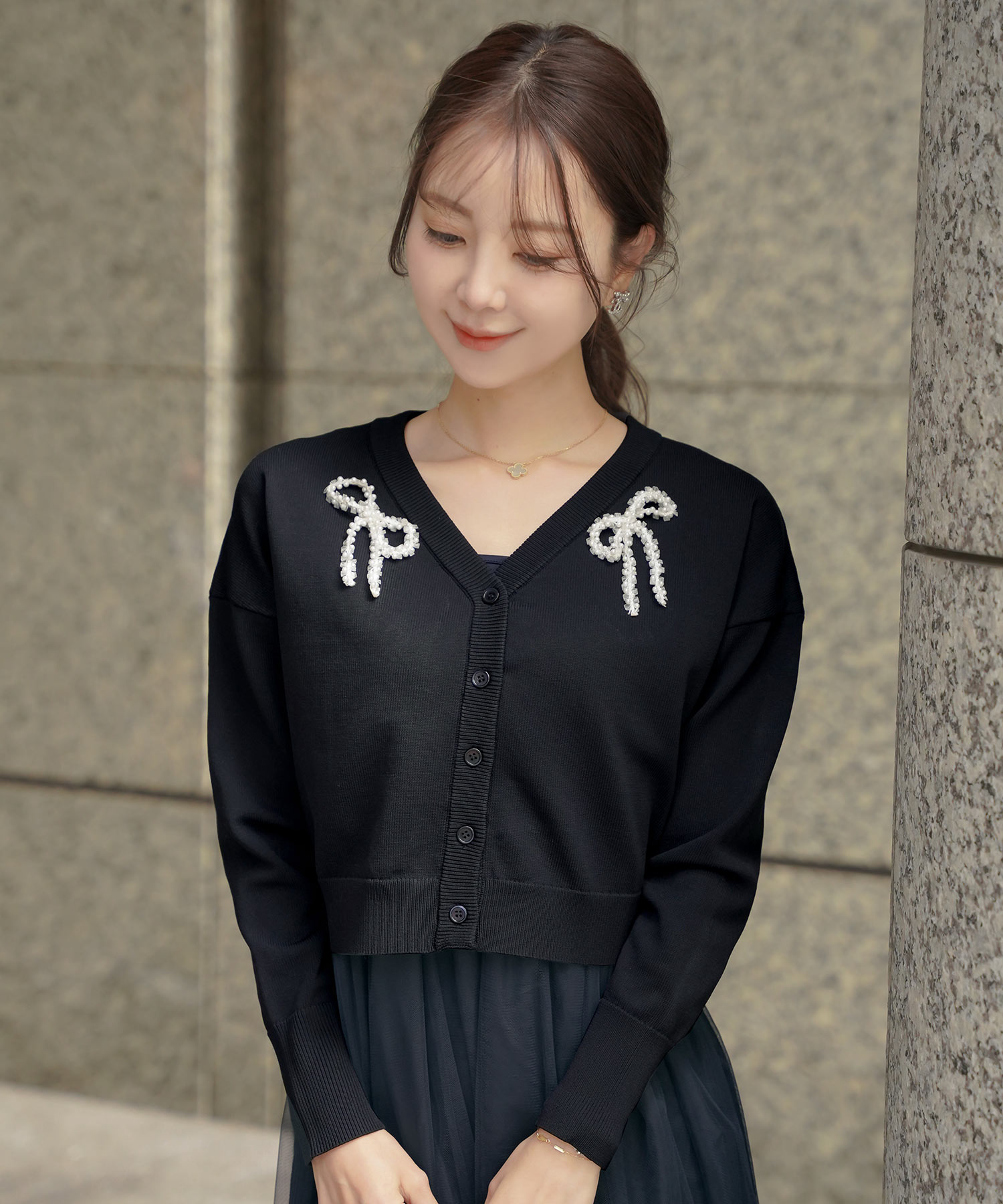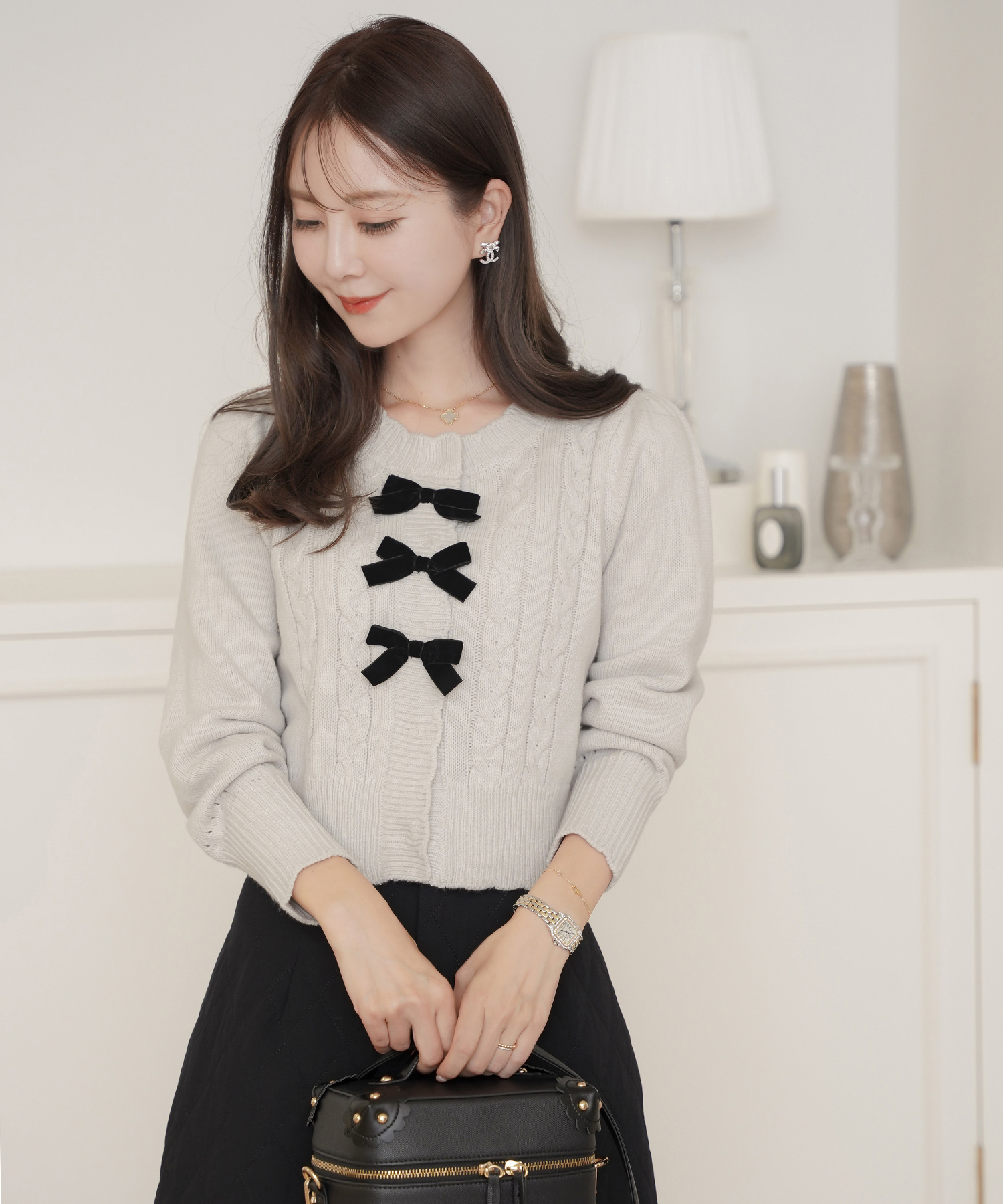 ベロアリボンが品よく映える。大人のための華やぎカーディガン