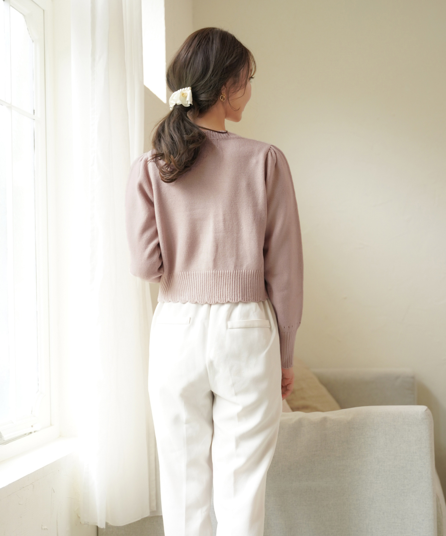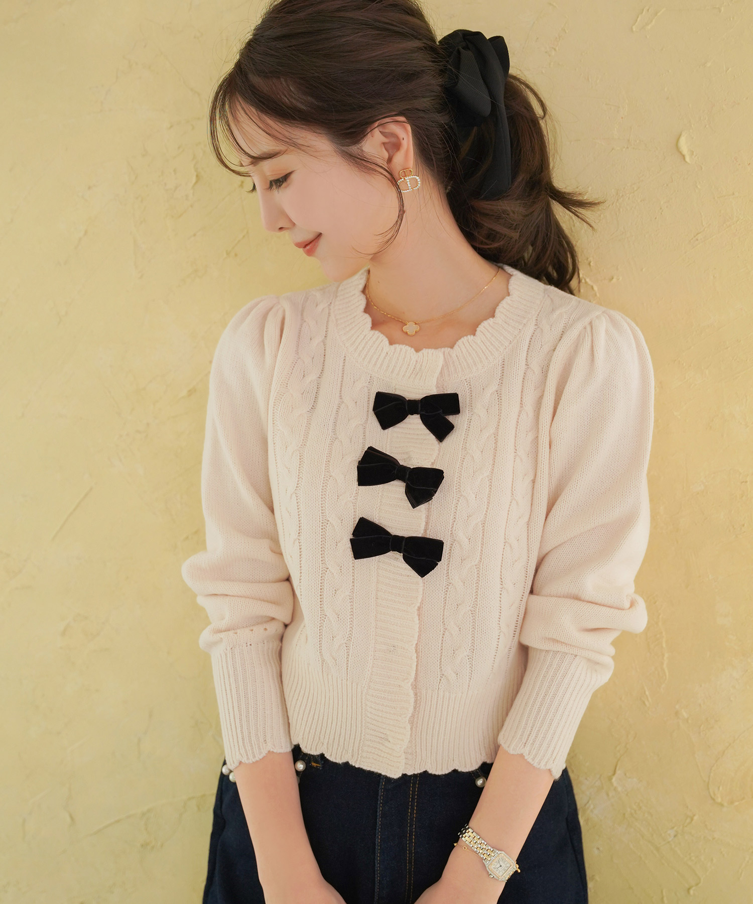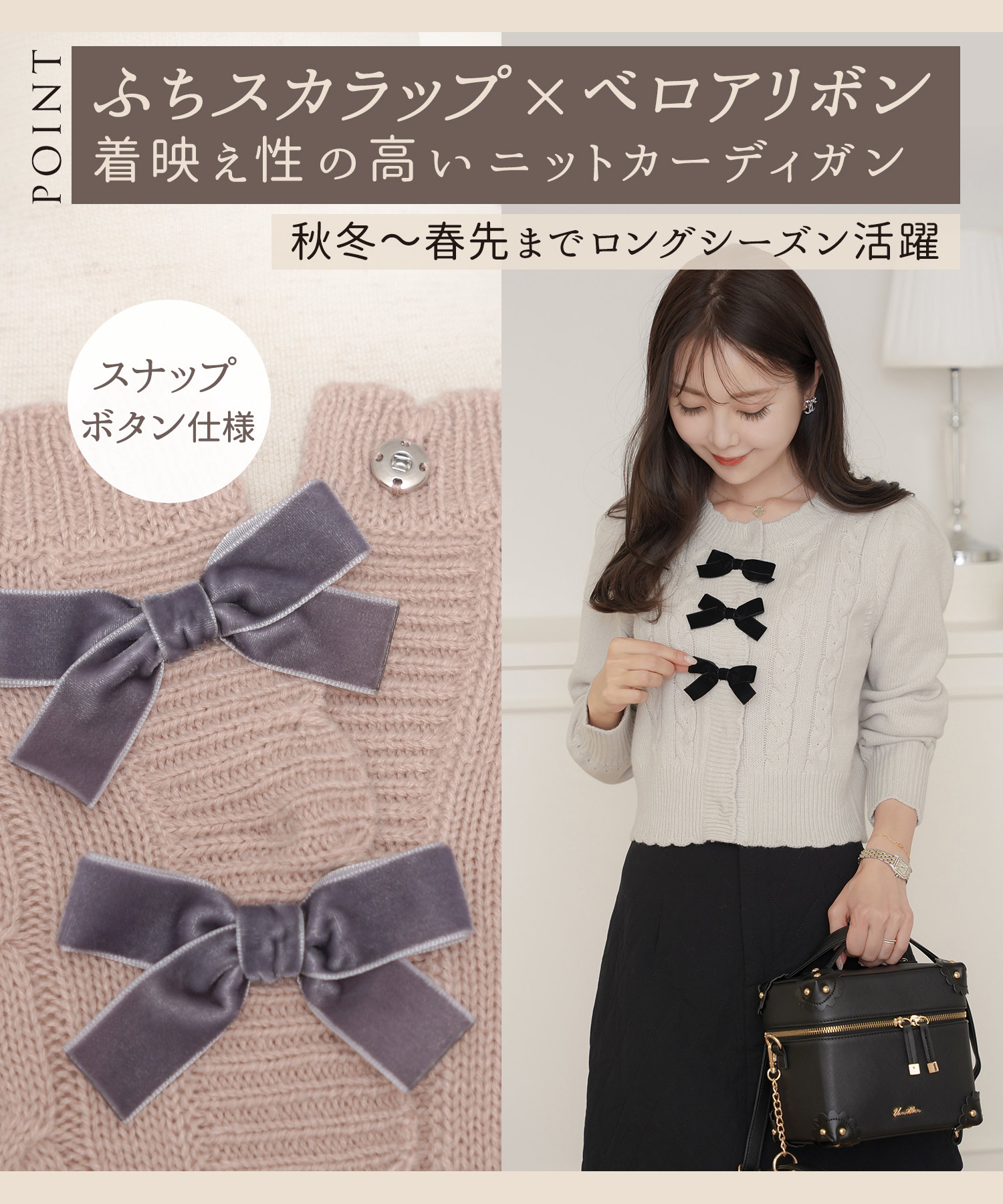 ベロアリボン×スカラップデザインが目を惹く、クラシカルなニットカーディガン。ショート丈でバランスよく決まり、ハイウエストボトムスとの相性も◎。甘さと品のバランスが絶妙な、大人のための一枚。