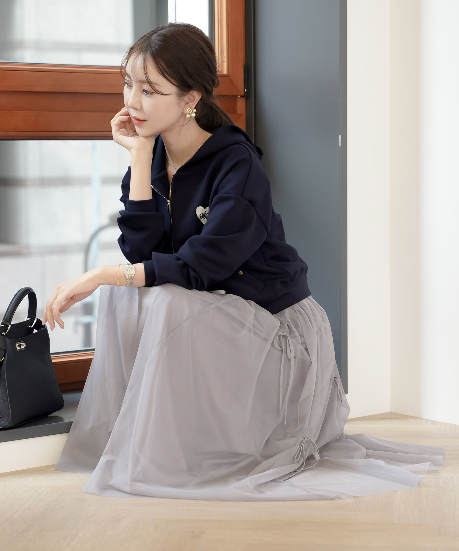 ランダムにつまんだチュールスカートに、リボンを散りばめた甘く華やかなデザインが魅力。トップス次第で印象が変わるので、シンプルなリブニットでフェミニンに、またはパーカーを合わせてカジュアルダウンするのもおすすめです。トレンドのバレエコアスタイルを、自分らしくアップデートしてみて。