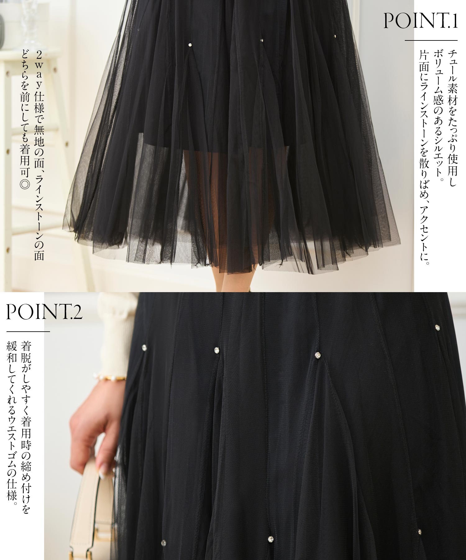 定番のチュールスカートに、上品な輝きを添えるラインストーンをあしらった、気分の上がる一着。トレンドのバレエコアスタイルを、より華やかに楽しめます。さらに、前後2way仕様なので、トップスとの組み合わせ次第でエレガントにもカジュアルにもアレンジ自在。例えば、シンプルなリブニットを合わせれば洗練された大人コーデに、ボリュームスリーブのブラウスと合わせれば、華やかなバレエコアスタイルが完成します。