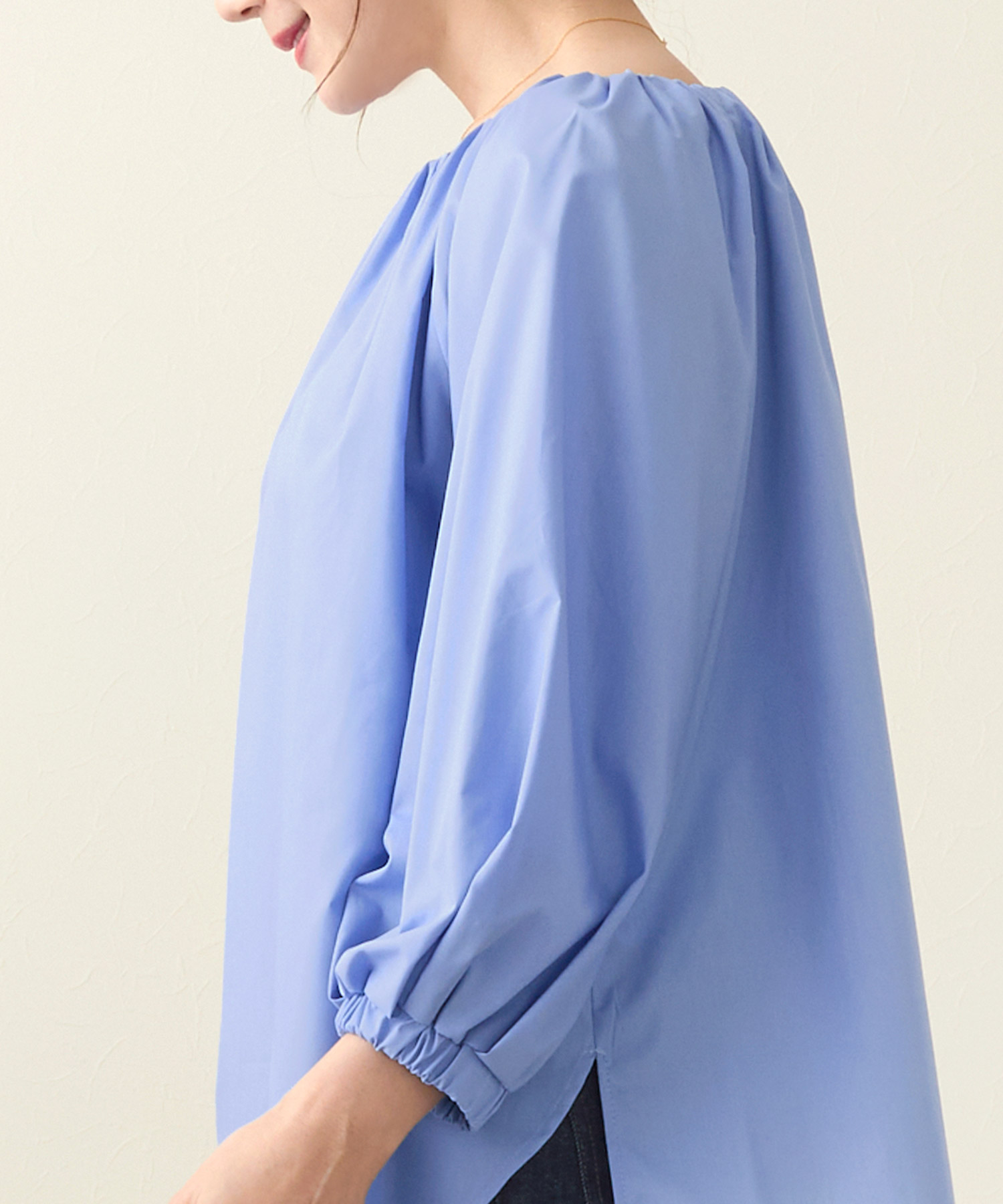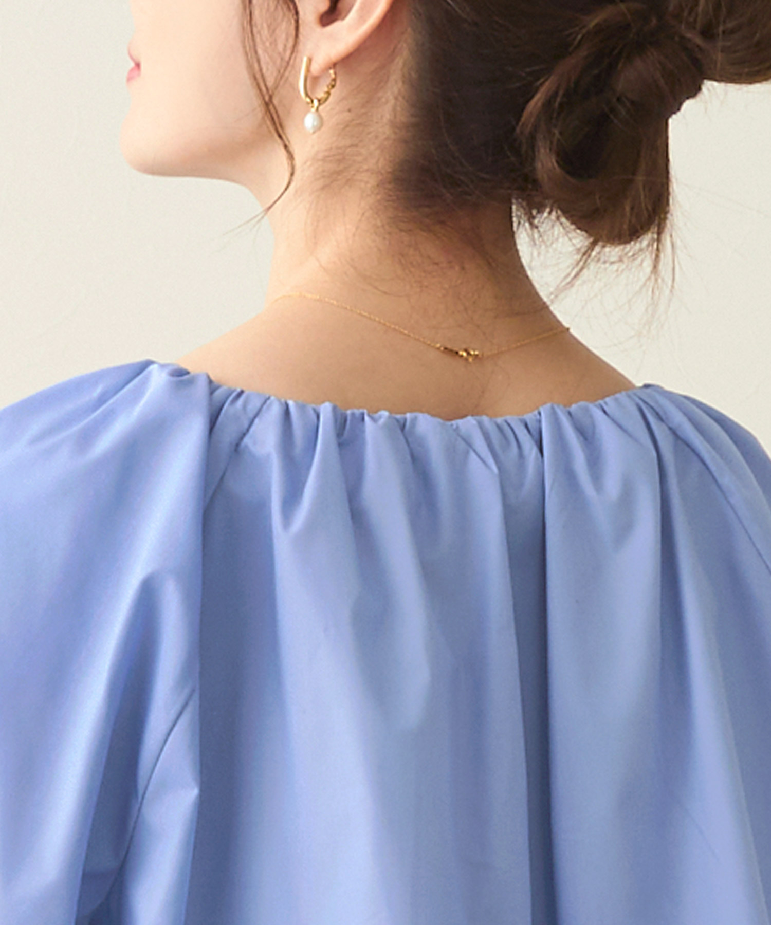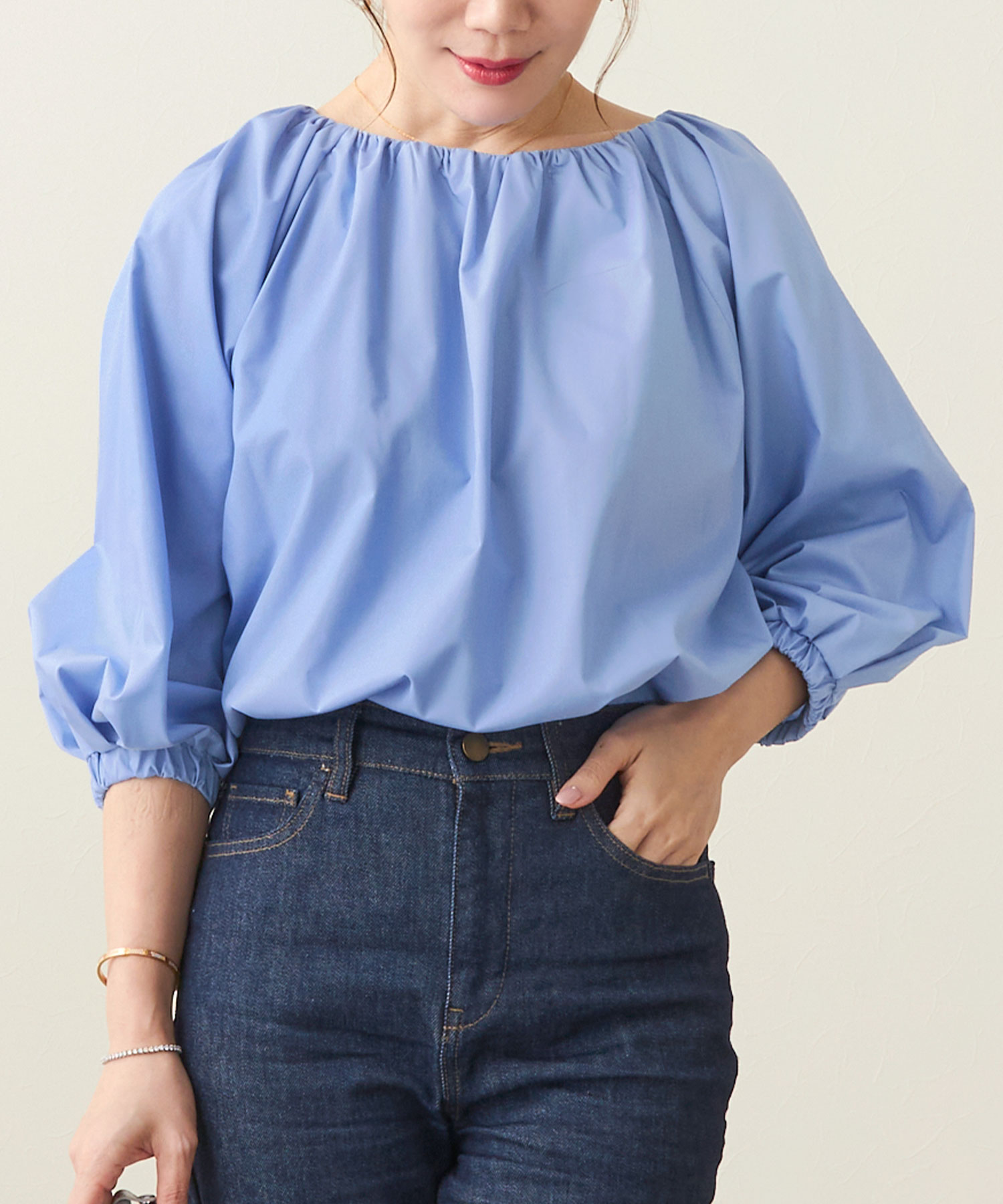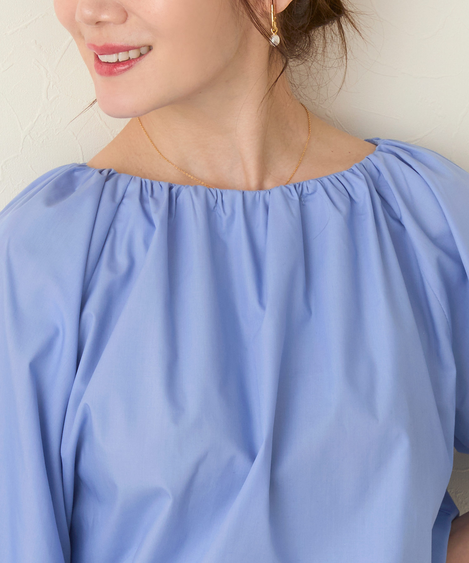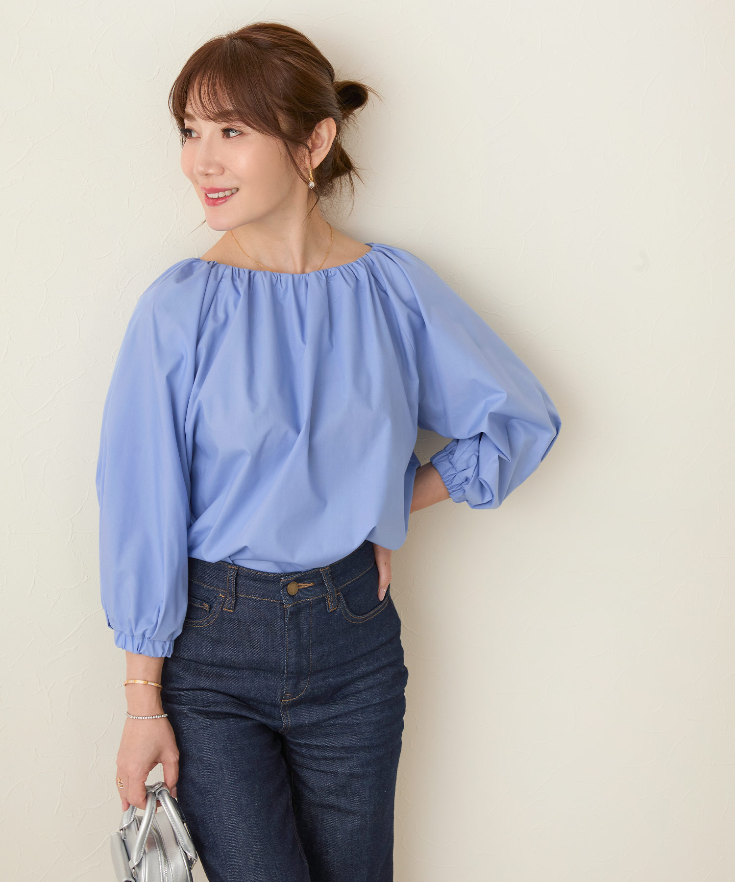 ブルベ夏の定番カラーであるサックスやホワイトの展開が魅力。シンプルな中にネックのギャザーや、ふんわりとした袖が施され、さりげなく華やか。ツルンとした艶のある素材が顔色を明るく見せ、品よく会話が弾みそうな一枚です。