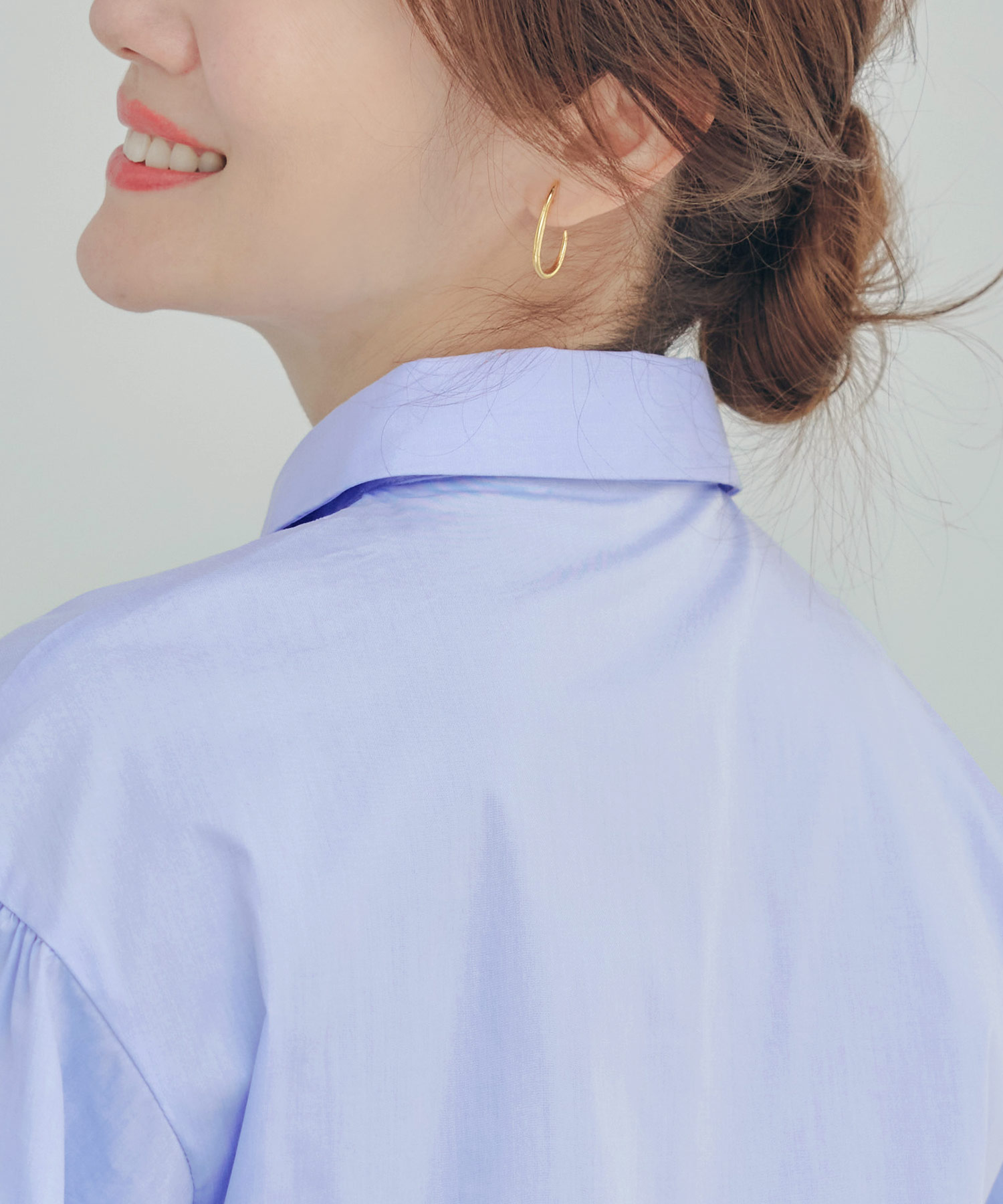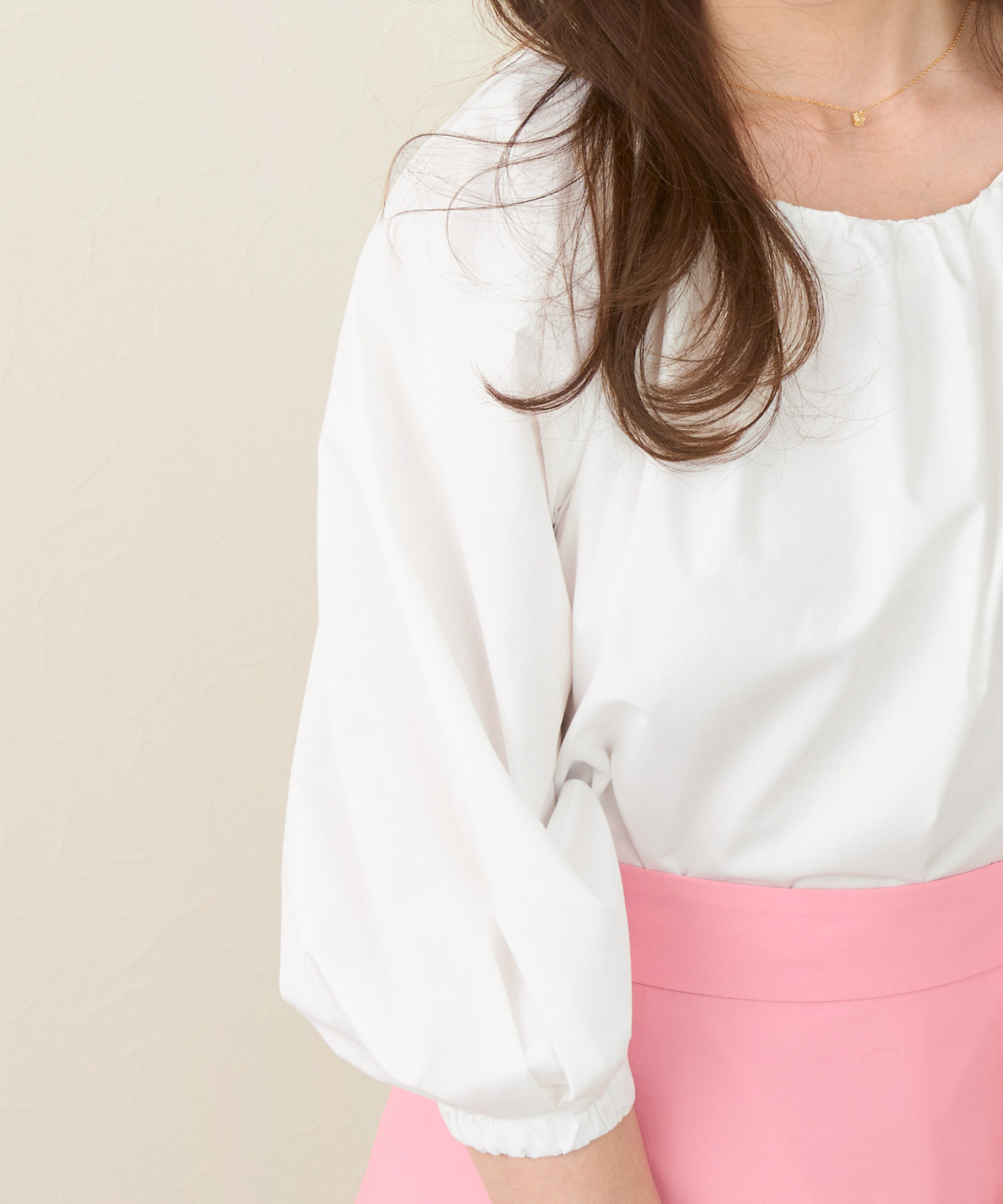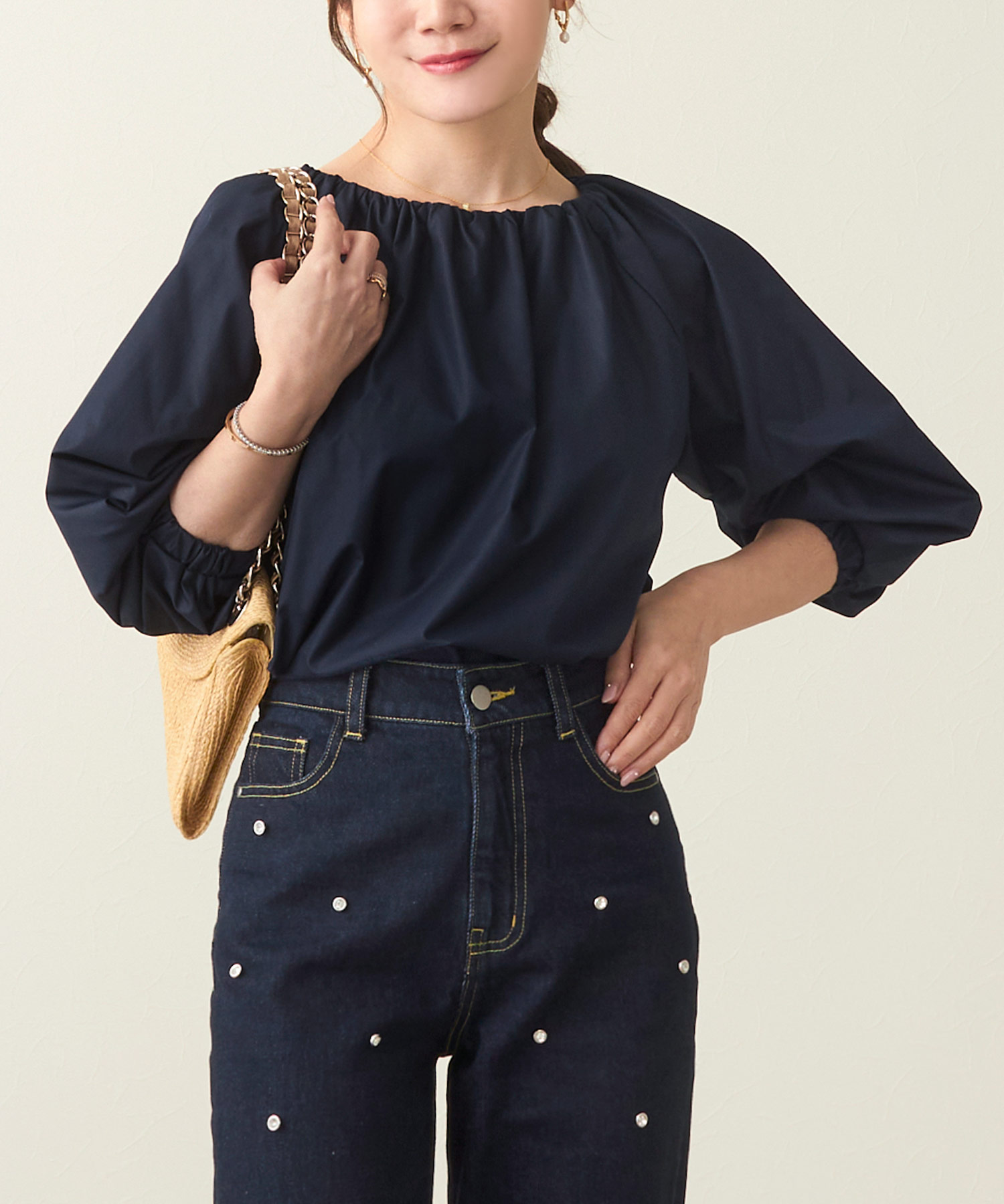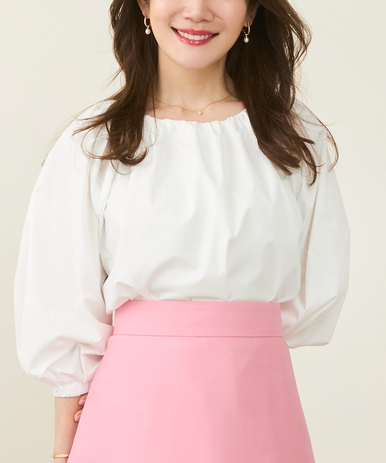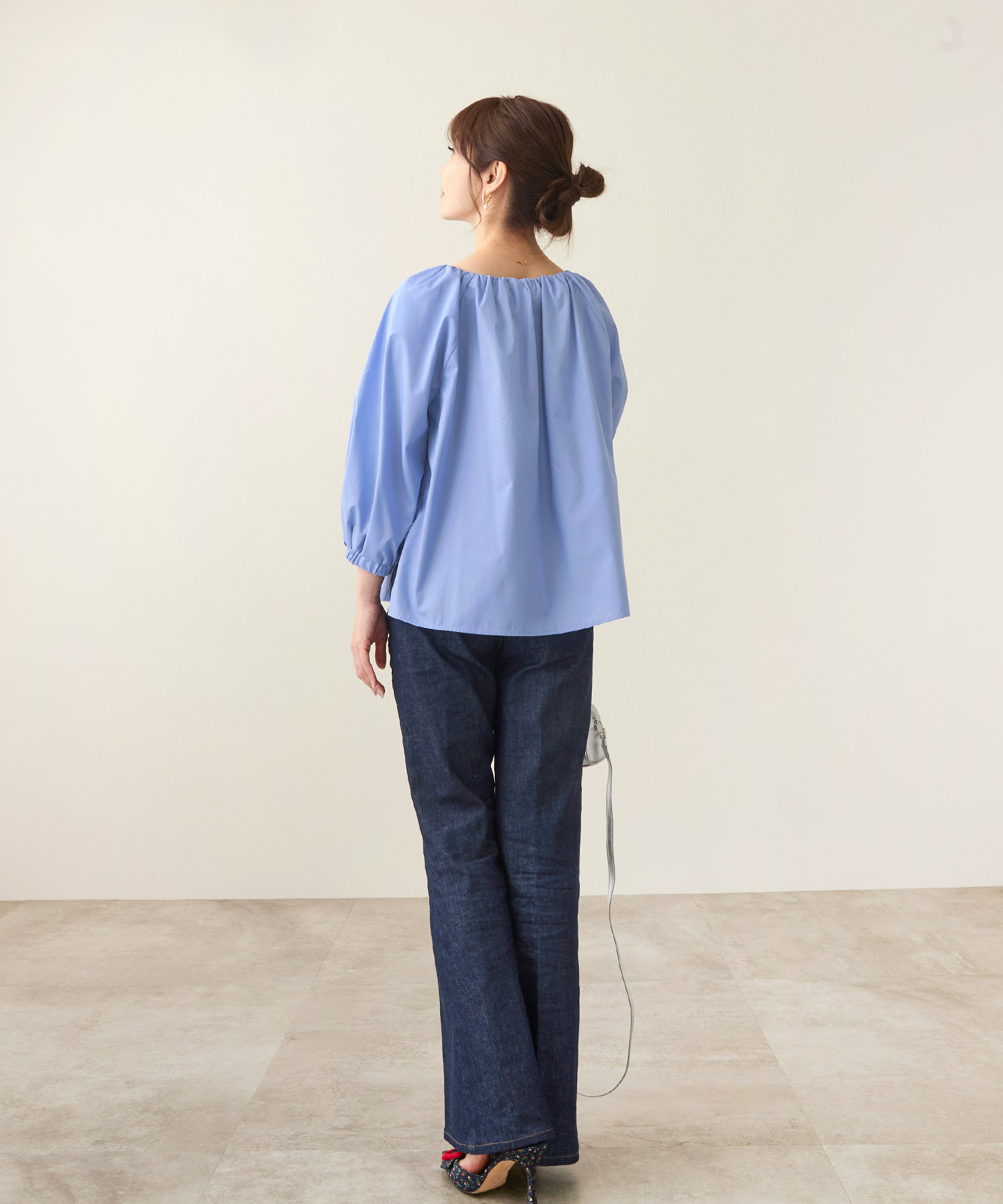 ブルベ夏の定番カラーであるサックスやホワイトの展開が魅力。シンプルな中にネックのギャザーや、ふんわりとした袖が施され、さりげなく華やか。ツルンとした艶のある素材が顔色を明るく見せ、品よく会話が弾みそうな一枚です。
