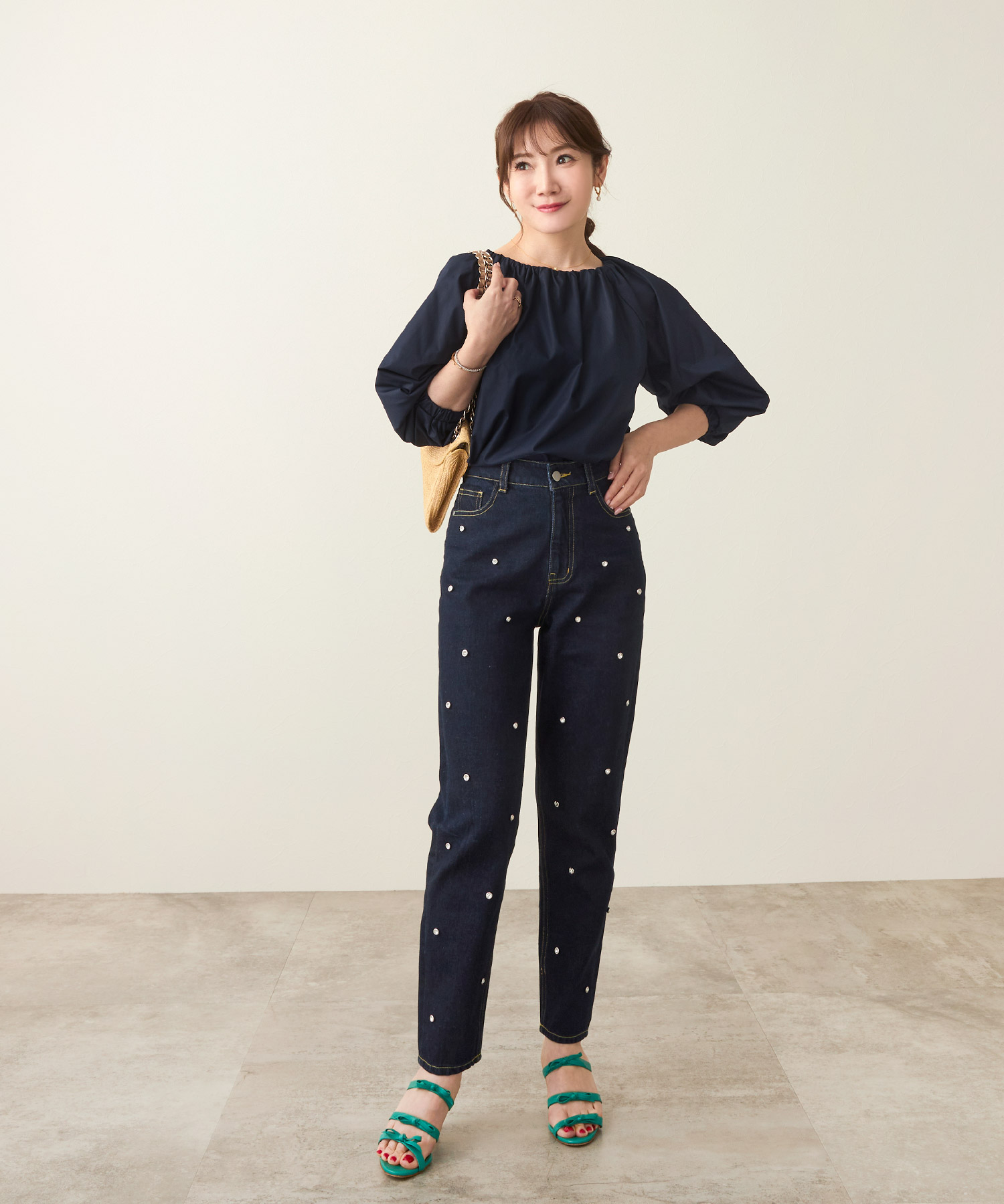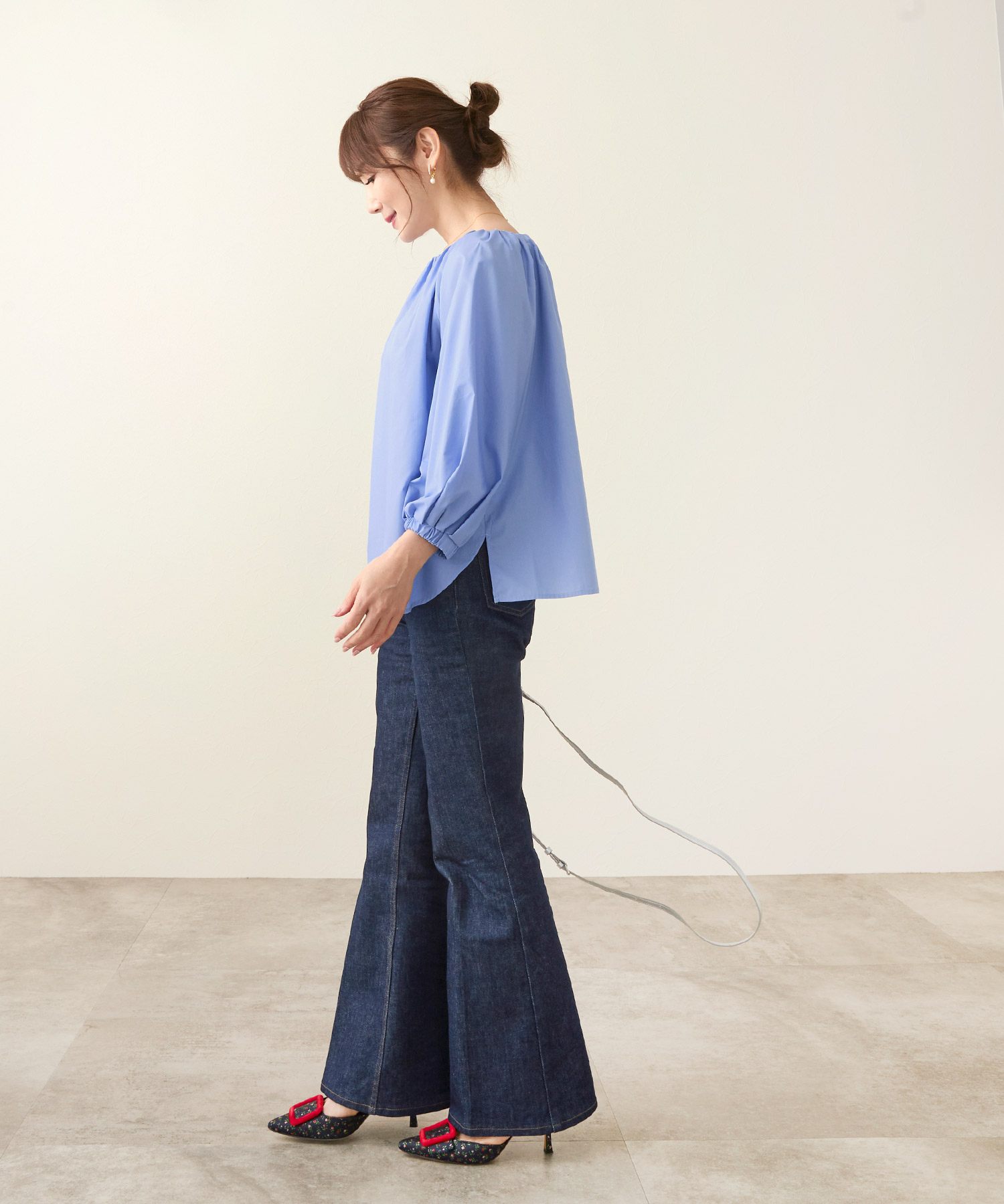 顔まわりを華やかに見せるフリルと、ふんわり丸みのあるランタンスリーブが印象的。ブルベ夏の肌に似合うサックスブルーやネイビーで、色味は控えめながら愛らしさを引き立ててくれます。パンツでもスカートでも好相性な万能アイテム。