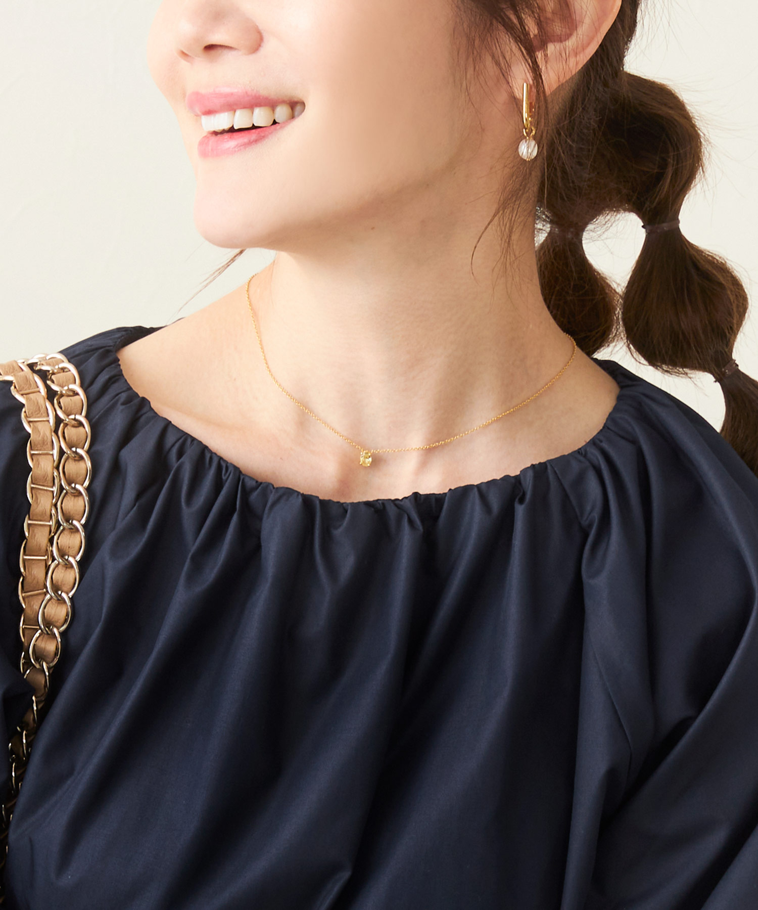 地味見えしやすい人の共通点は、“顔まわりに見どころがない”こと。特に初対面が多いシーンでは、視線を引きつけるポイントが顔まわりにあるかどうかが印象を左右します。《襟付き フリル ランタンスリーブ ブラウス(Liala×PG)》は、顔まわりにボリュームのあるフリルや襟があることで、自然と視線が集まり、上半身が華やかに見える設計。さらに耳元に小ぶりなパールや、首元に繊細なチェーンネックレスを添えるだけでも、印象の抜け感が変わります。