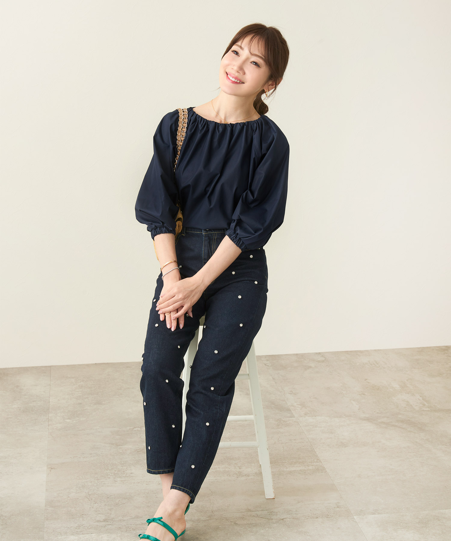 気合いを入れすぎない、でも少し可愛く見せたい日には、顔まわりにやわらかな動きのあるトップスを。大人の“可愛い”は、控えめな甘さにこそ宿ります。