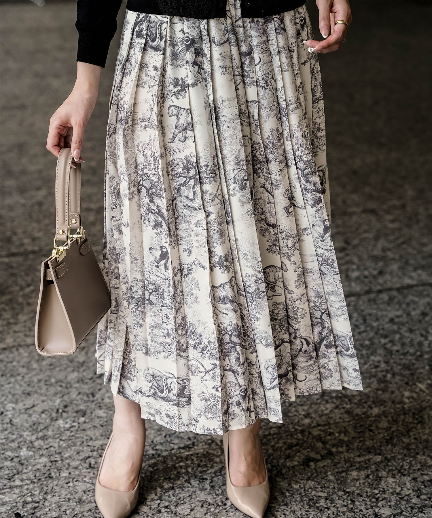 フランス伝統の〈トワルドジュイ柄〉を繊細なプリーツにのせた、クラシカルで品のある一枚。歩くたびにゆれるサテン素材が、光をやさしくまといながら秋の装いに華やかさを添えます。ウエストは総ゴム仕様で、着心地はストレスフリー。それでいて広がりすぎない美しい落ち感により、シルエットはすっきりと上品な印象に。ニットやシャツなどとも好相性で、季節の変わり目に活躍する頼れるアイテムです。
