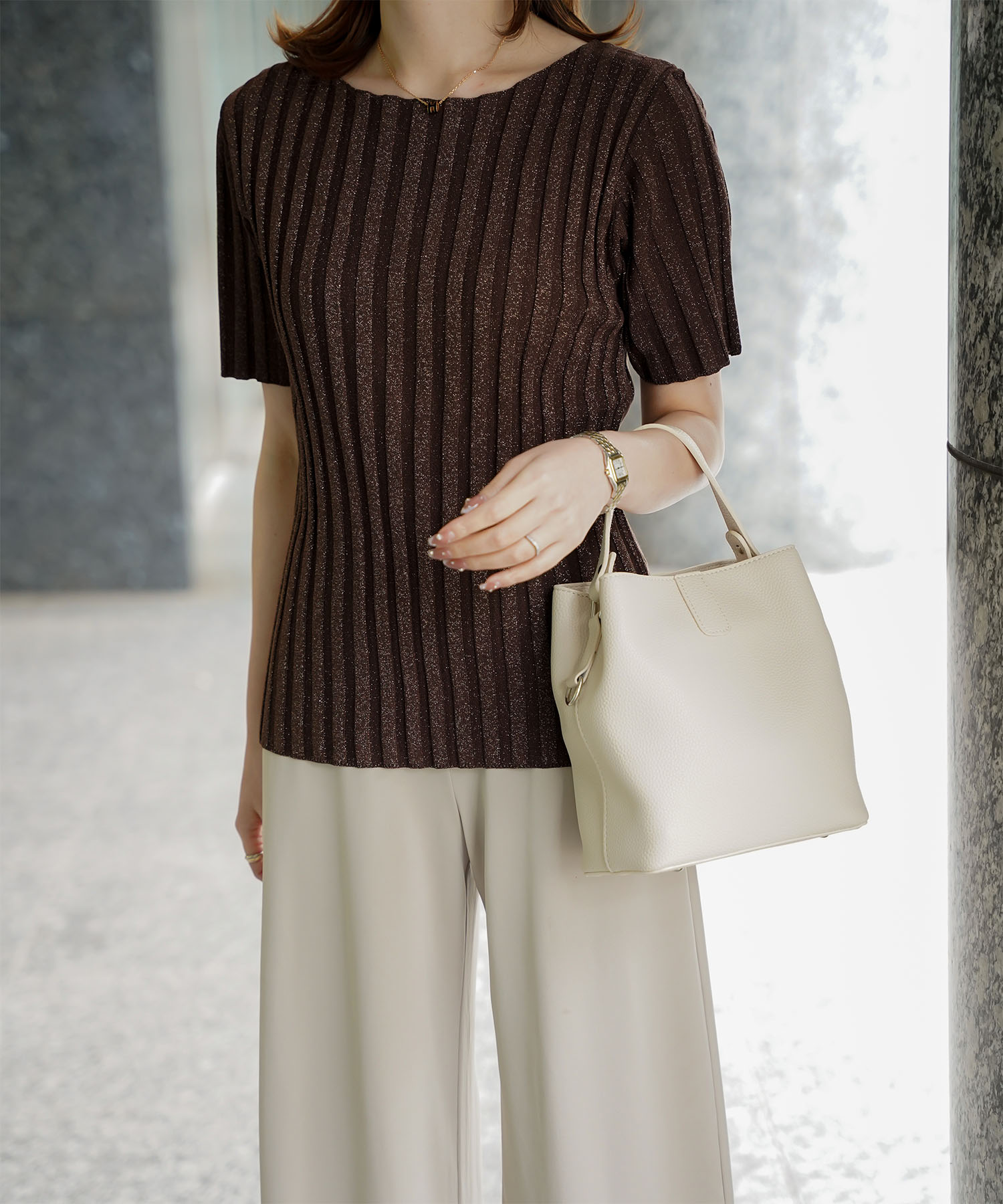 ほどよい光沢としなやかさが特徴のサマーニットに、エアリーなボウタイを添えた上品トップス。首元に表情をつくるボウタイは、ゆるく垂らせば抜け感を、結べばクラシカルな印象に。きちんと感を備えつつ、透けにくい編地で一枚でも安心して着用可能。さらりとした肌触りで、九月の残暑にもストレスフリーな着心地です。カラーはホワイト、サックス、ベージュ、ブラックの全4色。通勤、お呼ばれ、休日カフェまで——TPOを選ばず着映える万能アイテムです。