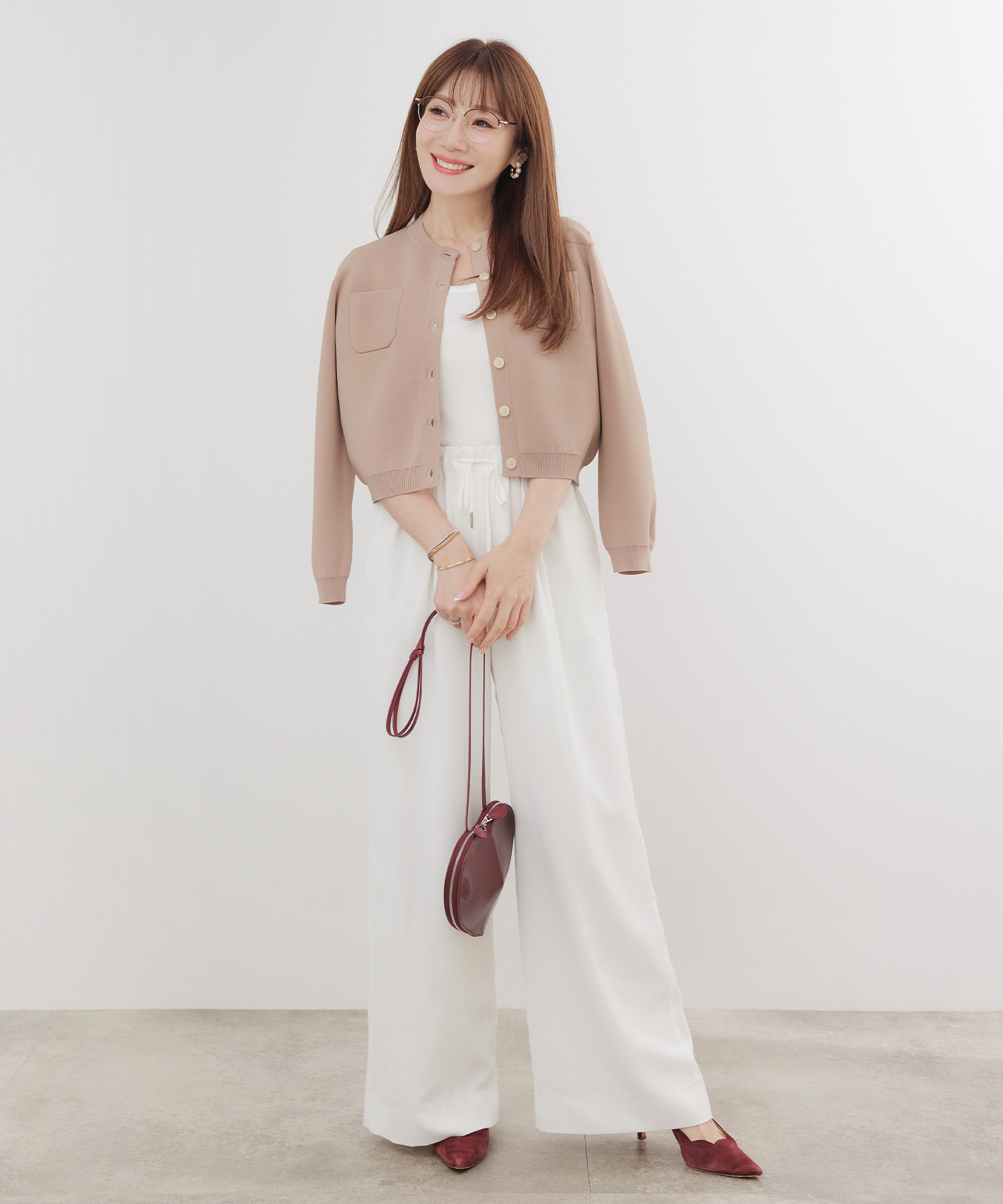 リモートワークの合間や、ちょっとした外出予定が入ったときこそ、“きちんと見え”を叶える小物が頼りに。足元には上品なフラットシューズを、バッグはかっちりめを選ぶだけで、一気に外出仕様の印象に。ジャケットを肩にかければ、好感度の高いきれいめスタイルが即完成します。