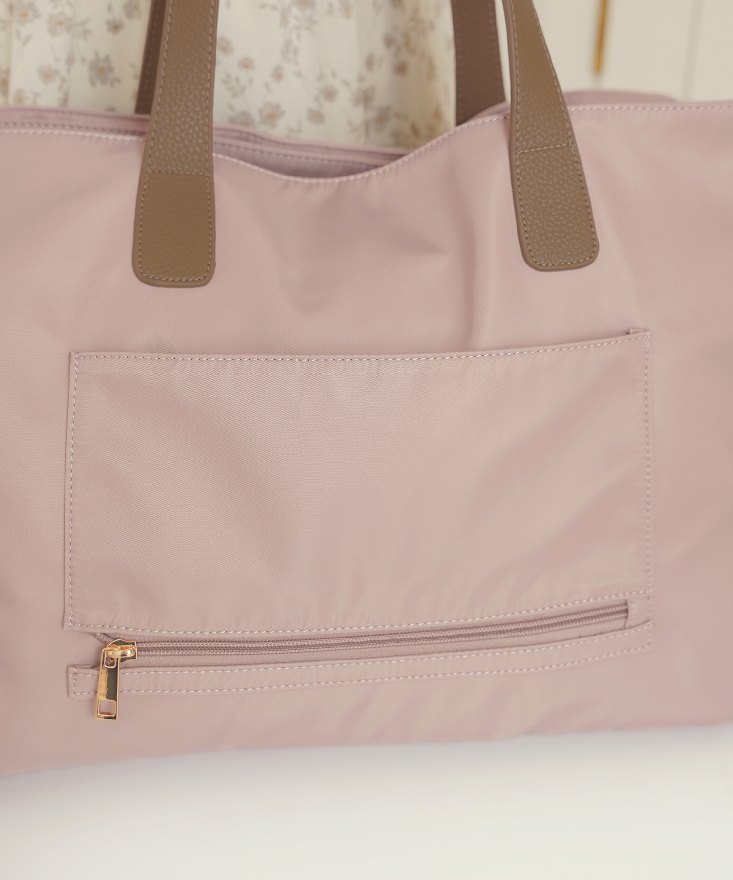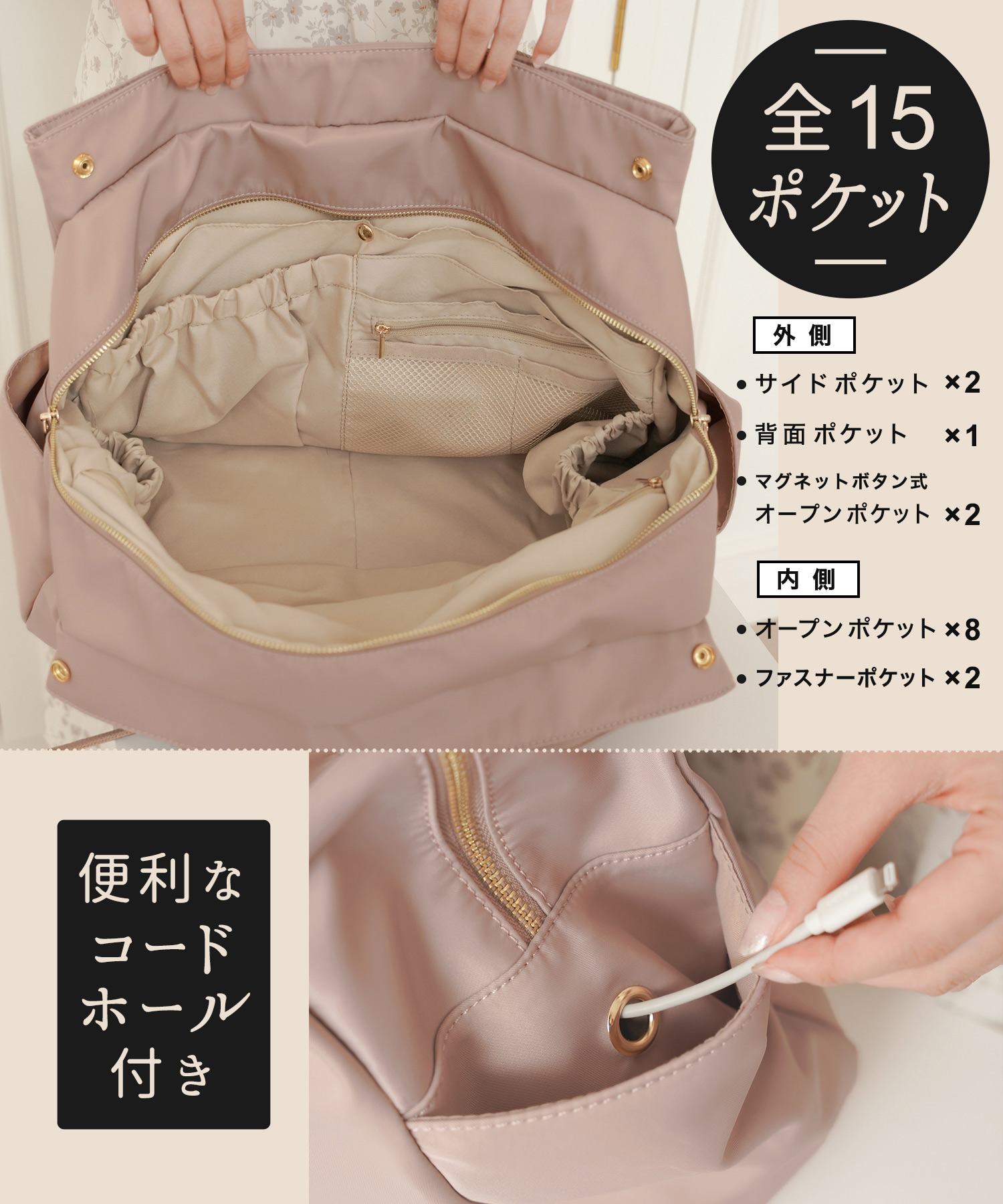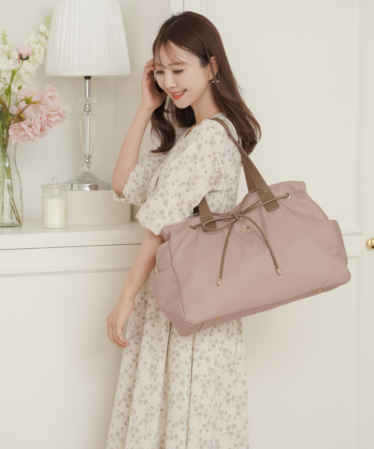 荷物が多くなりがちな日帰り旅に嬉しい、15ポケット仕様の大容量トートバッグ。軽やかなポリエステル素材を使用し、肩がけしても疲れにくく、移動の多い旅先でも快適に持ち運べます。フロントに添えたレザー調リボンが、実用性の中にもフェミニンなムードをプラス。ピンクモカ・バーガンディー・グレージュなど、豊富なカラーバリエーションで、旅先コーデにも馴染みます。機能性と見た目を両立した、頼れる大人の旅バッグです。