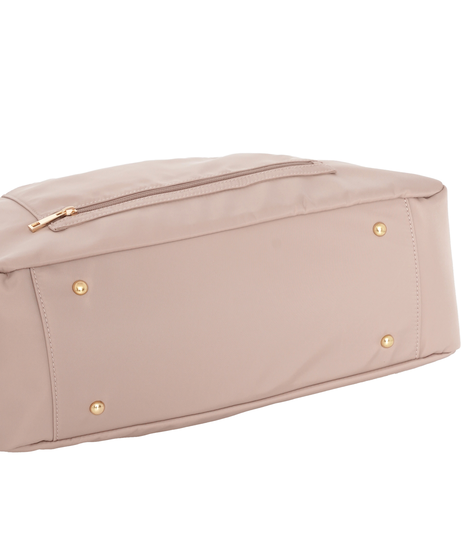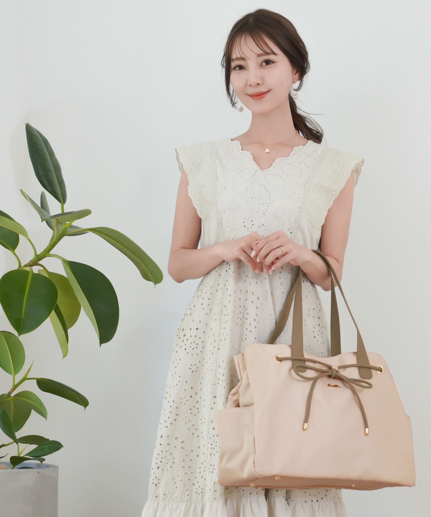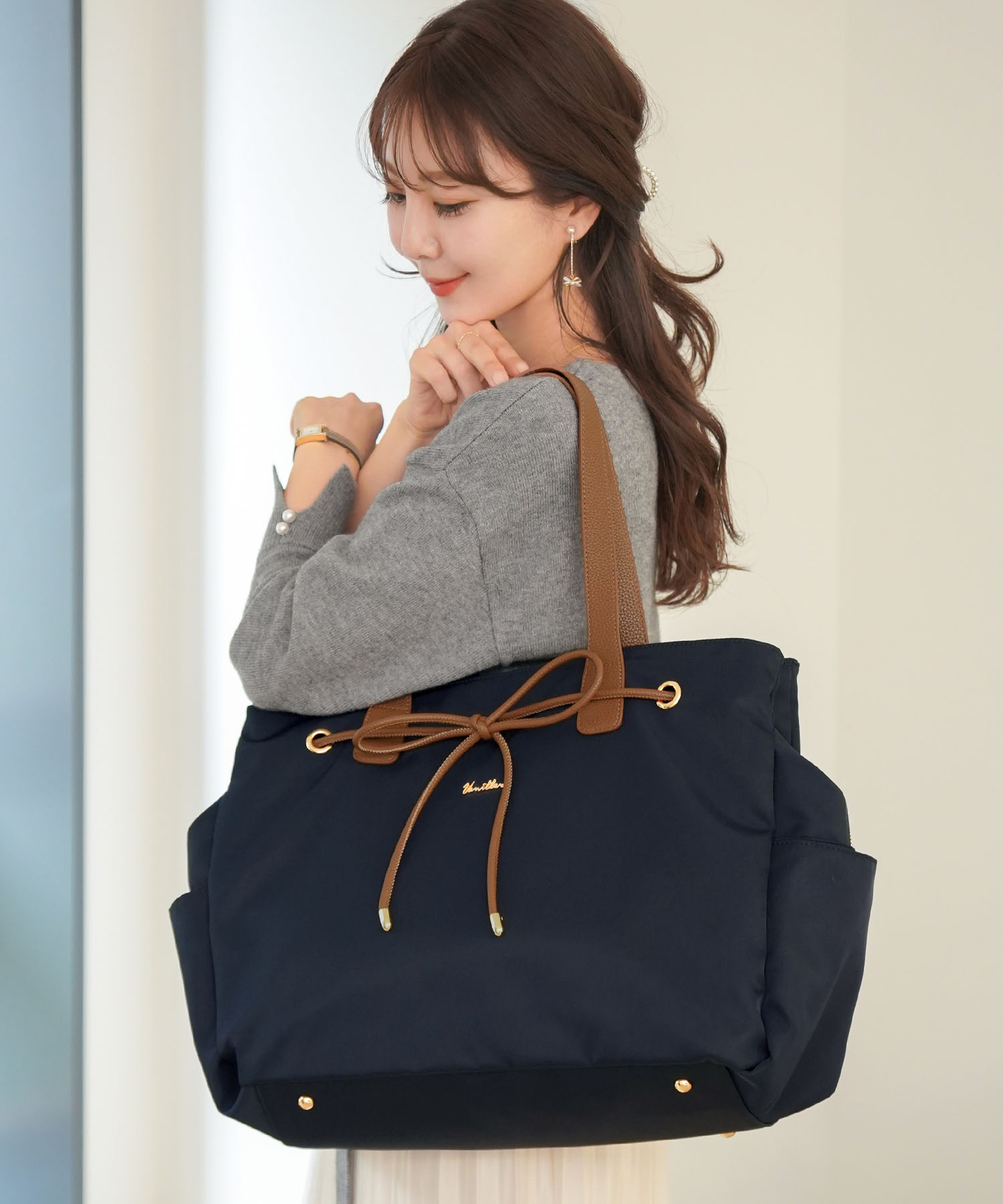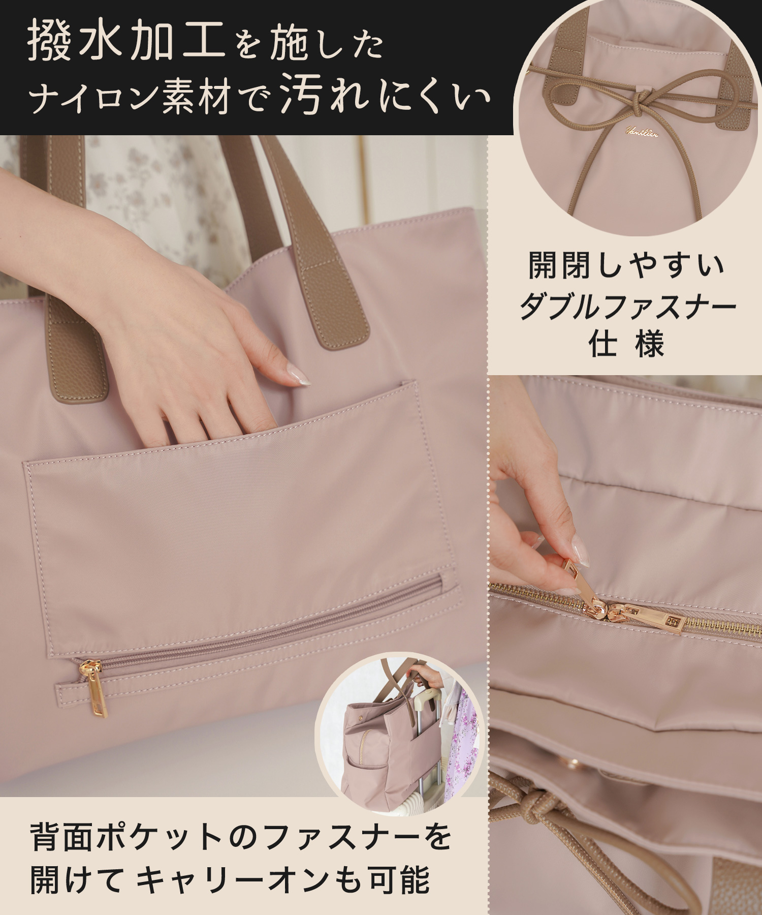 荷物が多くなりがちな日帰り旅に嬉しい、15ポケット仕様の大容量トートバッグ。軽やかなポリエステル素材を使用し、肩がけしても疲れにくく、移動の多い旅先でも快適に持ち運べます。フロントに添えたレザー調リボンが、実用性の中にもフェミニンなムードをプラス。ピンクモカ・バーガンディー・グレージュなど、豊富なカラーバリエーションで、旅先コーデにも馴染みます。機能性と見た目を両立した、頼れる大人の旅バッグです。
