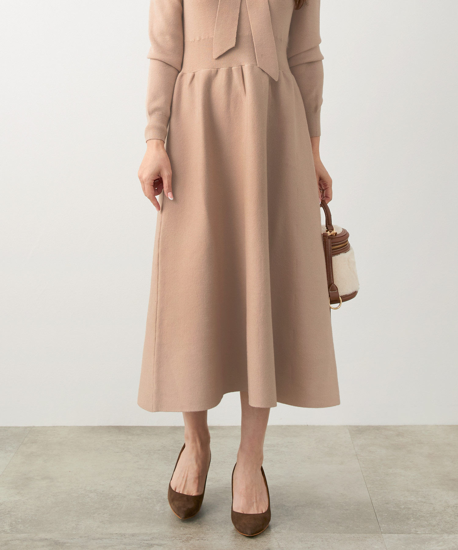 編み地に変化をつけて体のラインを拾いにくく、ふんわり広がるスカートが座ったときも美しく映えます。レビューでは「生地がしっかりして温かく冬のお出かけに活躍」「スカート部分が肉厚なので透けやラインを気にせず着られる」「スタイルアップして着痩せして見える」といった声が寄せられ、上品さと実用性を兼ね備えた1枚です。