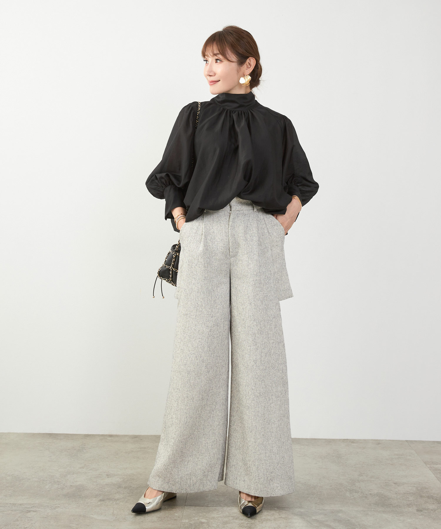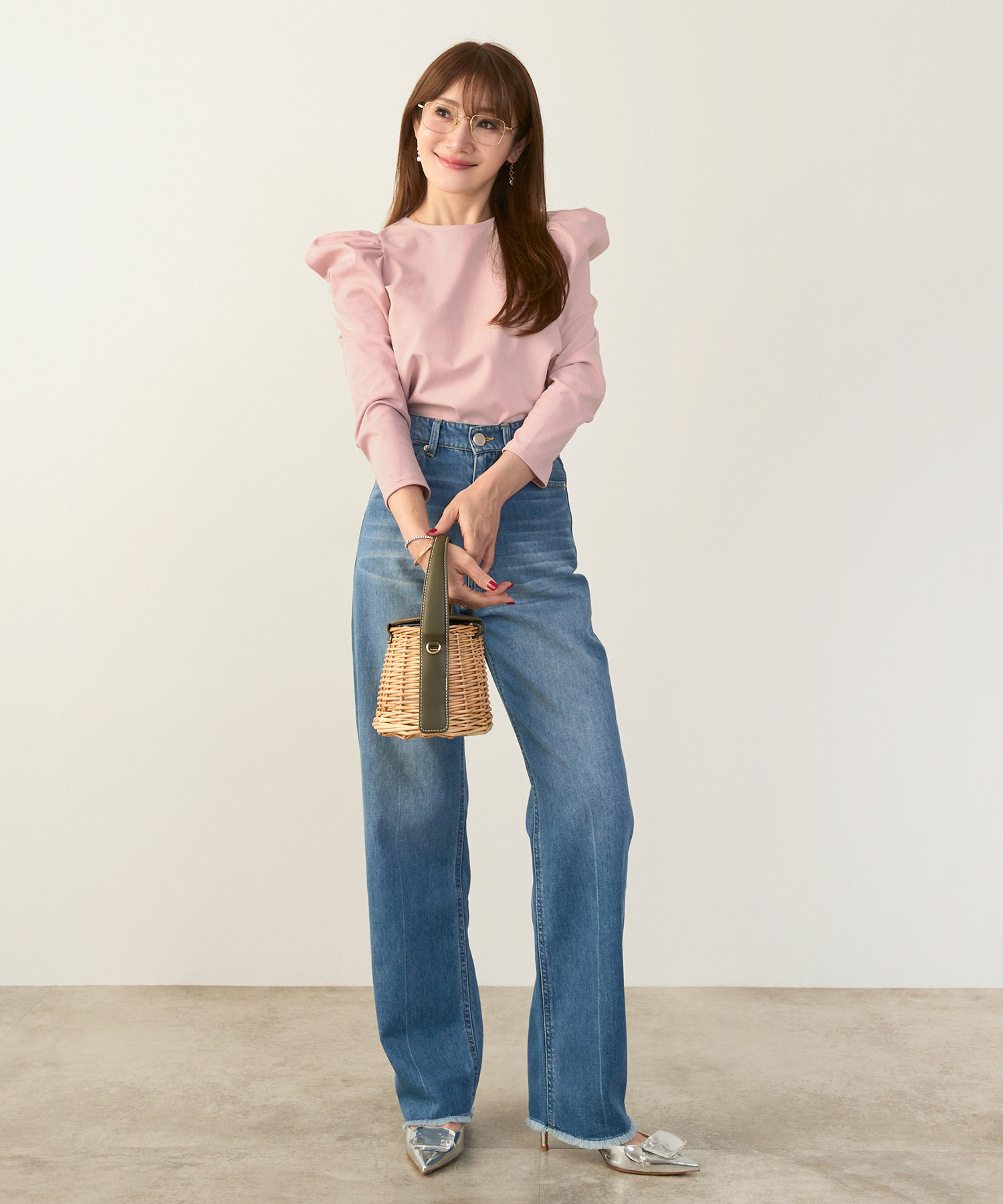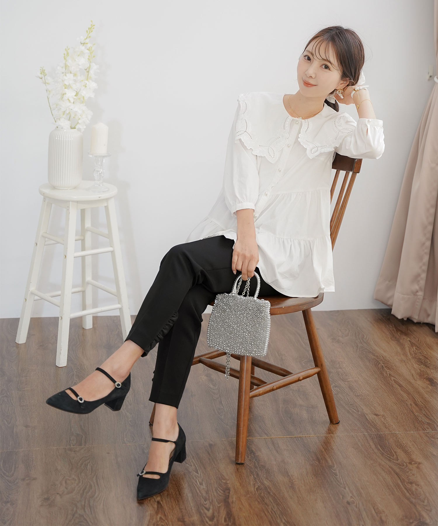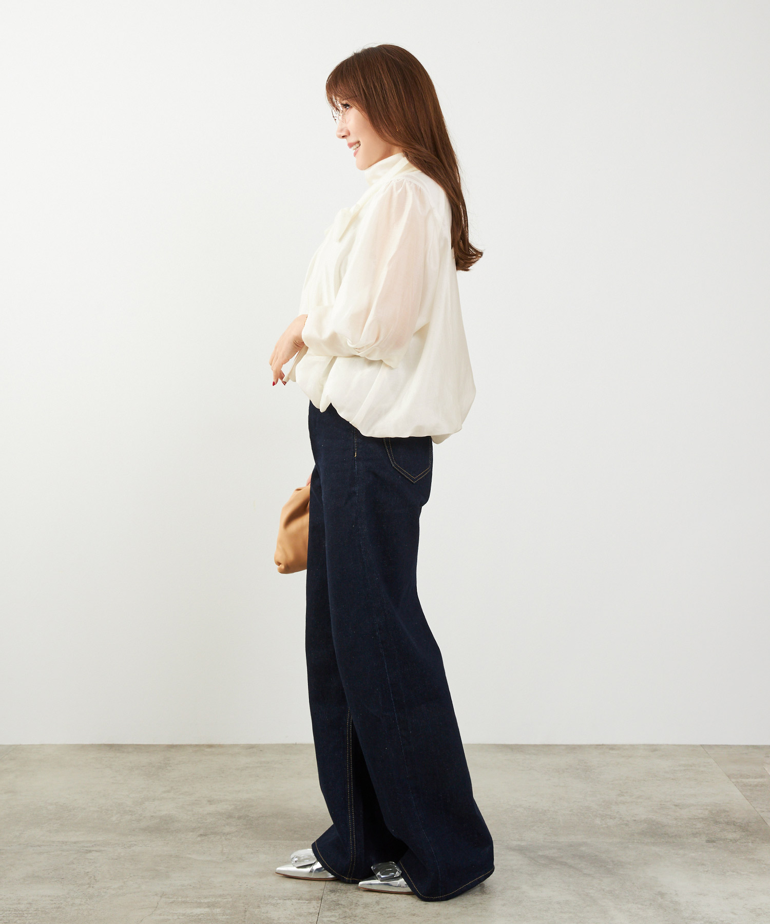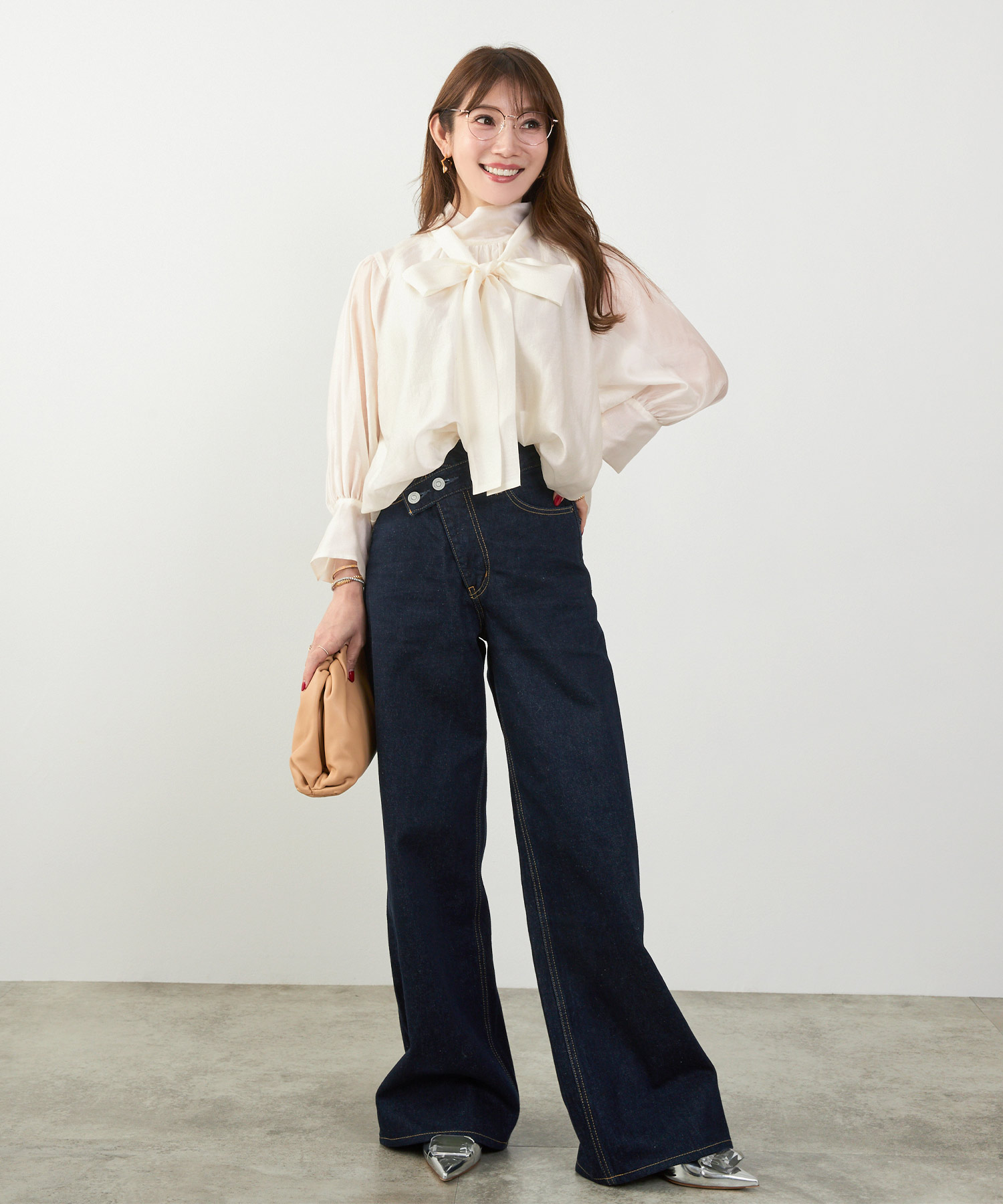 二の腕はフリル袖・七分丈、脚はハイウエスト+縦ライン、顔色は淡色トップスで血色感アップ。視線を上に集める設計が全体のバランスも整えます。