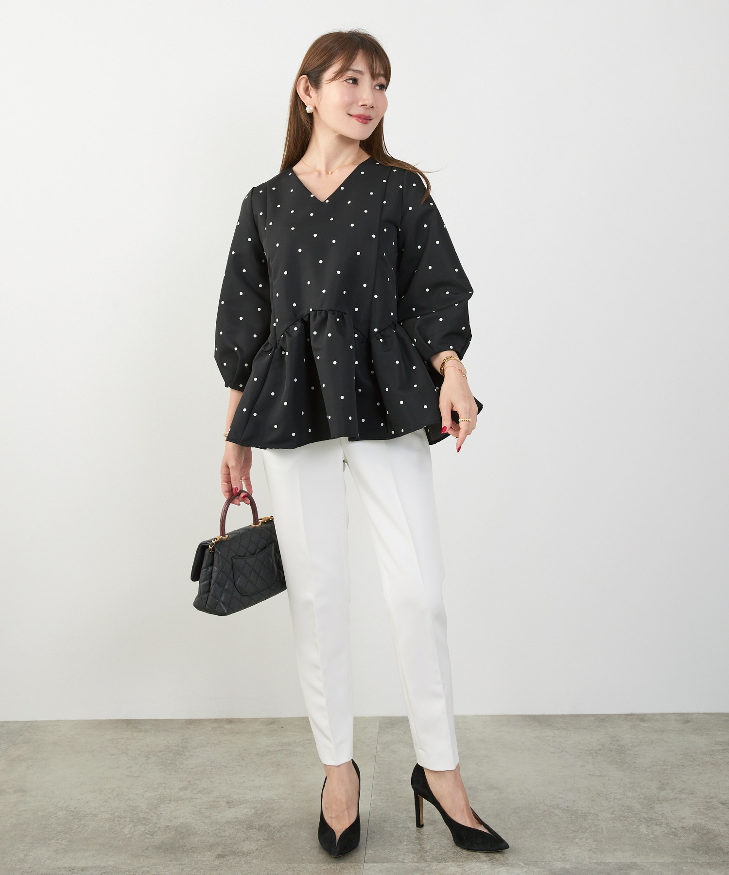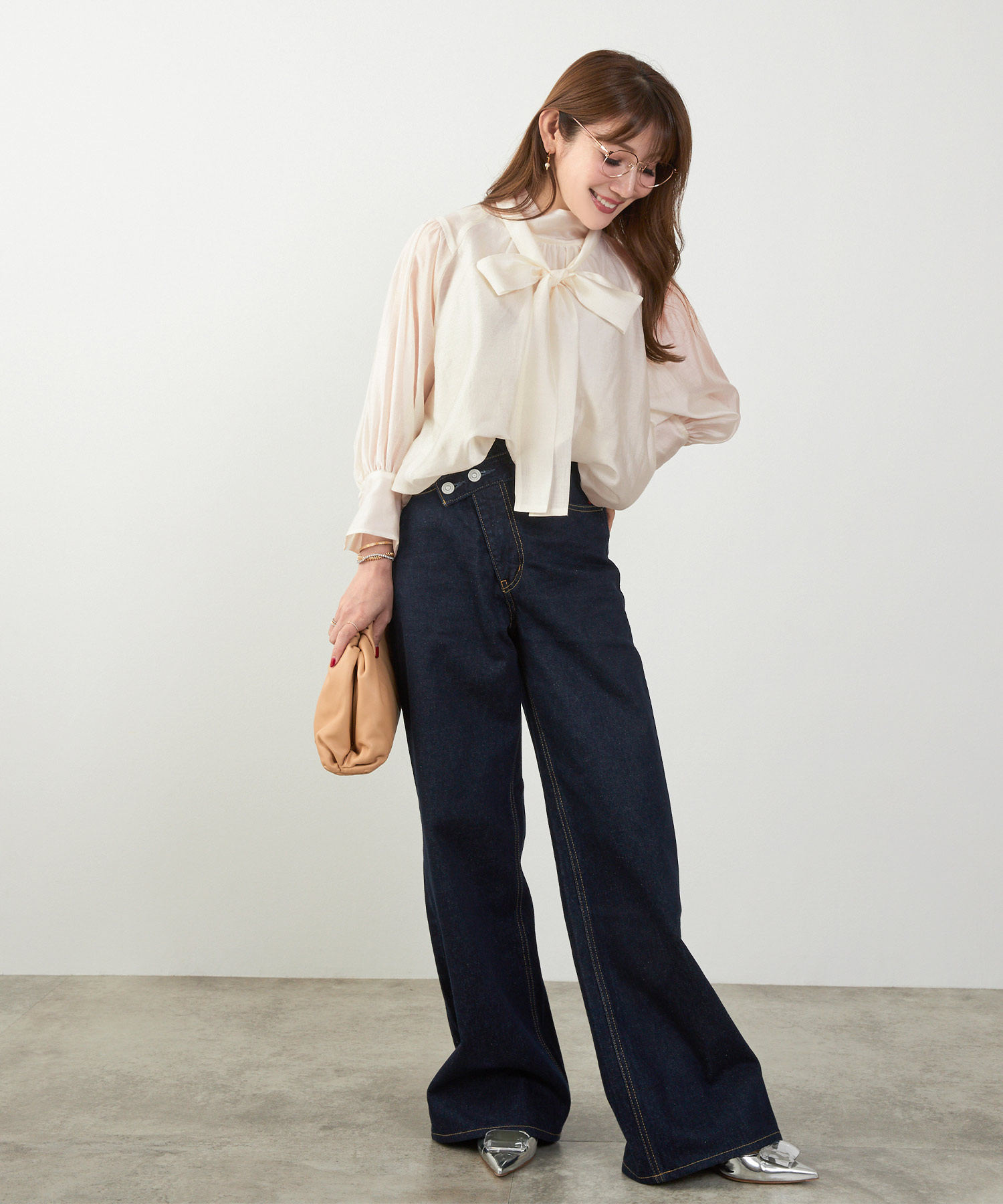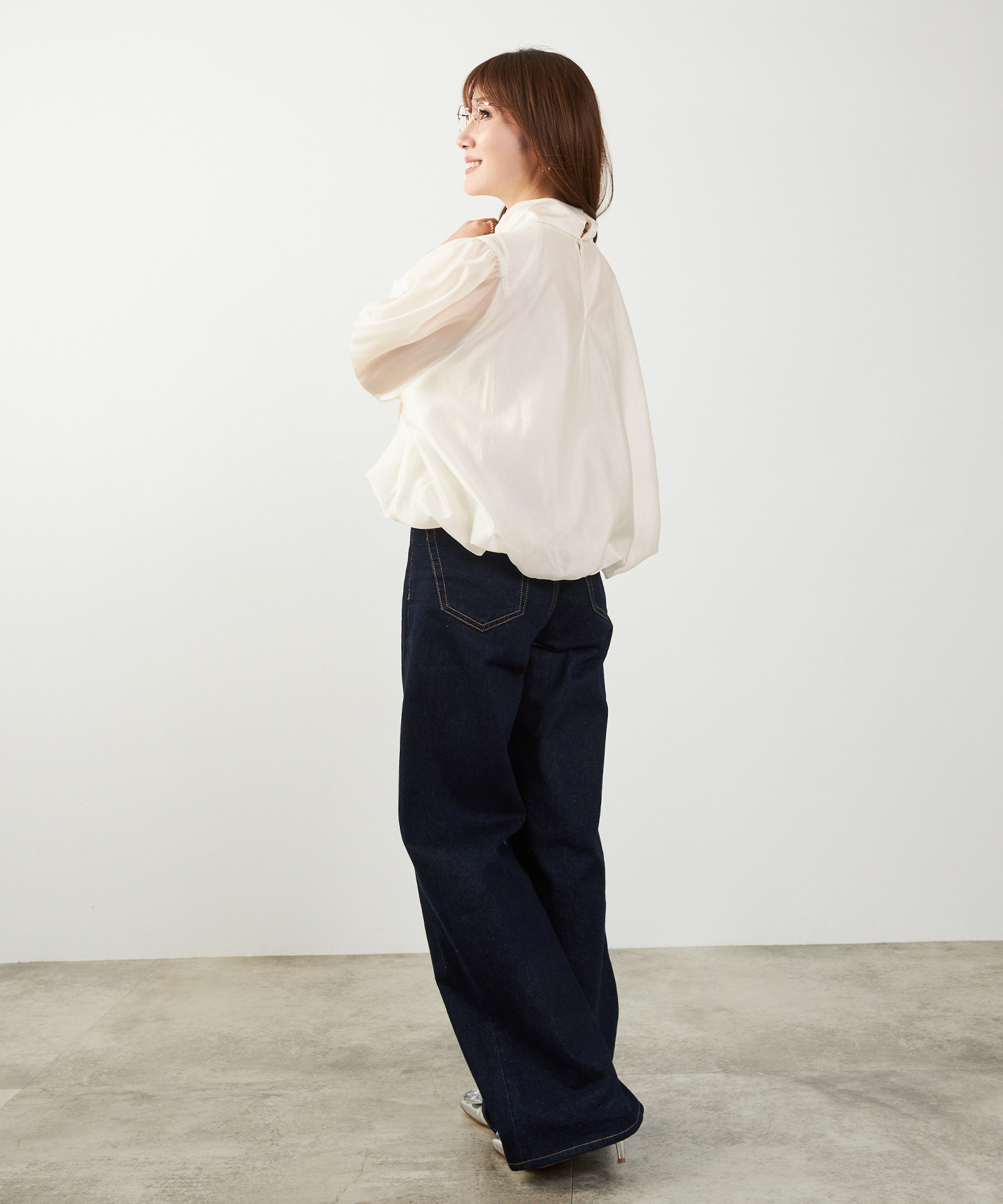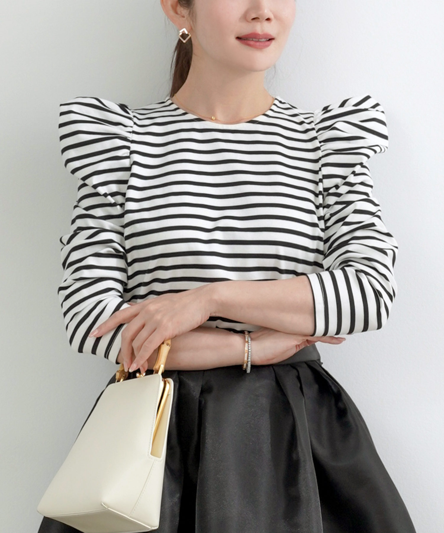 二の腕はフリル袖・七分丈、脚はハイウエスト+縦ライン、顔色は淡色トップスで血色感アップ。視線を上に集める設計が全体のバランスも整えます。
