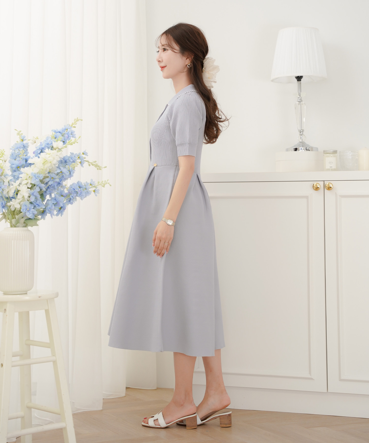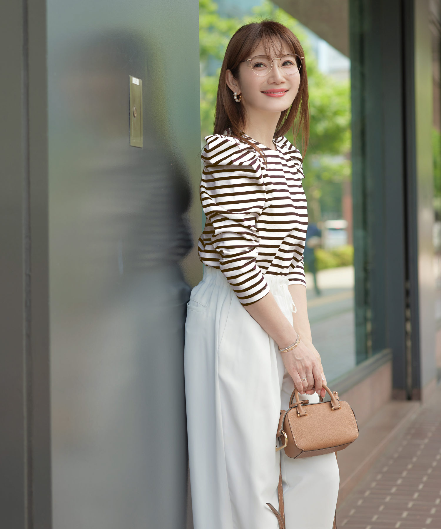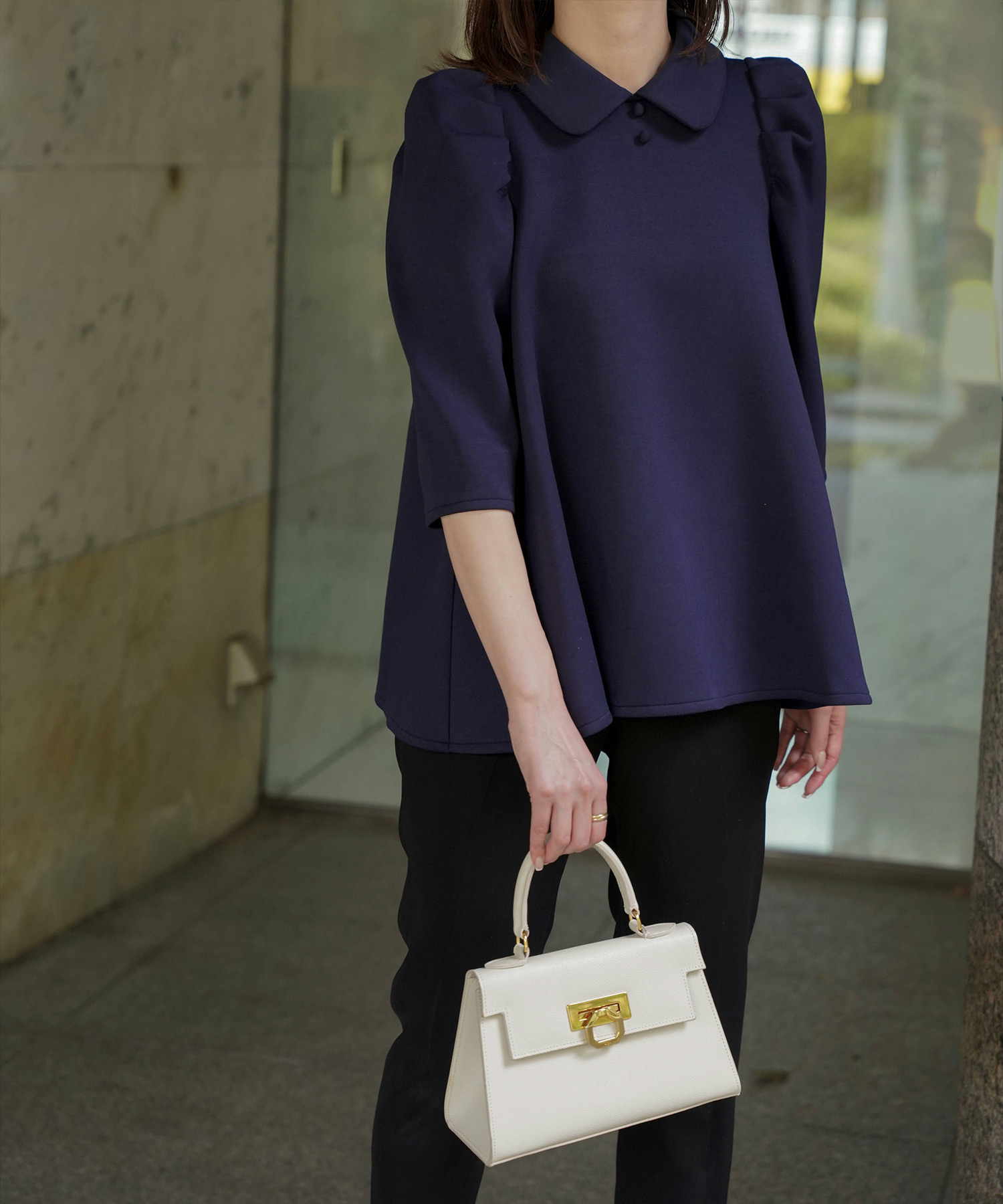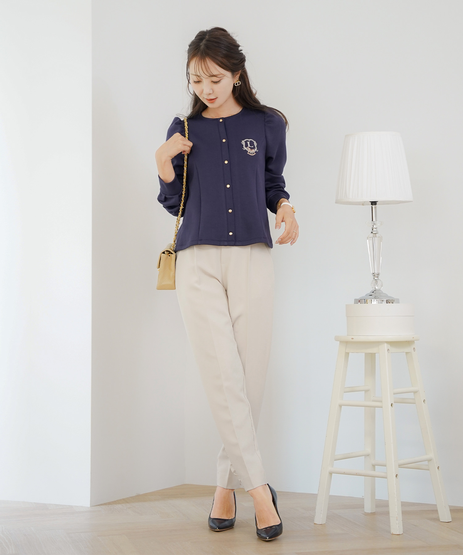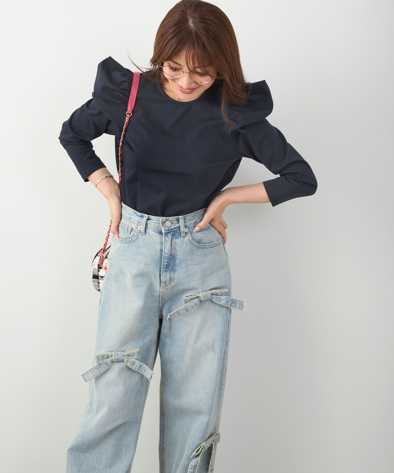 二の腕はフリル袖・七分丈、脚はハイウエスト+縦ライン、顔色は淡色トップスで血色感アップ。視線を上に集める設計が全体のバランスも整えます。