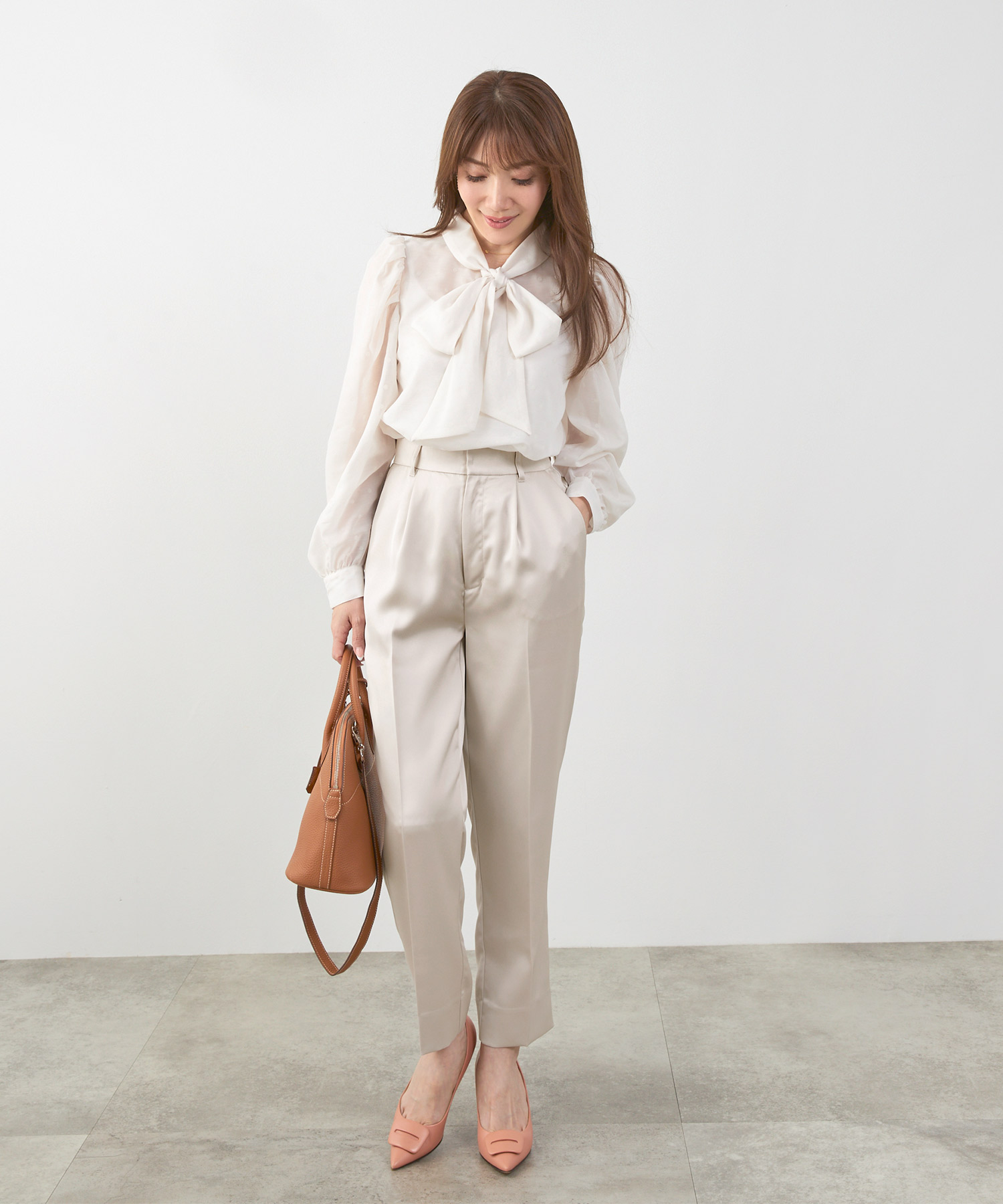 動きやすく「きれい見え」するテーパードやサテンのセンタープレスが便利です。足元はフラット〜ミドルヒールで無理のない高さを選ぶと実用性と上品さを両立できます。