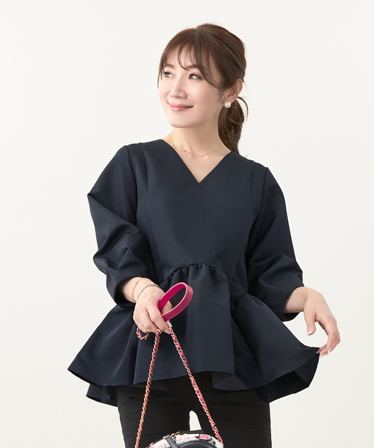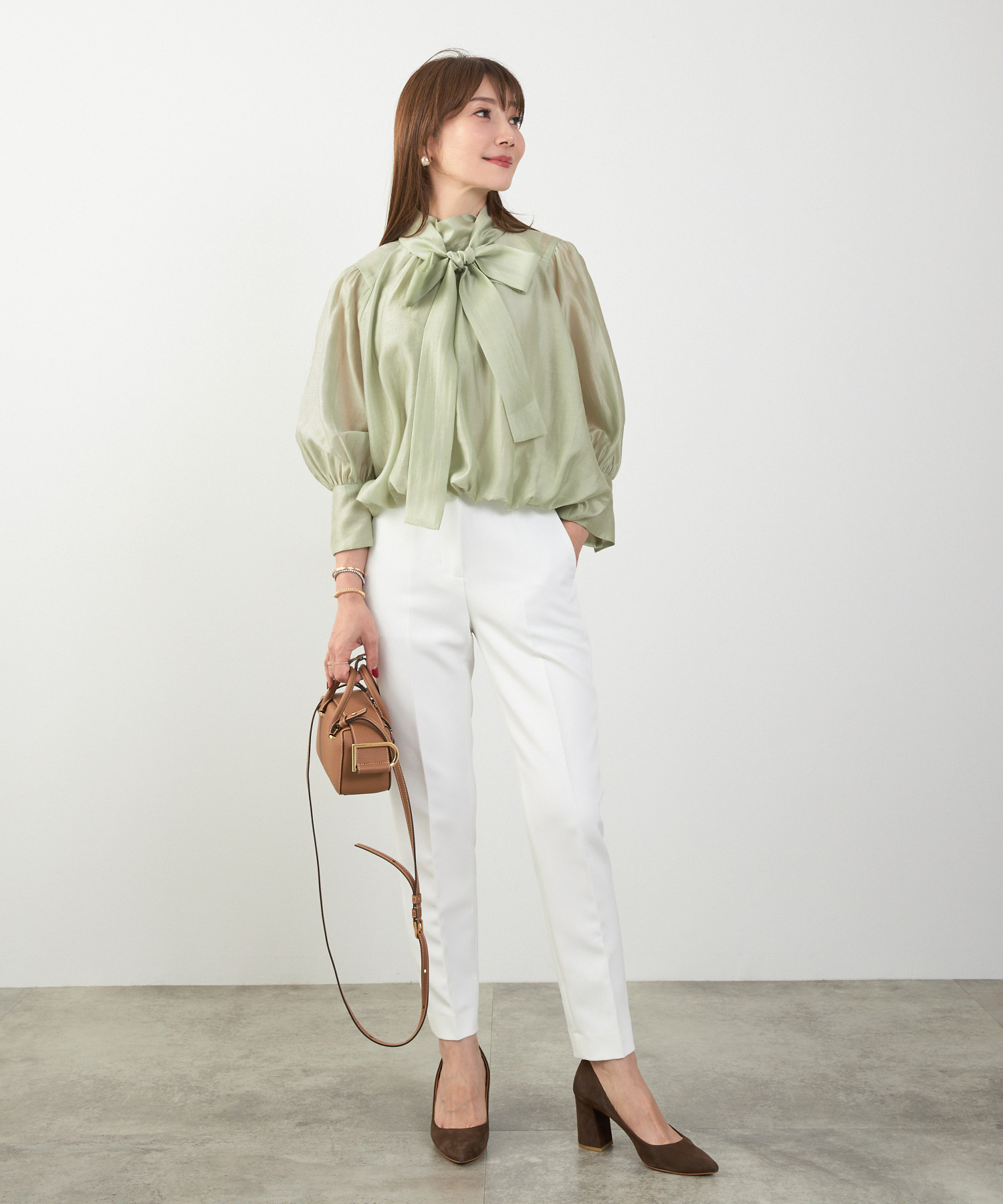 「一点主役」が基本。襟付きやボウタイなどデザイン性のあるトップスならアクセは控えめに、シンプル服ならスカーフやイヤーアクセで顔周りを華やかにするとバランス良くまとまります。