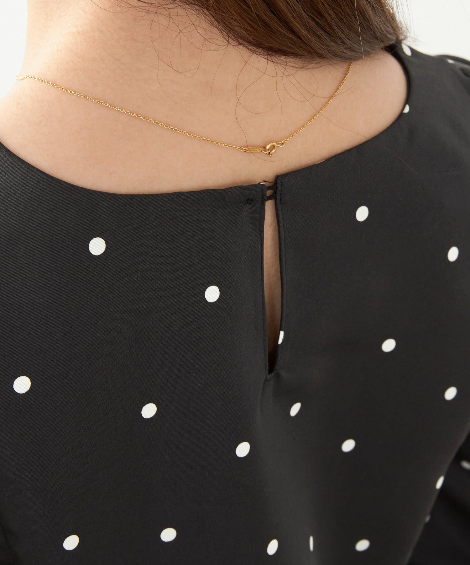 襟元や袖のスカラップが可憐な印象を与えるブラウス。レビューでは「Sサイズでも余裕があり着やすい」「洗濯してもシワになりにくい」といった声があり、デザイン性と実用性を兼ね備えています。ドット柄は上品で、ランチやディナーデートで映える一枚です。