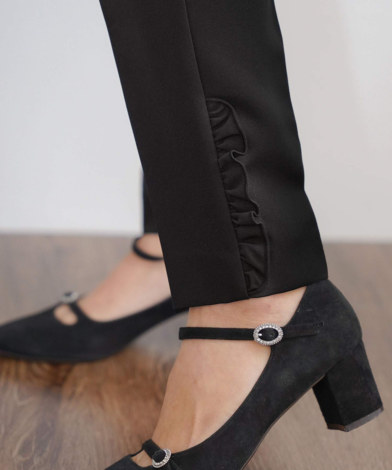 裾に小さなフリルを施したデザインで、シンプルなテーパードパンツにフェミニンな要素をプラス。柔らかな雰囲気を添えてくれるため、Tシャツやブラウスと合わせるだけで、気取らないけれど可愛らしい印象に。公園や休日のランチなど、アクティブなデートにも最適です。