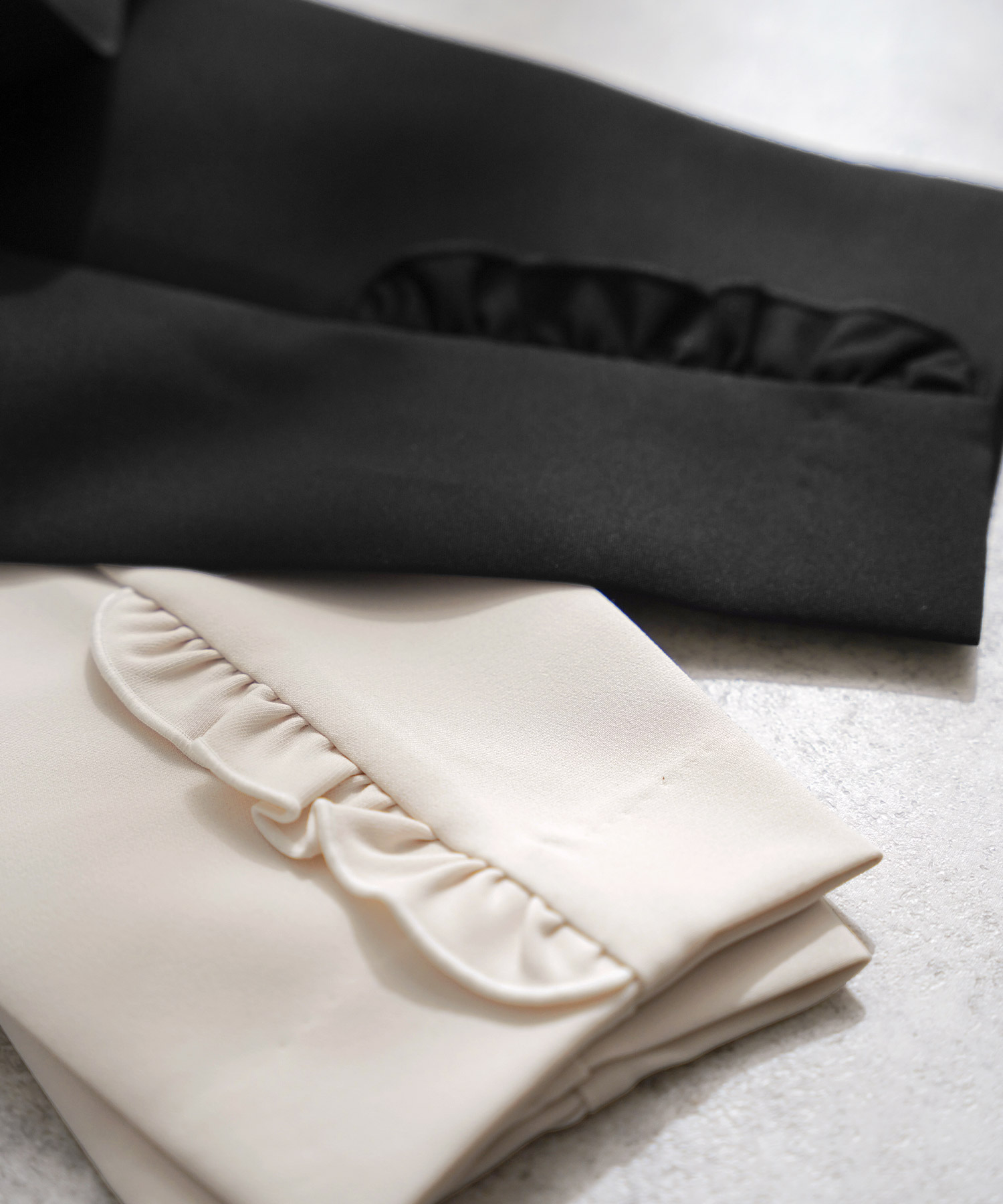 テーブル越しに見える上半身を重視。襟・ボウタイ・レースなど顔周りにポイントのあるトップスやワンピースを選び、淡色やブルーグレーなど肌映えする色を合わせると効果的です。