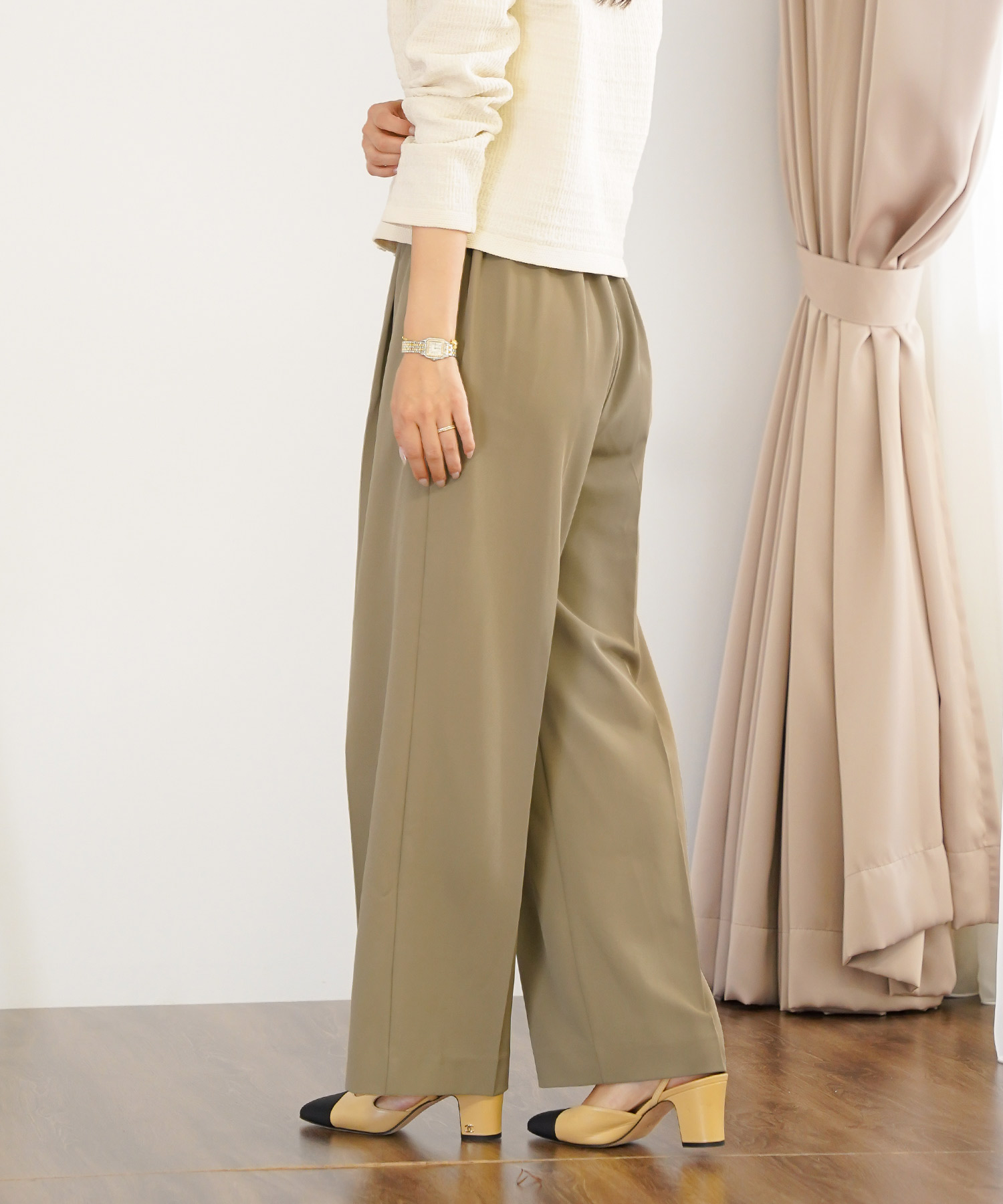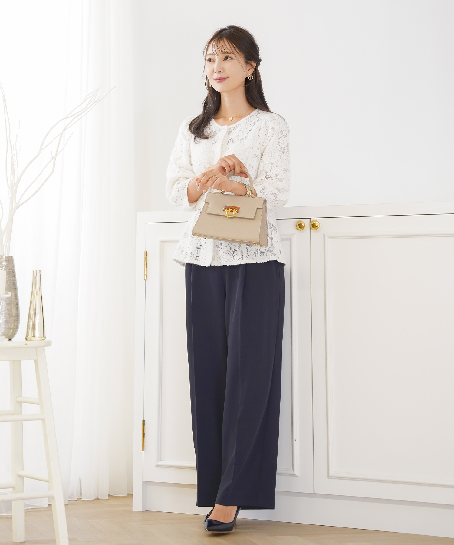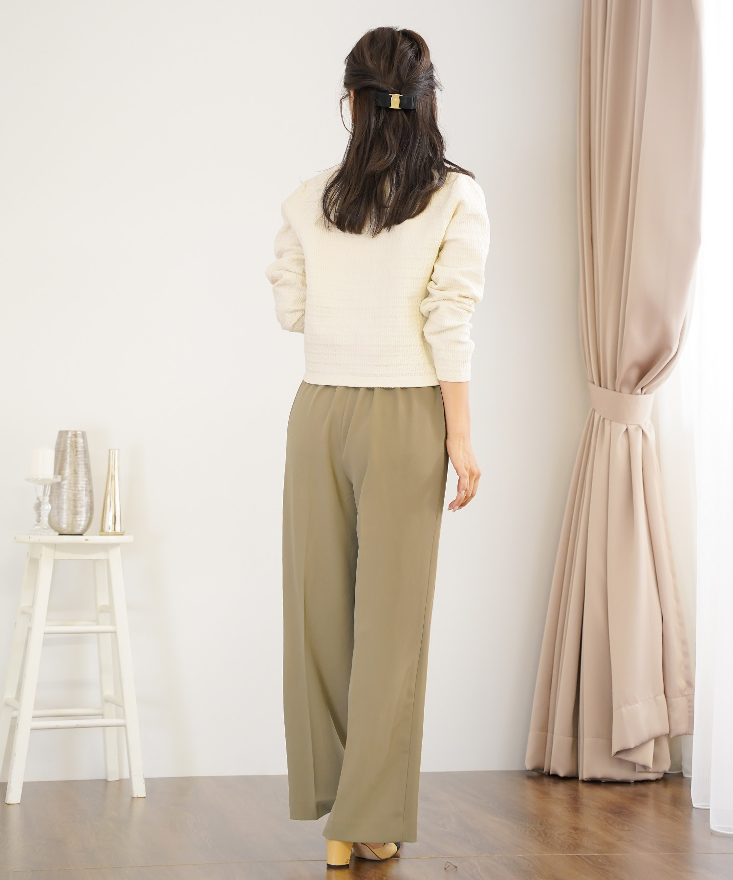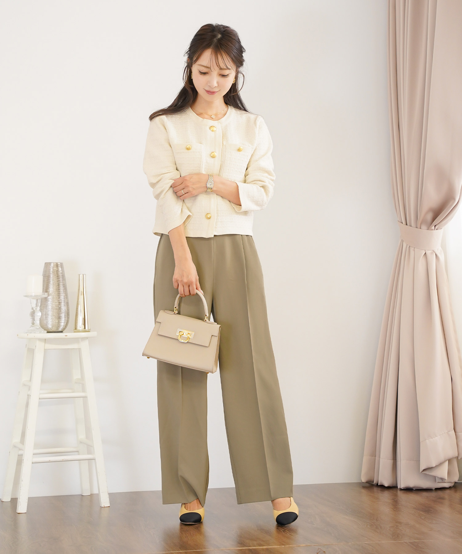 • このとき、靴はベージュまたはメタリックにすると、下半身の重さが引き算され、低身長さんでもすっきり見えます。