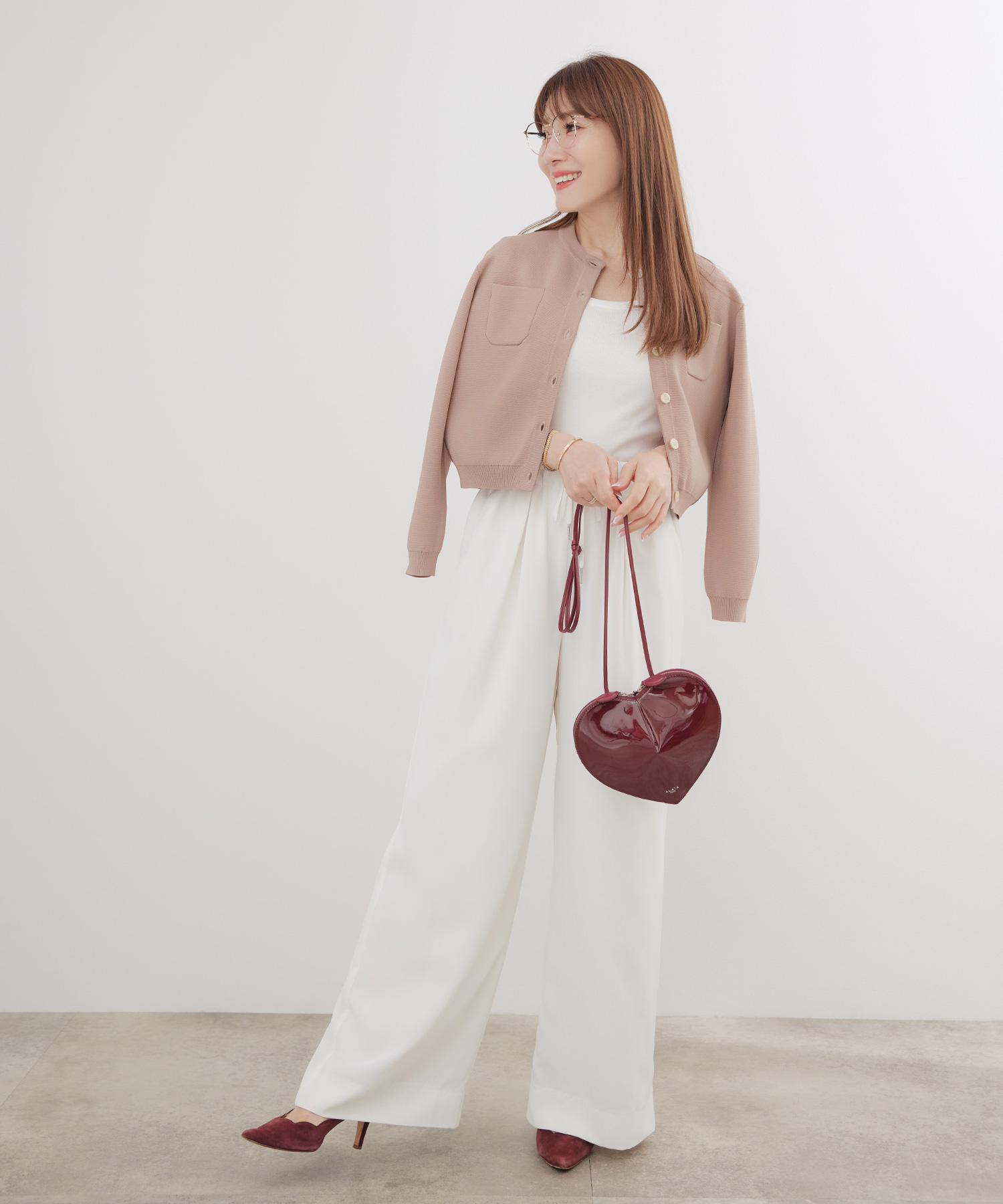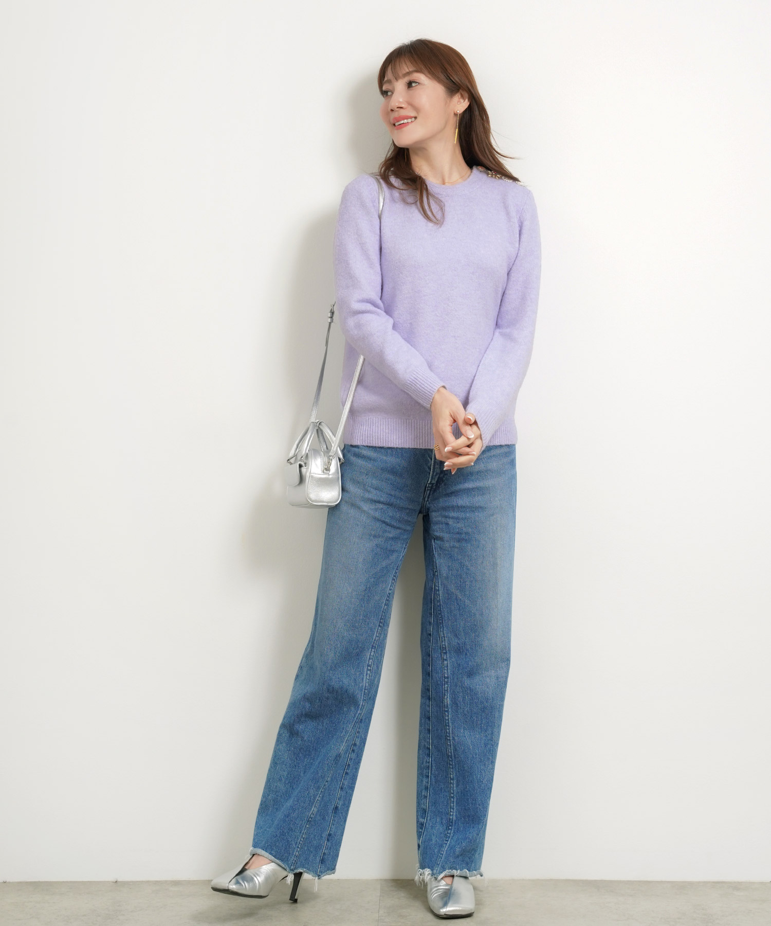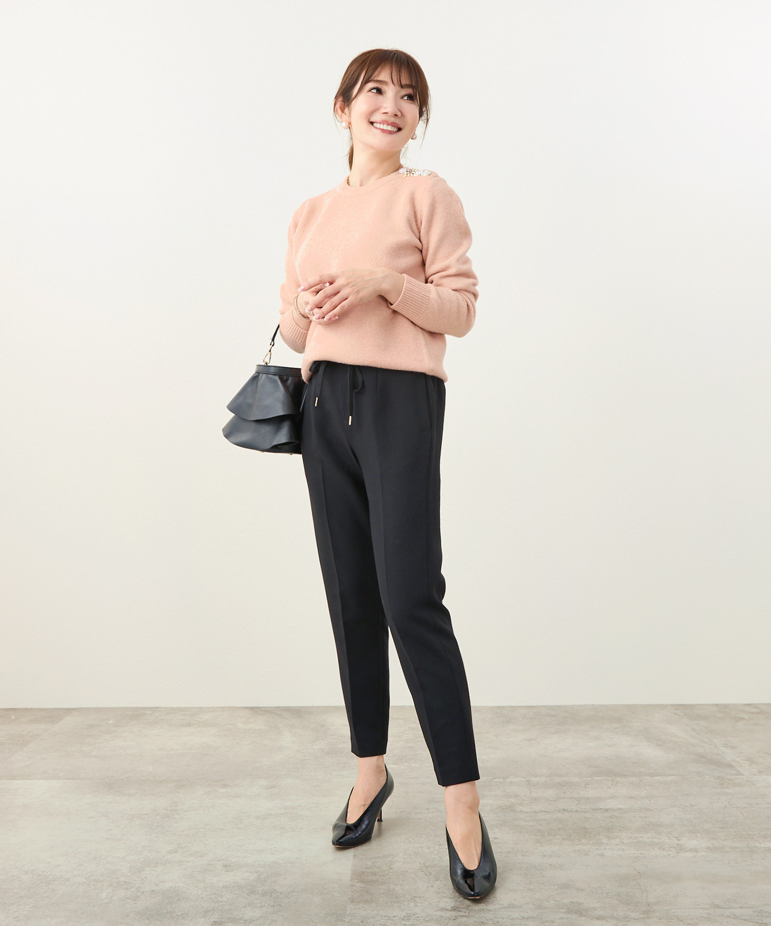 • このとき、靴はベージュまたはメタリックにすると、下半身の重さが引き算され、低身長さんでもすっきり見えます。