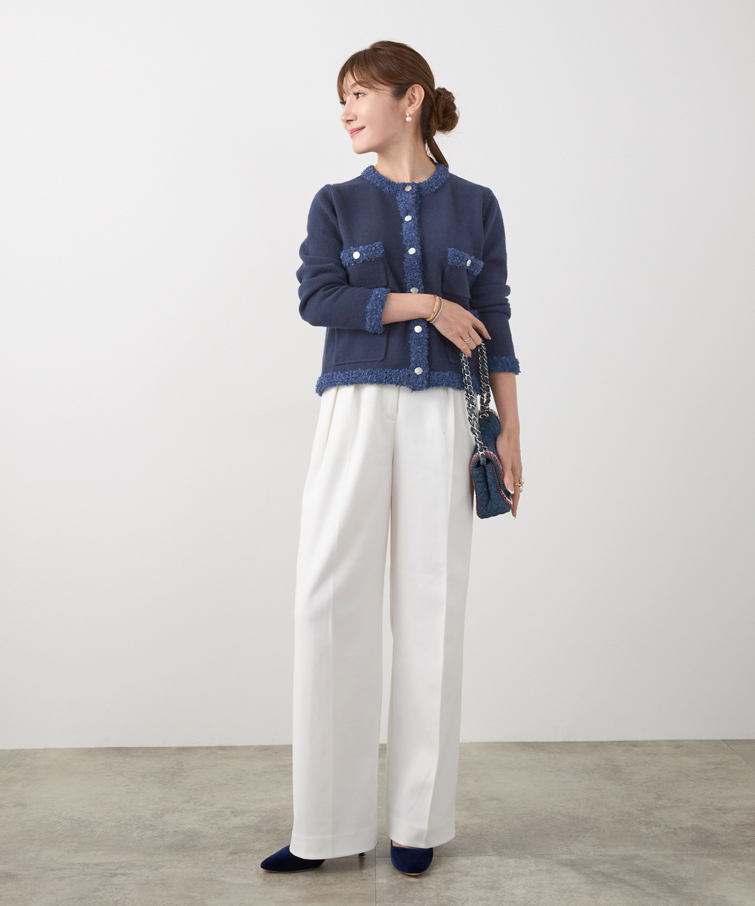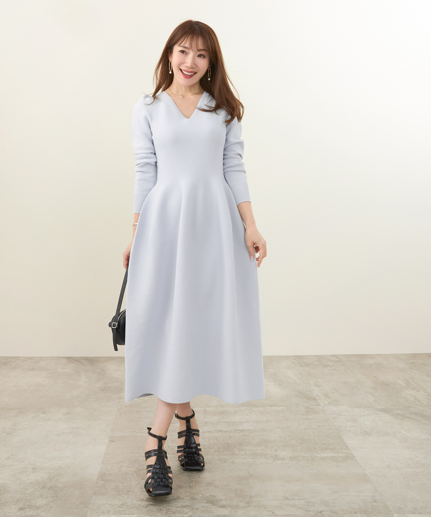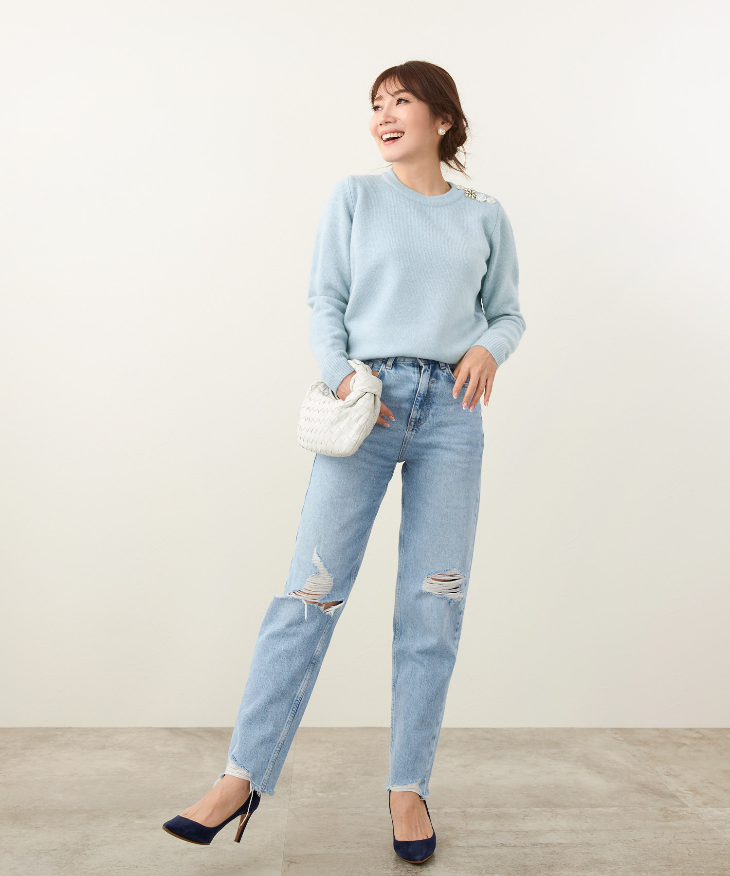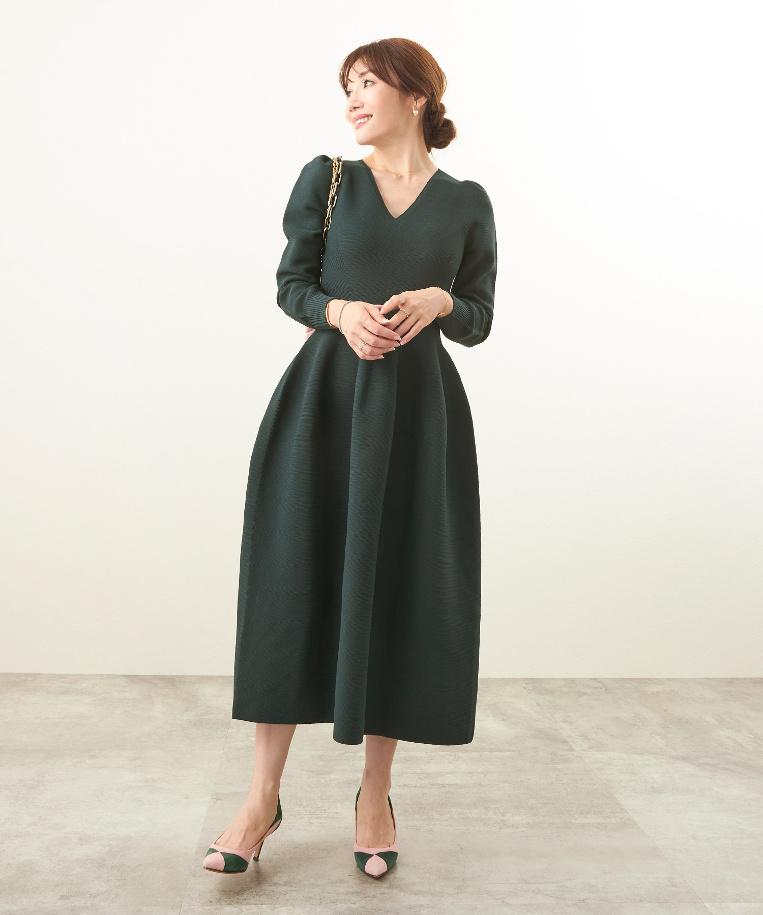 • このとき、靴はベージュまたはメタリックにすると、下半身の重さが引き算され、低身長さんでもすっきり見えます。