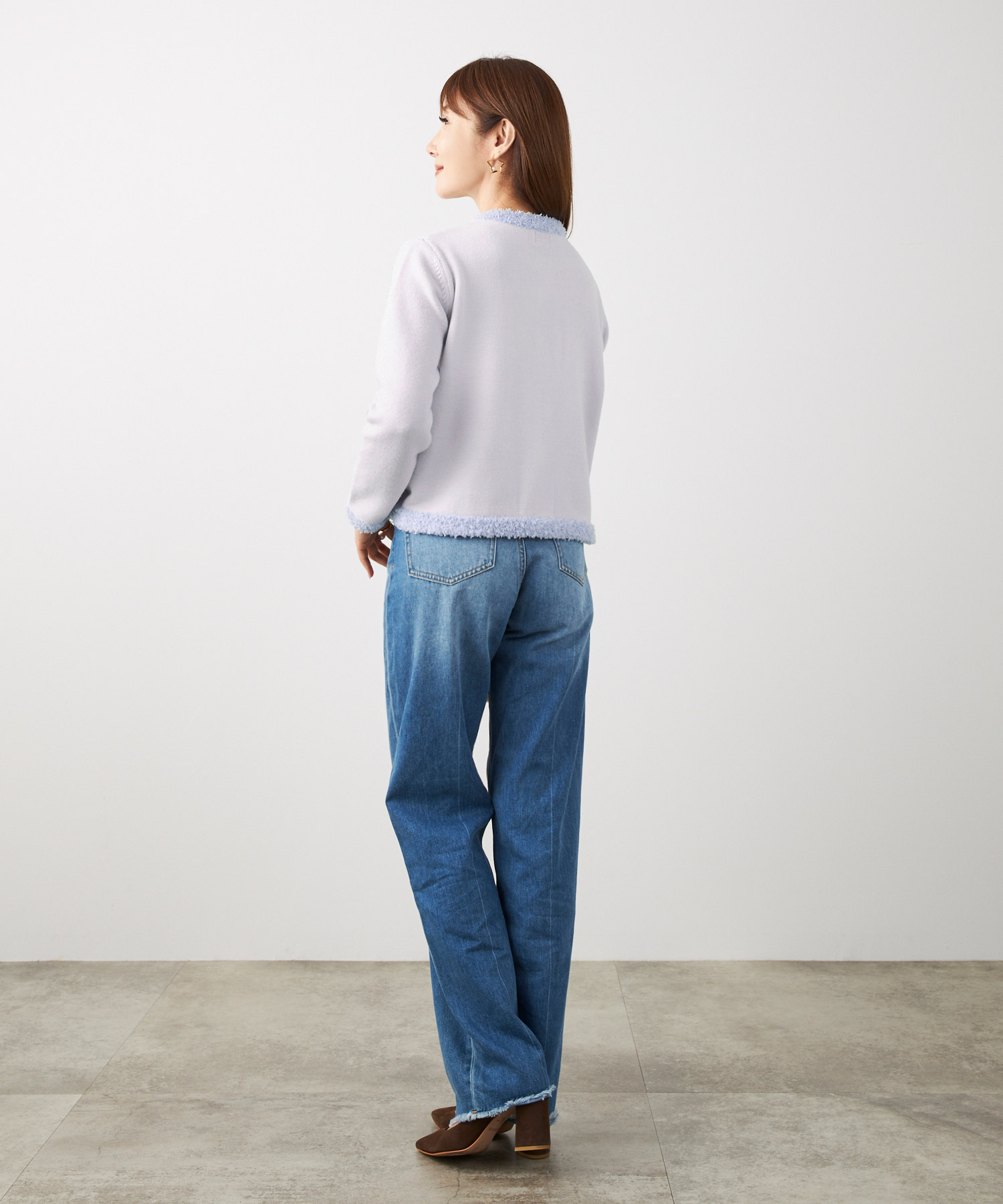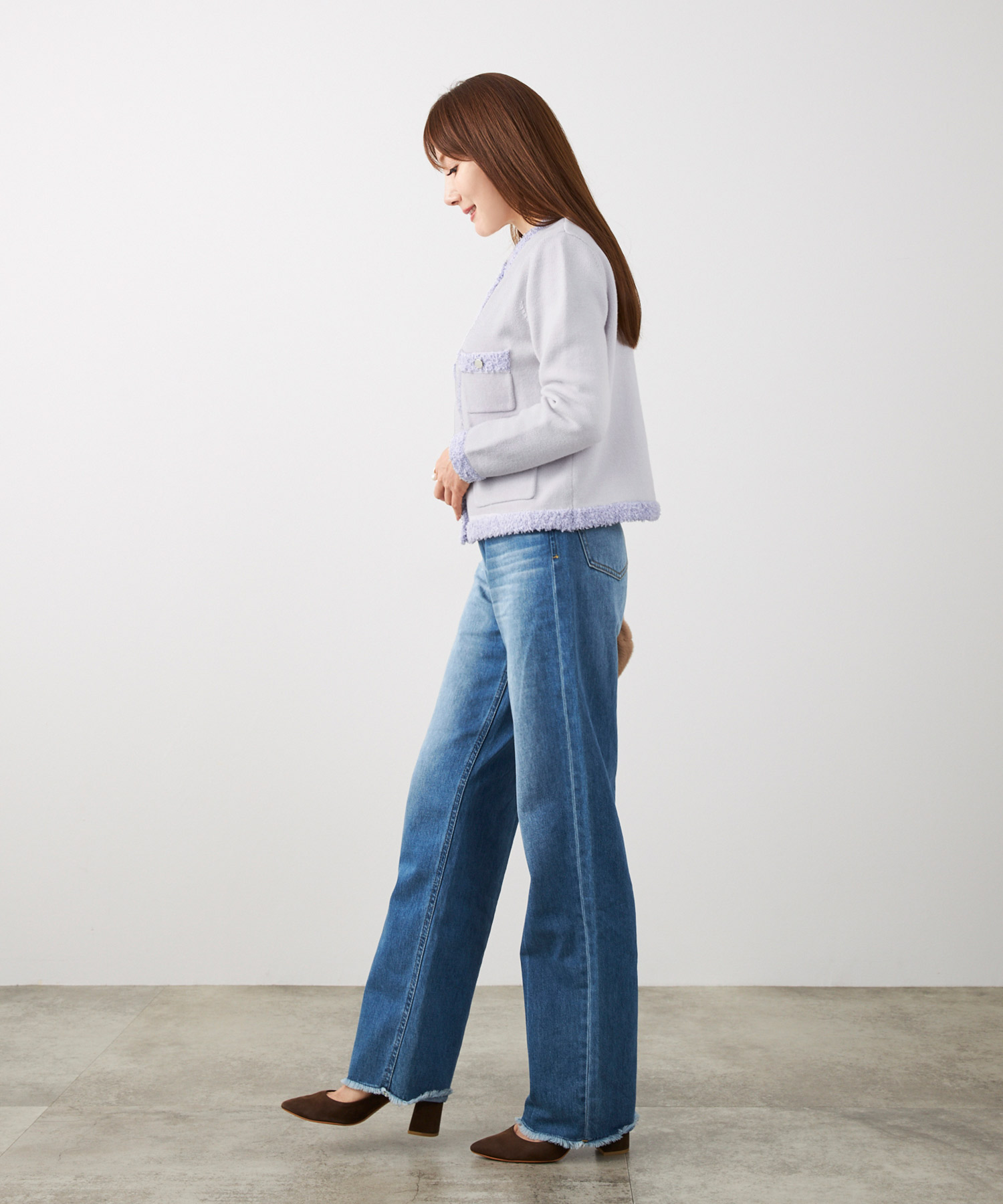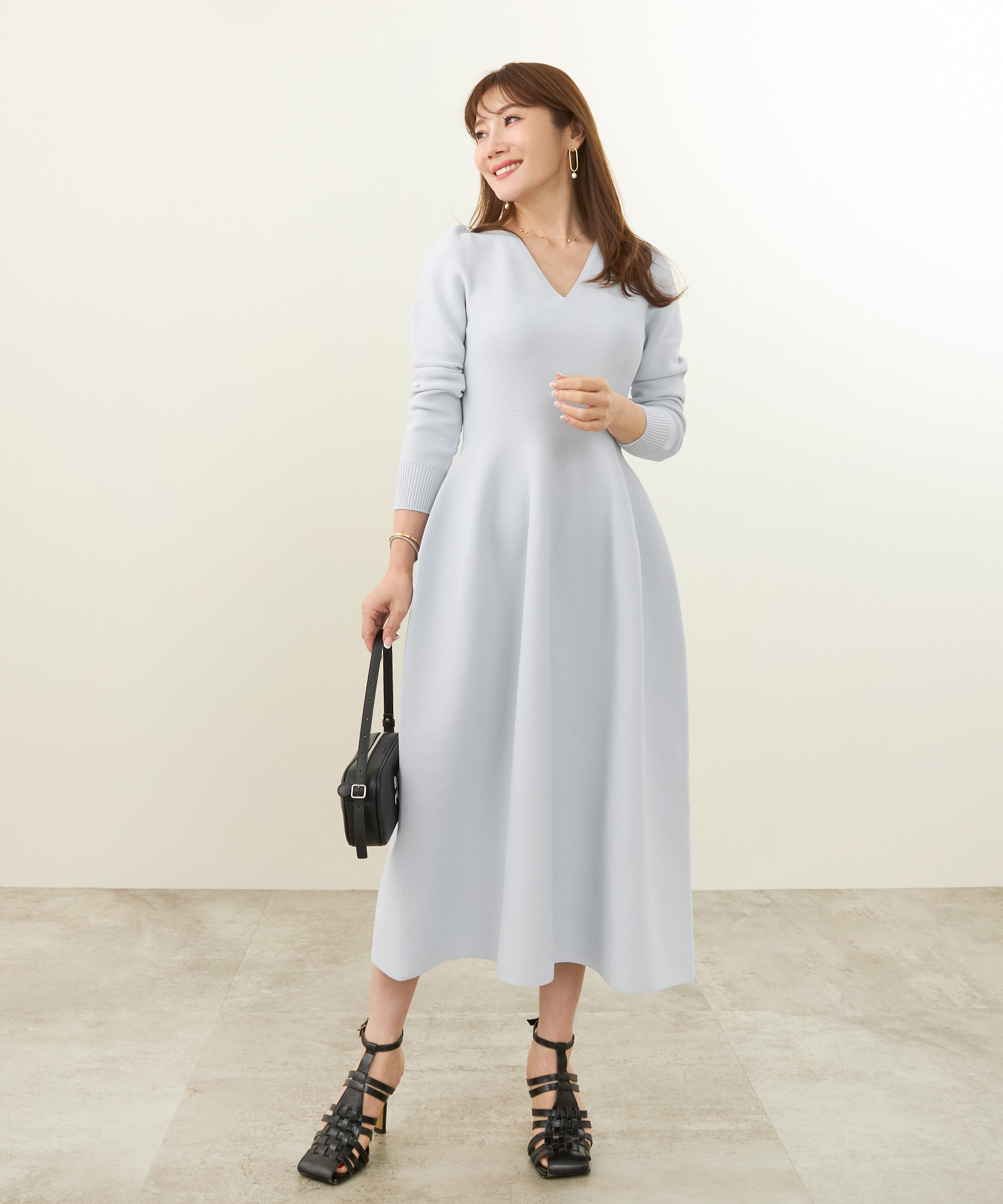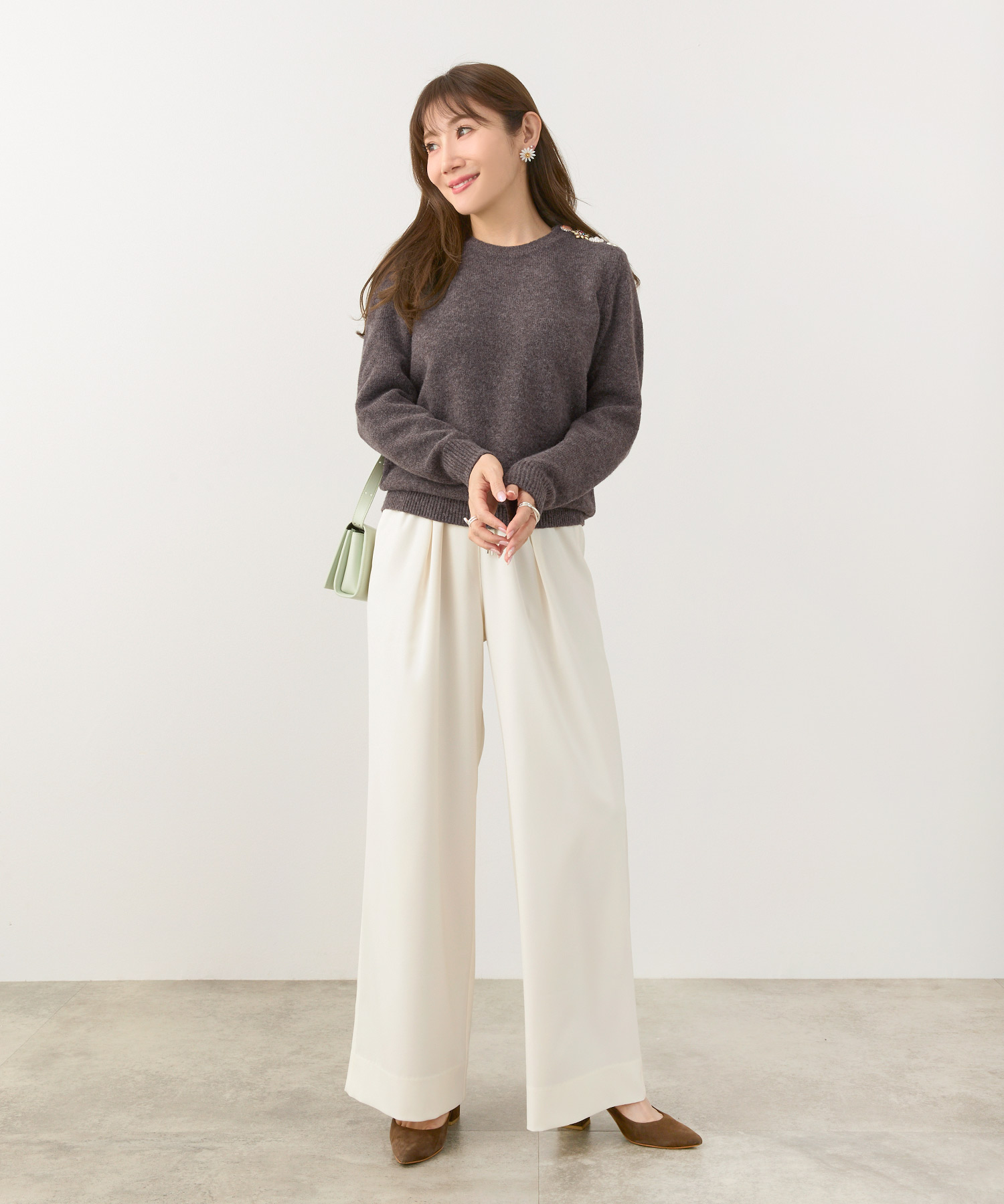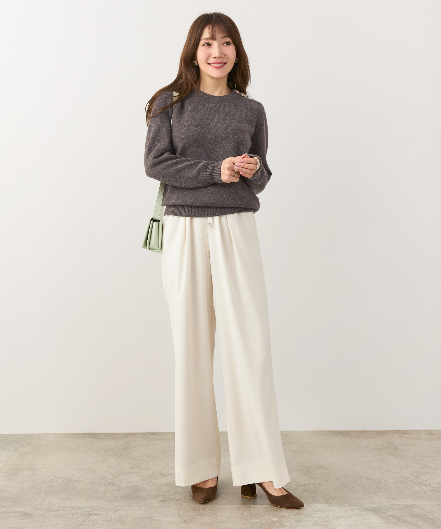 • ライトグレーのニットやカーディガンは、ブラウンの温かみと相性がよく、ベージュほど甘くならずに、きちんと感を出したい日に便利です。
