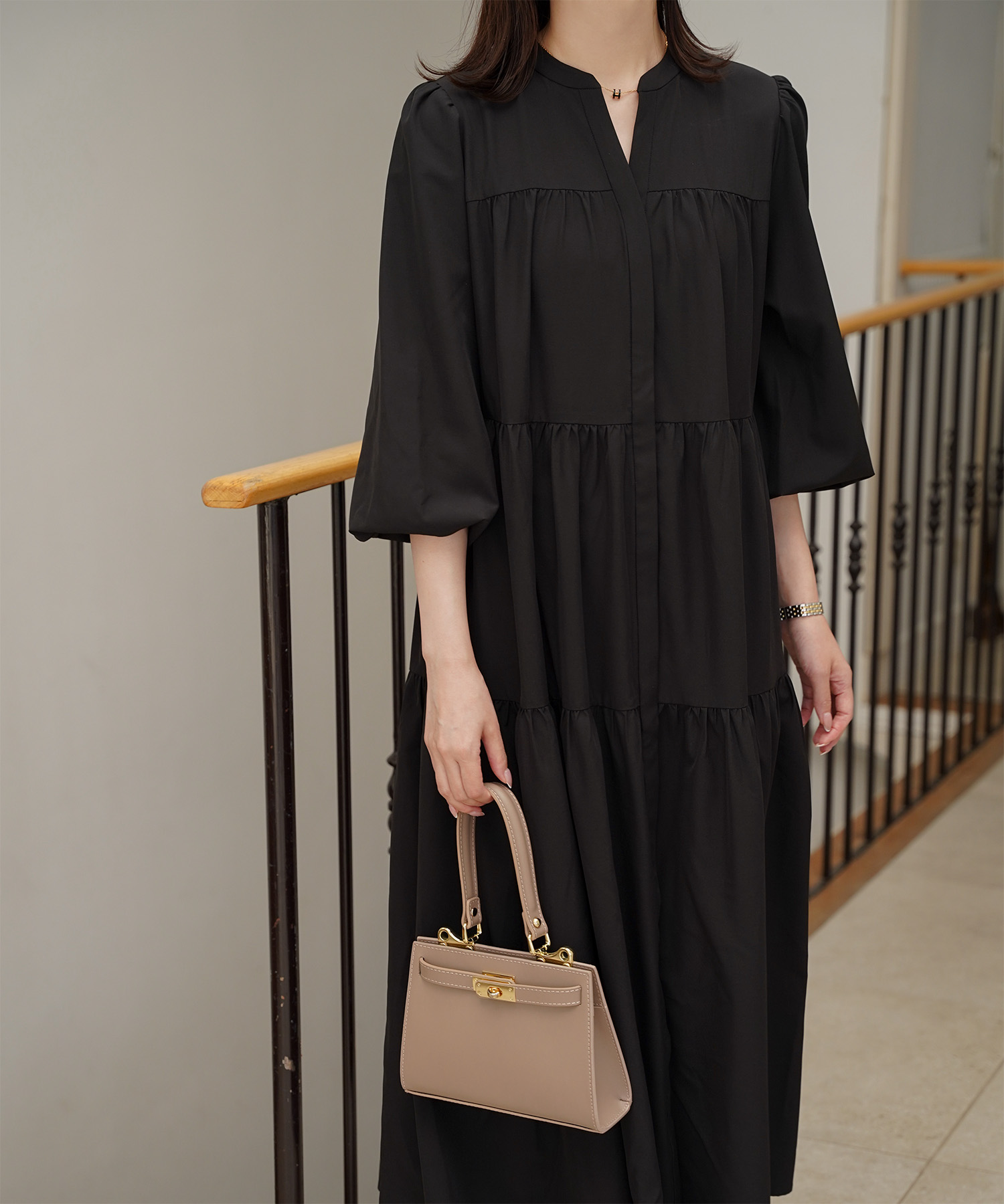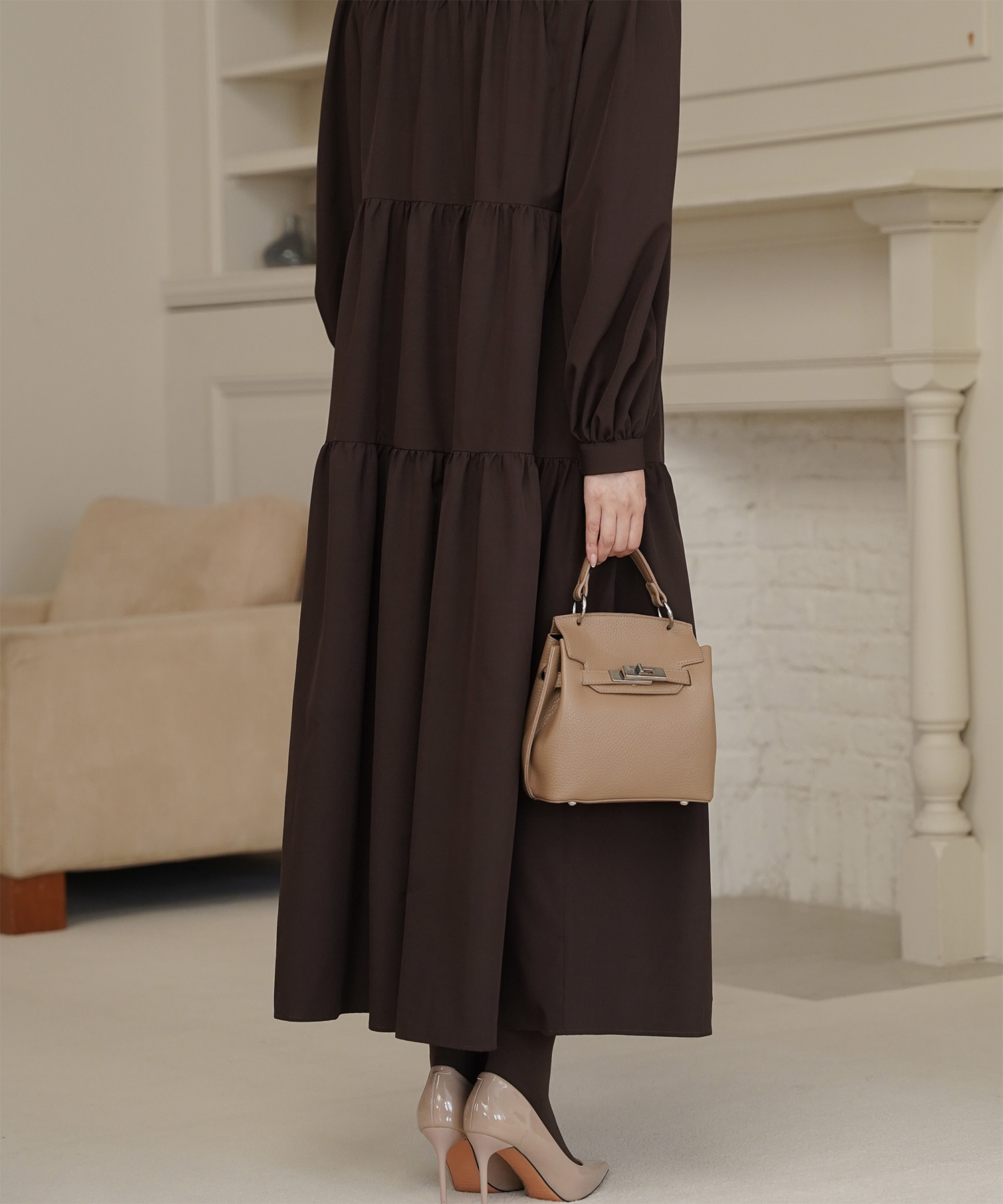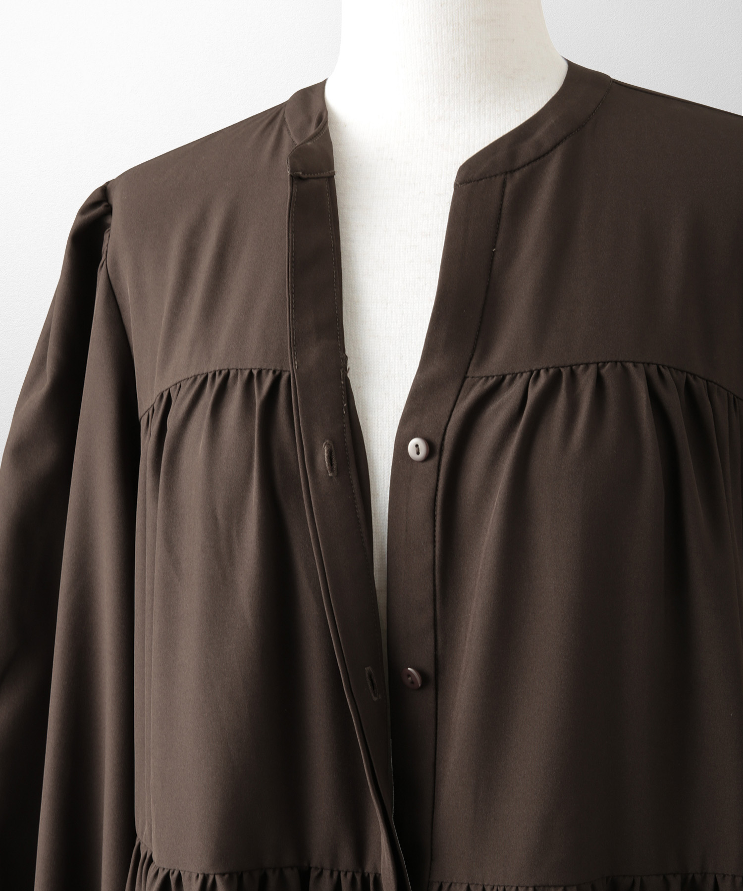 ブラウンのティアードワンピースは、歩くたびに揺れる裾が大人っぽく華やかな一枚。とろみのある軽やかな素材がふんわりAラインをつくり、気になる腰まわりやヒップもさりげなくカバーしてくれます。バンドカラーとV開きのネックラインで、ブラウンでも顔まわりはすっきり。一枚で「きちんと感」とリラクシーさを両立できる、秋口から春まで頼れるご褒美ワンピースです。