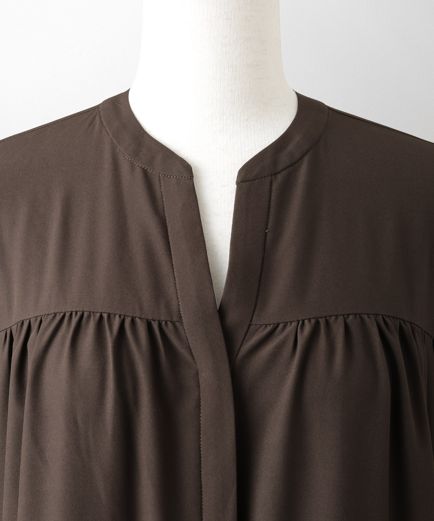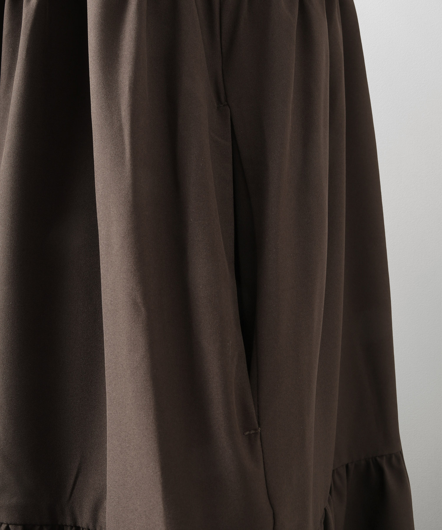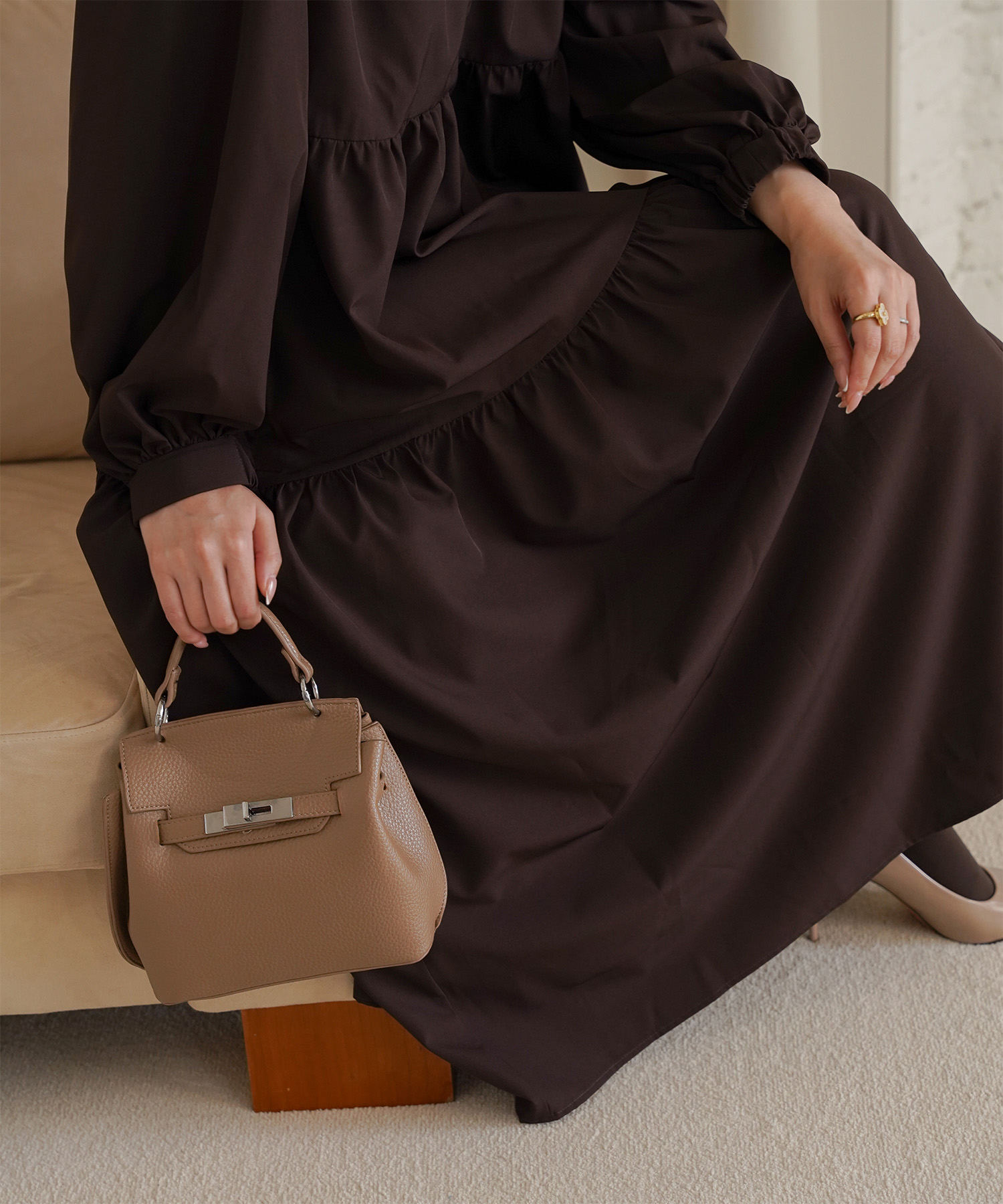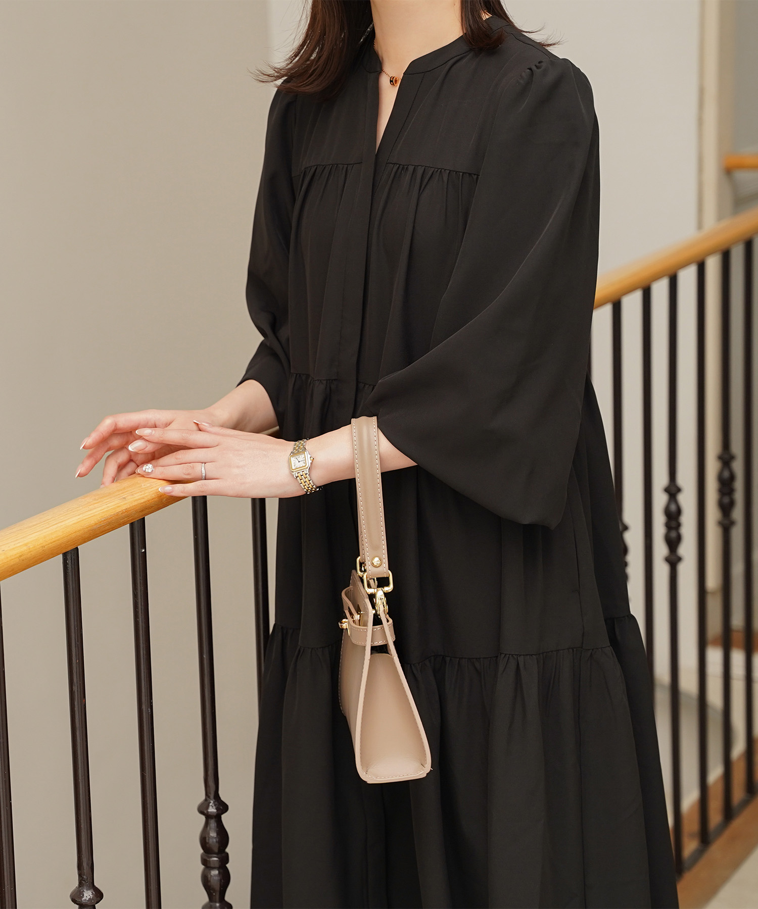 ブラウンのティアードワンピースは、歩くたびに揺れる裾が大人っぽく華やかな一枚。とろみのある軽やかな素材がふんわりAラインをつくり、気になる腰まわりやヒップもさりげなくカバーしてくれます。バンドカラーとV開きのネックラインで、ブラウンでも顔まわりはすっきり。一枚で「きちんと感」とリラクシーさを両立できる、秋口から春まで頼れるご褒美ワンピースです。