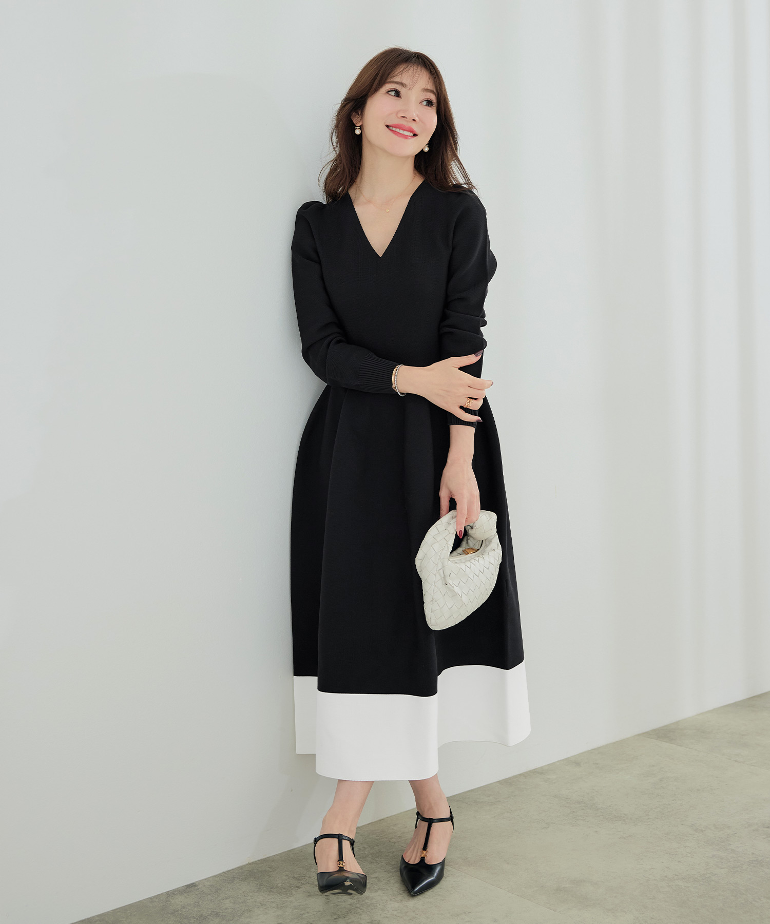 エコヴェロ ステッチ Vネック バイカラー ニット ワンピース(Liala×PG) ¥10,450(税込)