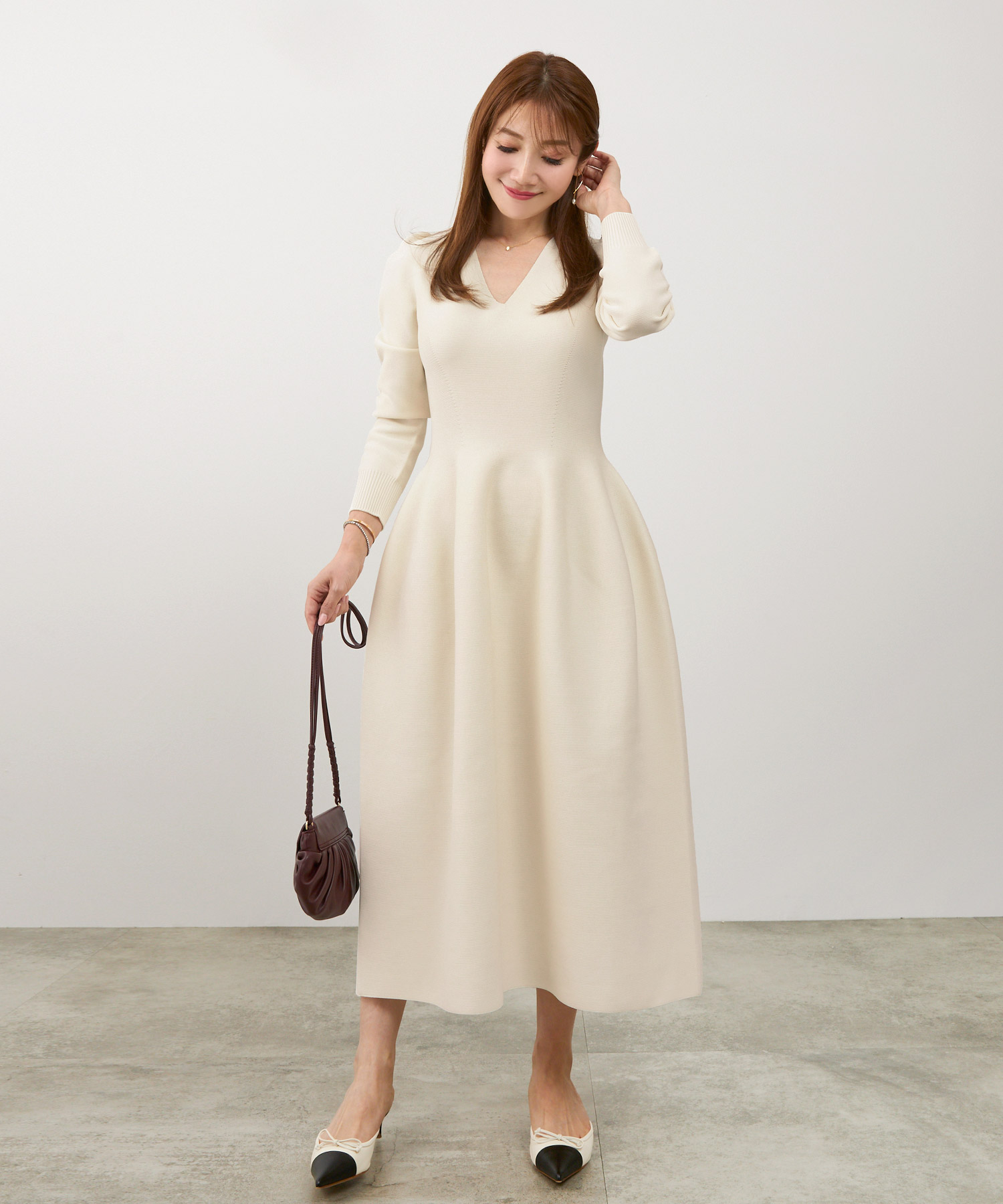 春夏は、ニットを薄手に、サテンやとろみ素材を軽やかなものにすることで、風が通るような軽さを演出できます。秋冬は、ニットを畦編みやリブなど表情のあるものにして、レザーバッグやブーツのツヤを強めると、暖かさときちんと感が同時に出せます。