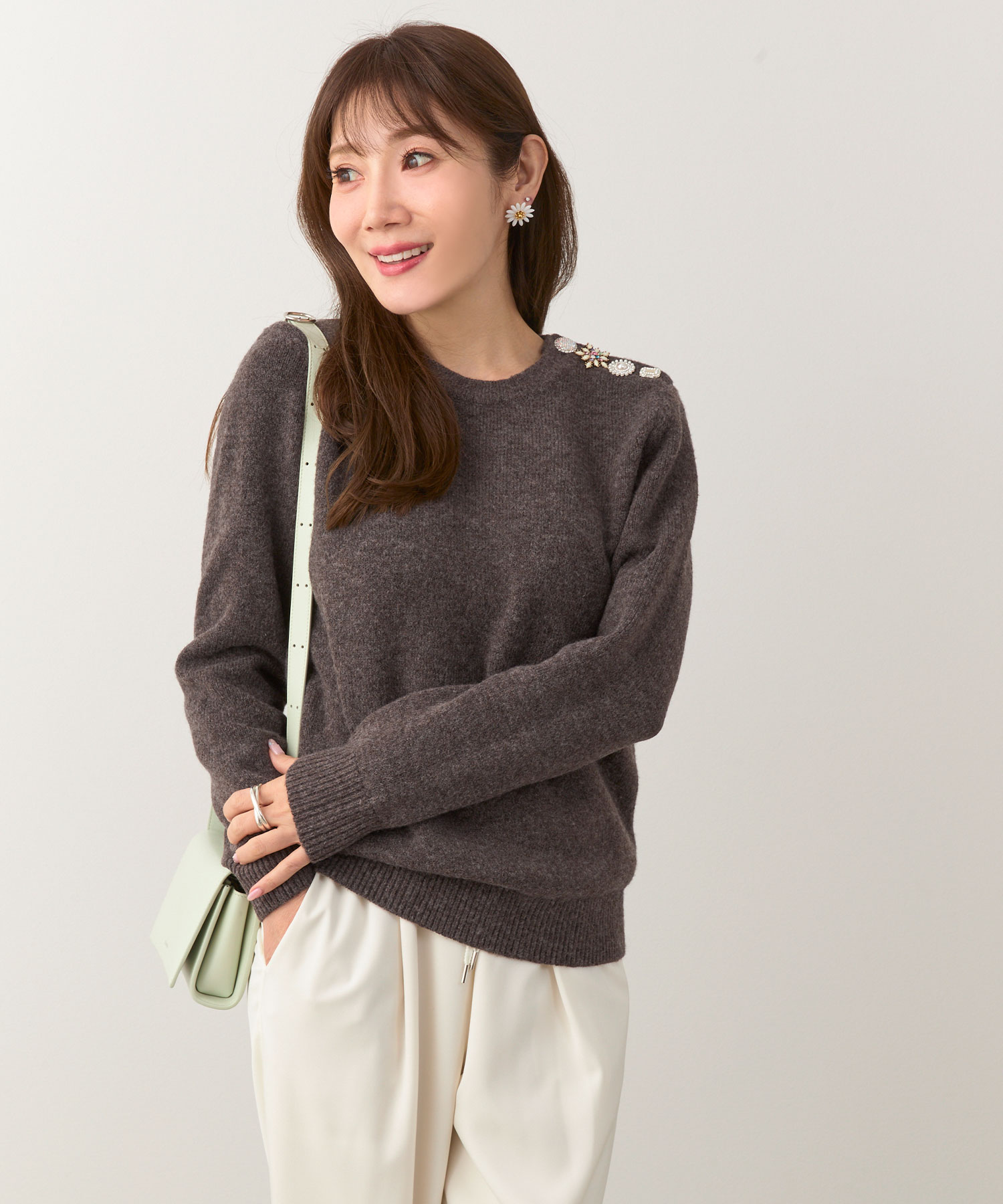 ブラウンのビジューニットは、肩にあしらったきらきらモチーフがさりげなく視線を集めてくれる一枚です。落ち着いたブラウンに輝きが映えて、いつものデニムやブラウンボトムに合わせてもぐっと華やかに。ふんわり柔らかなミドルゲージニットで、ボディラインを拾いにくく着心地も快適です。一枚で主役になりつつ、ジャケットやコートの中にも合わせやすい、冬のワードローブに加えたいブラウンニットです。