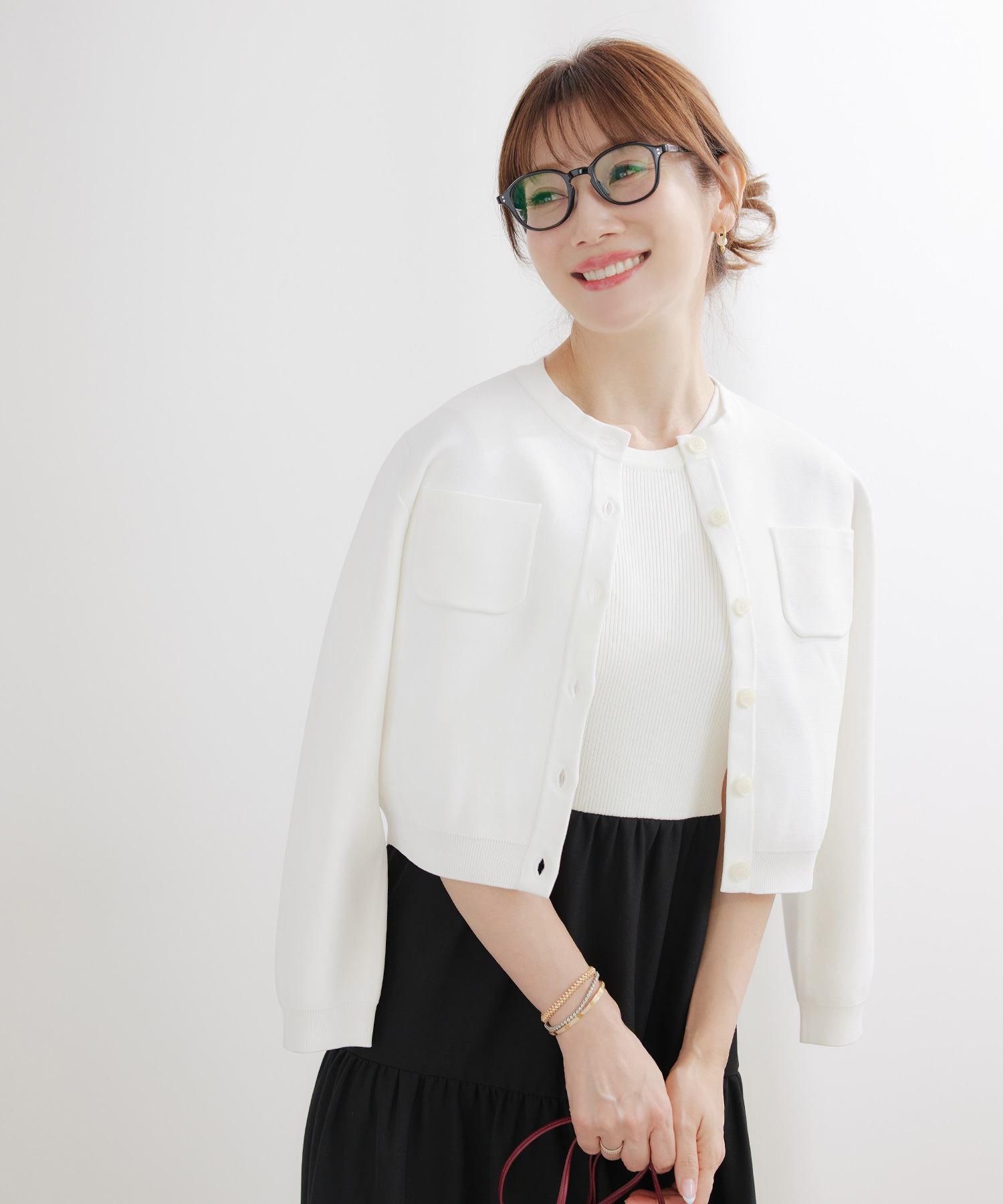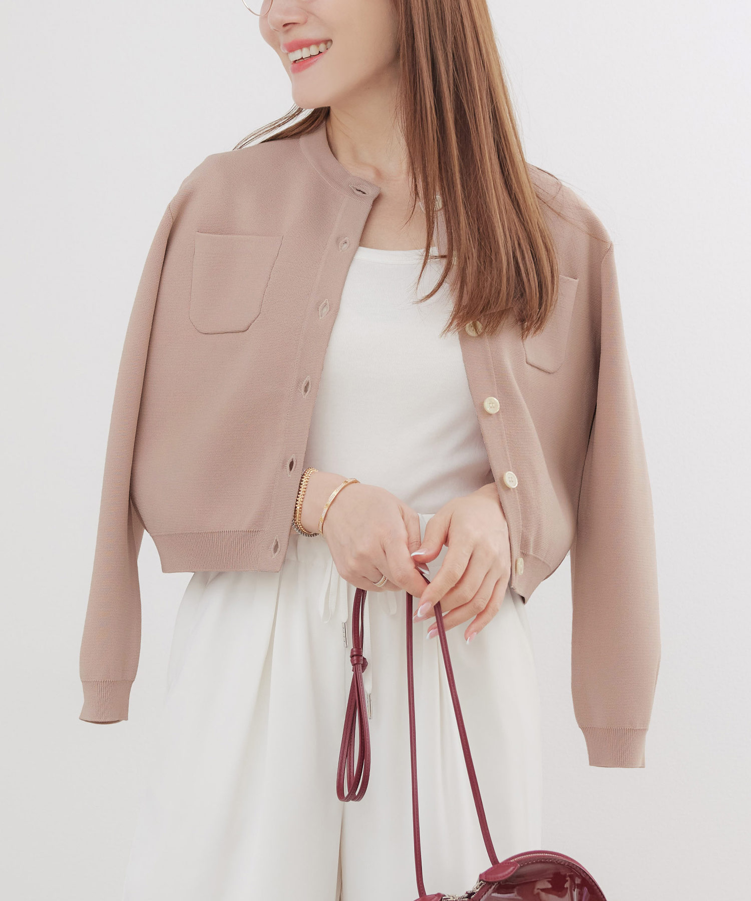 • PC作業や資料を手に持つ場面で、指先と一緒に「白」が視界に入ることで、全体がすっきり見え、ベージュのやさしさも生きてきます。