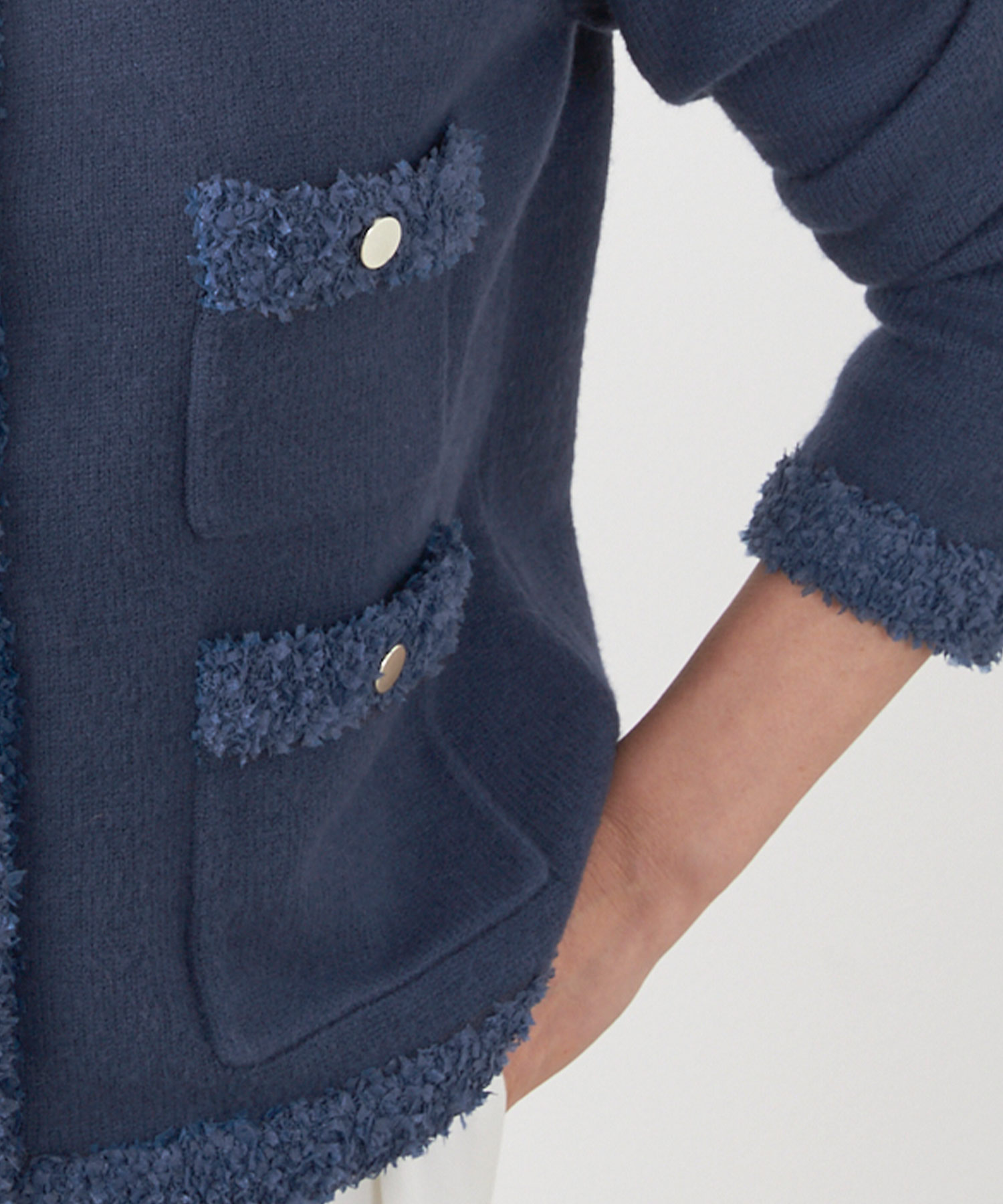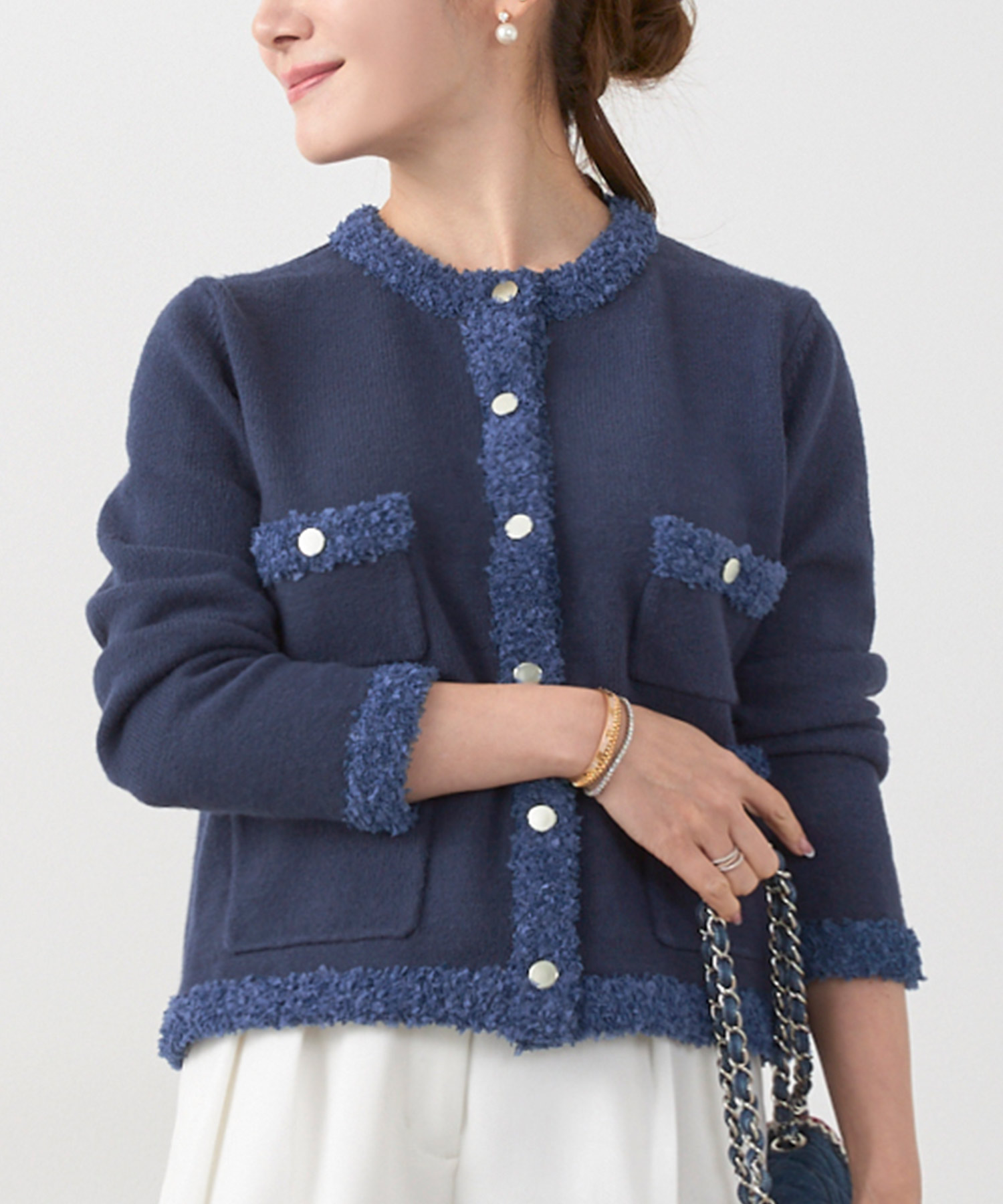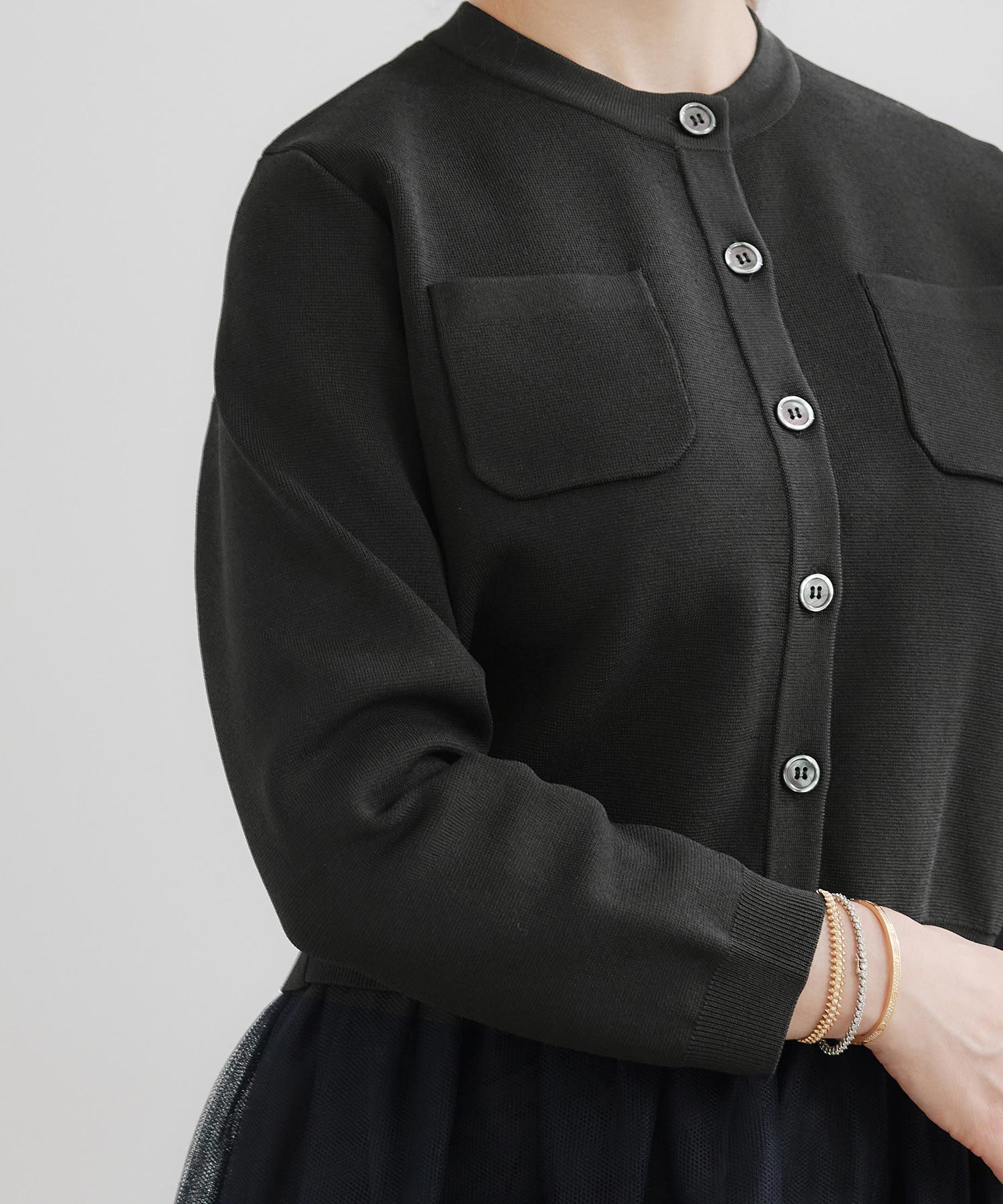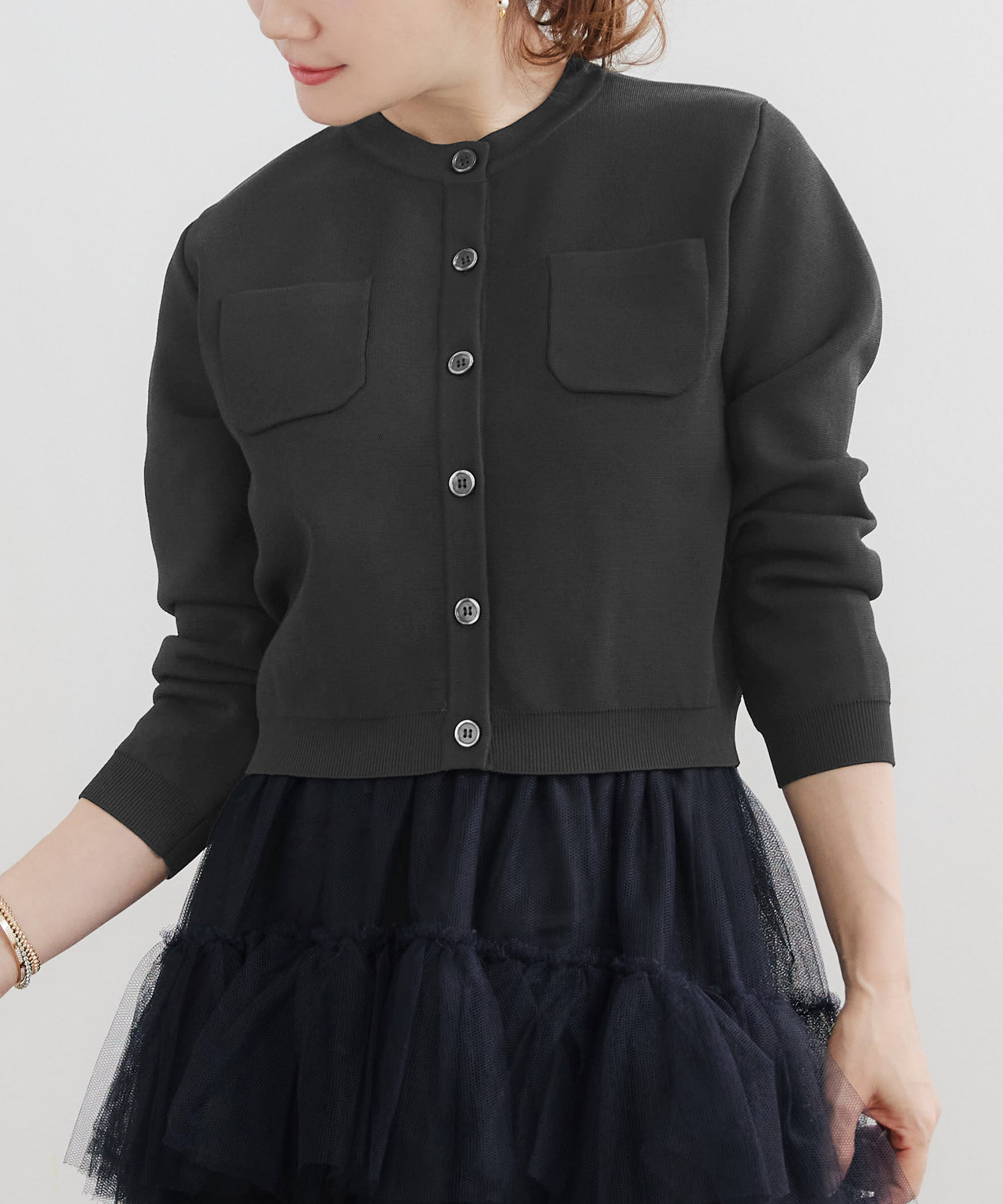 しっかりとしたミラノリブ編みで仕立てたカーディガンは、ほどよいハリ感がありつつ柔らかな着心地が魅力です。コンパクトなショート丈なので、ロングスカートにもパンツスタイルにもバランスよくマッチし、スタイルアップ効果も期待できます。フロントポケットがさりげないデザインポイントになり、デイリーからお仕事コーデまで幅広く活躍。ご自宅で手洗いできるので、つい出番が増えそうな一枚です。