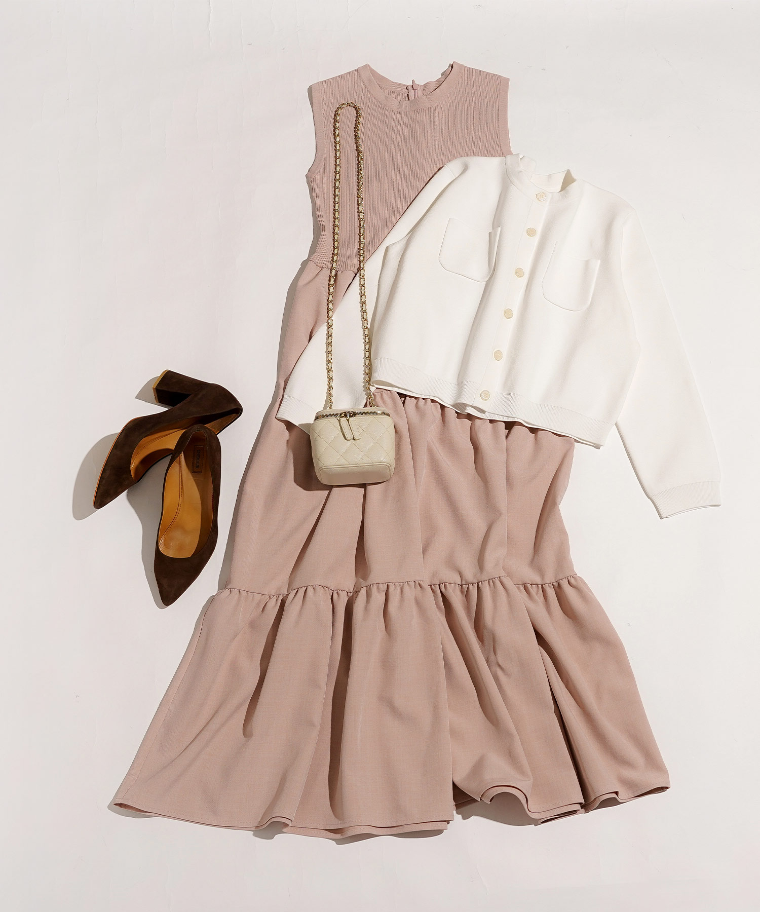 逆に、白のバッグを主役にしたい場合は、ベルトや靴はベージュ寄りで揃え、白バッグが目線を引き寄せるように配置します。