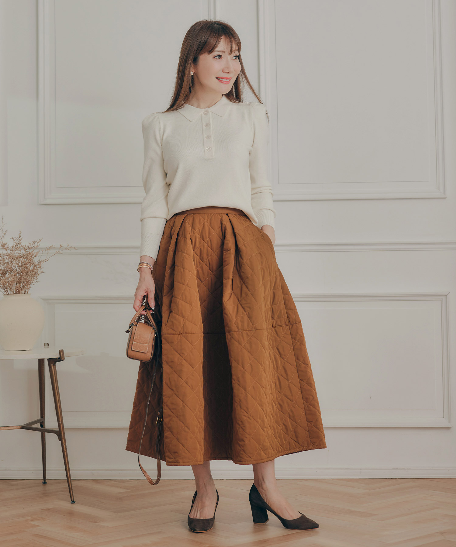 • 黒のニットやブラウスを合わせると、上半身にしっかりとした軸が生まれ、明るいベージュスカートがふわっと軽さを演出してくれます。