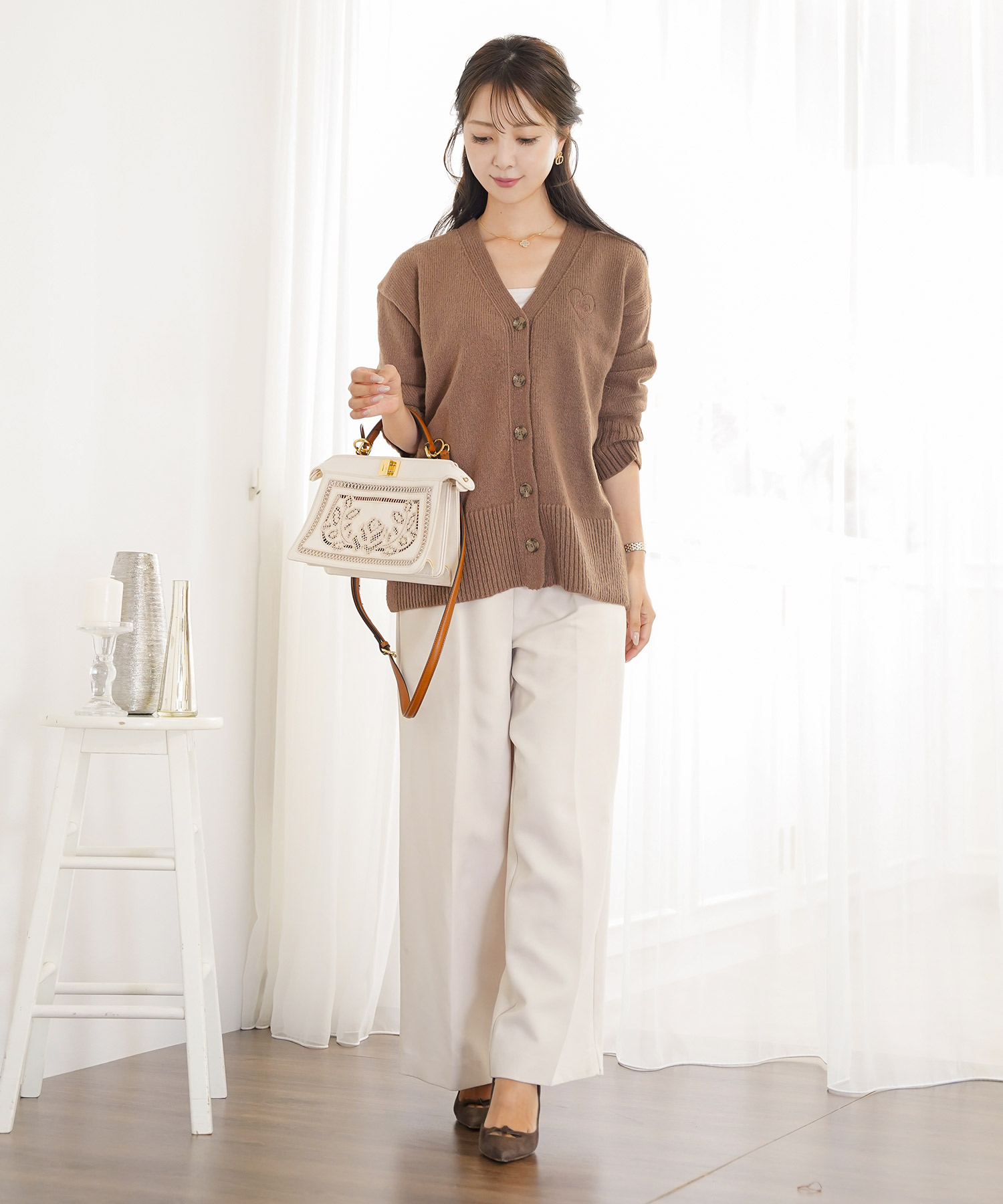 低身長さんの場合も、この「上を明るく・下を濃く」の2:1ルールは有効です。上半身に明るいベージュを多めに集めることで、重心が上がり、実際の身長よりも目線が高く感じられます。トップス+羽織をどちらも明るめベージュにして、ボトムだけを濃いブラウンにするイメージです。鏡の前で、上半身の方が“面積が多い”と感じるくらいがちょうど良いバランスになります。