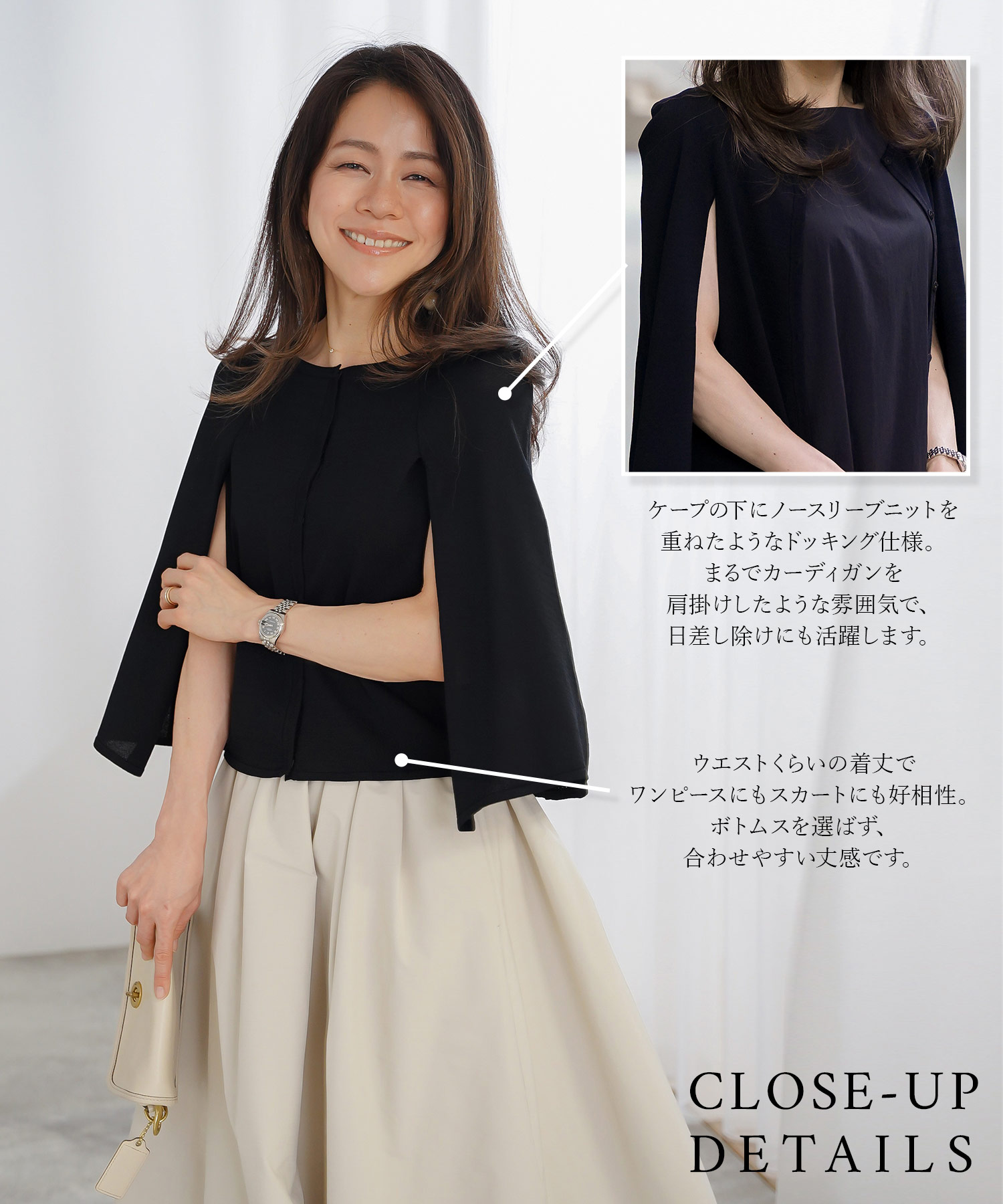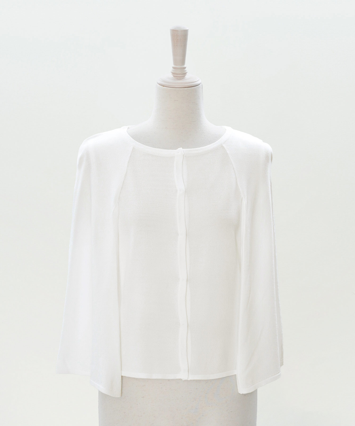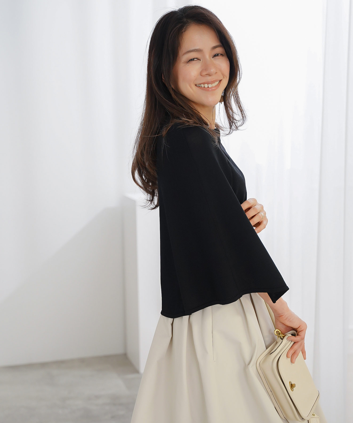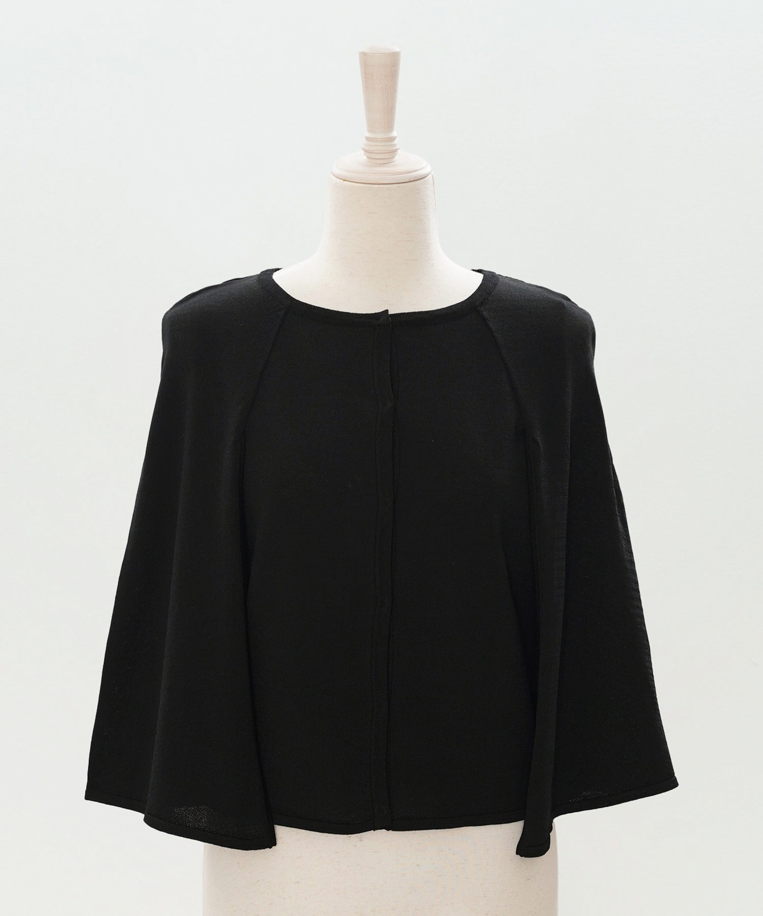 ジャケットなしでも上品に整えたい日に取り入れやすい、ケープデザインのニットカーディガンです。肩にふわりとかかるようなシルエットがやわらかな印象を添えつつ、きれいめな雰囲気をキープしやすいのが魅力。羽織りとしてはもちろん、トップス感覚でも着こなしやすく、春秋の気温差が気になる日や、冷房対策をしたい場面にも活躍してくれる一枚です。
